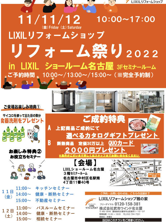 11月11日(金)12日(土)リフォーム祭り2022 inLIXILショールーム名古屋