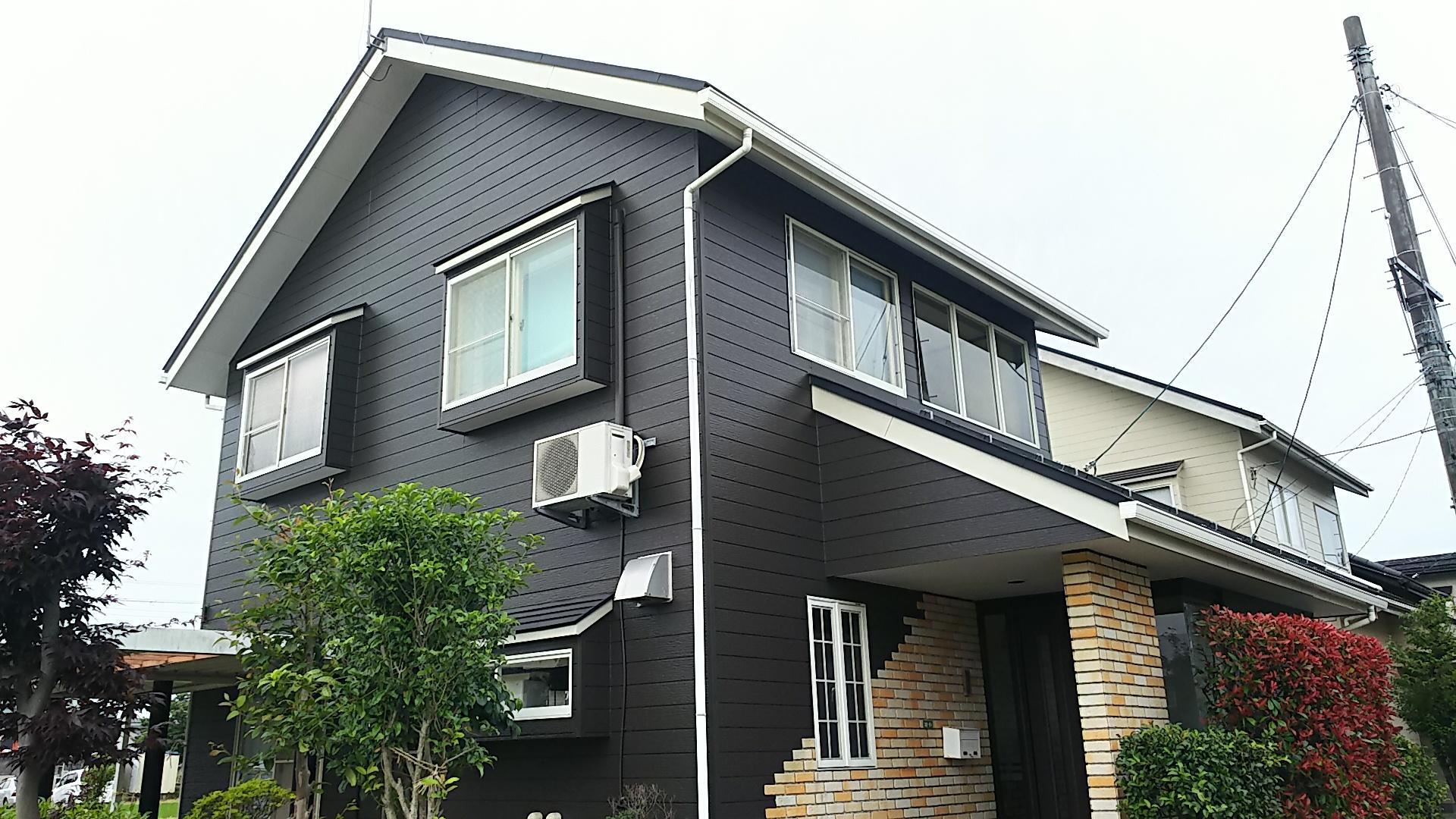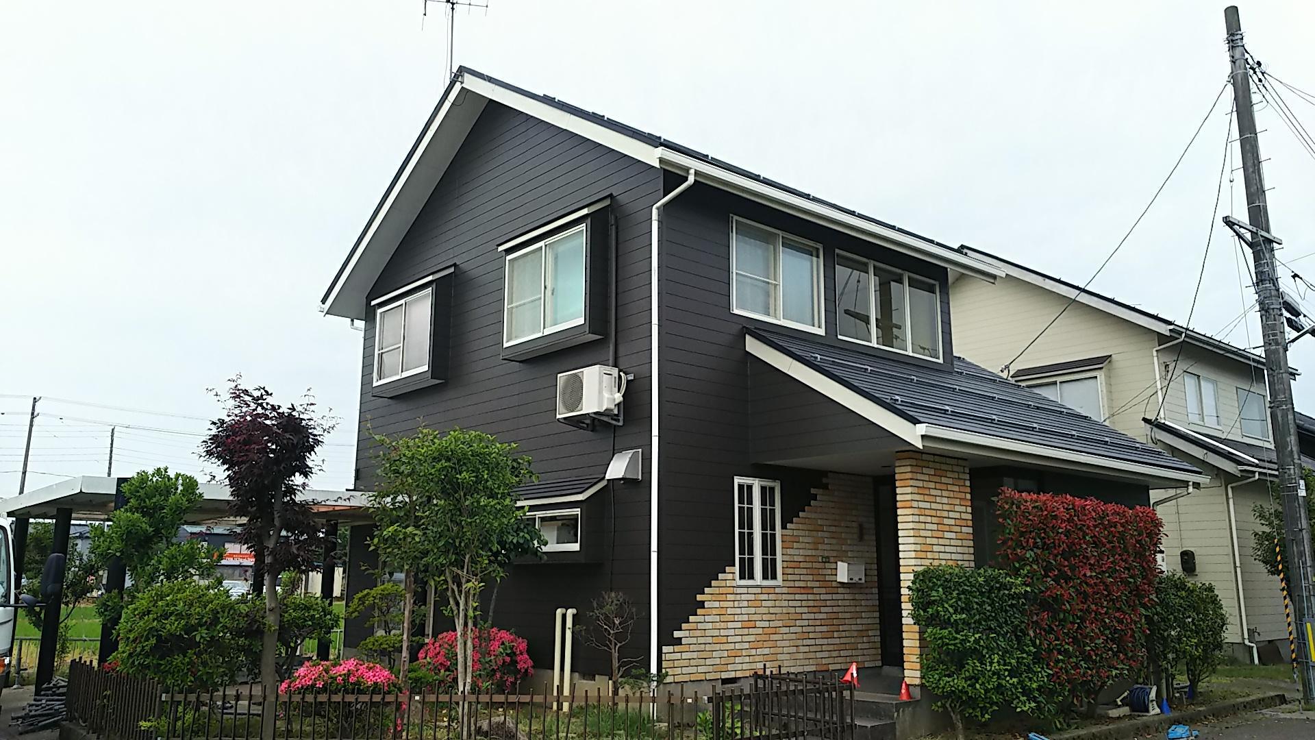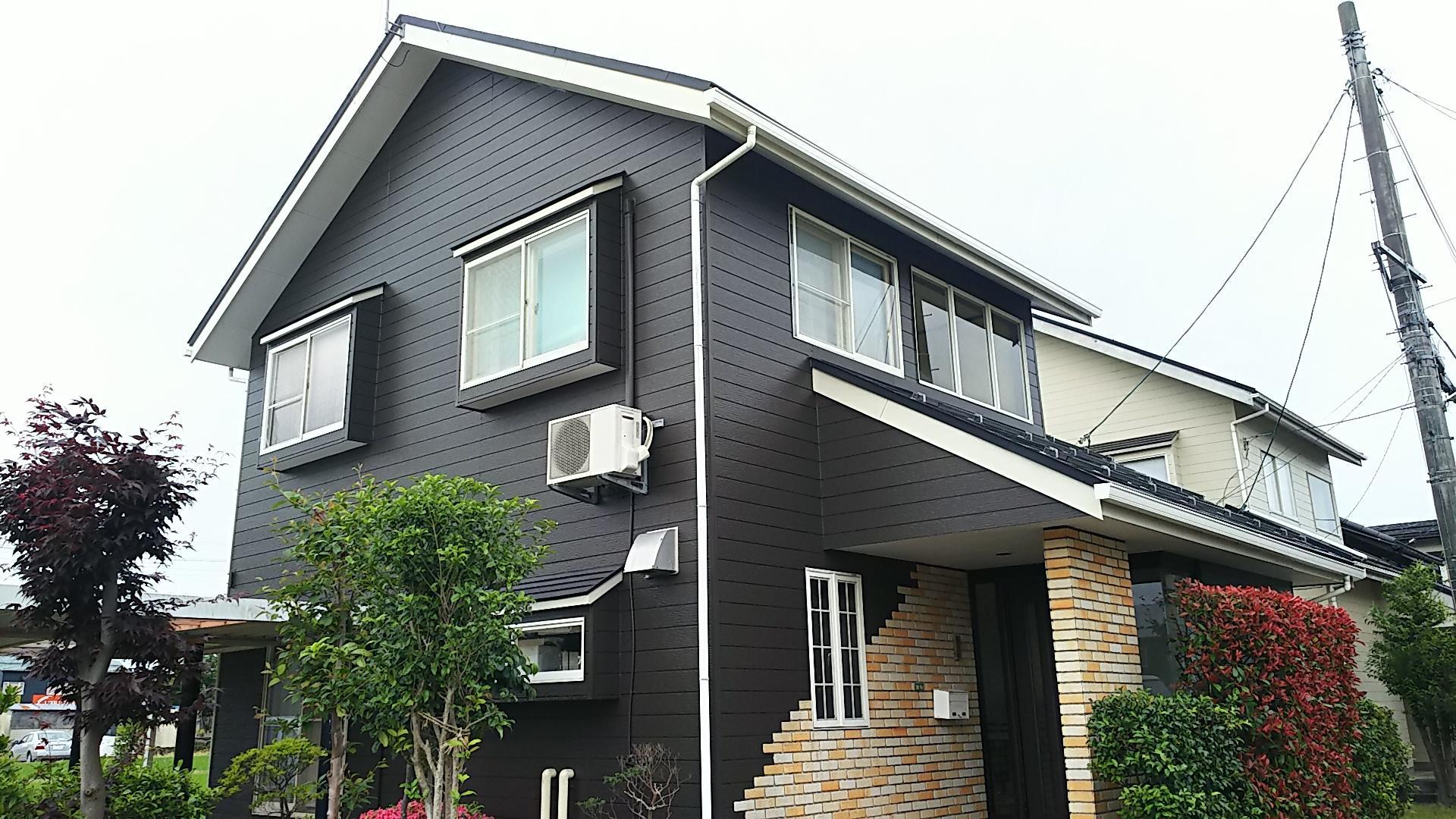 当初提案では外壁を張替えの想定で進めていましたが、屋根を含めた相対的な予算考慮と劣化度をふまえ、優先順位を考慮した結果、屋根は新たな素材・外壁は塗装という選択を提案して工事をさせてもらいました。ブルー系のイメージから一新し、モダンな雰囲気にする事で落ち着いた外装に仕上がりました。