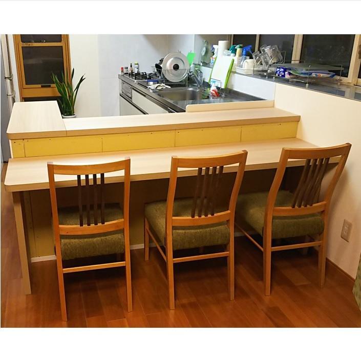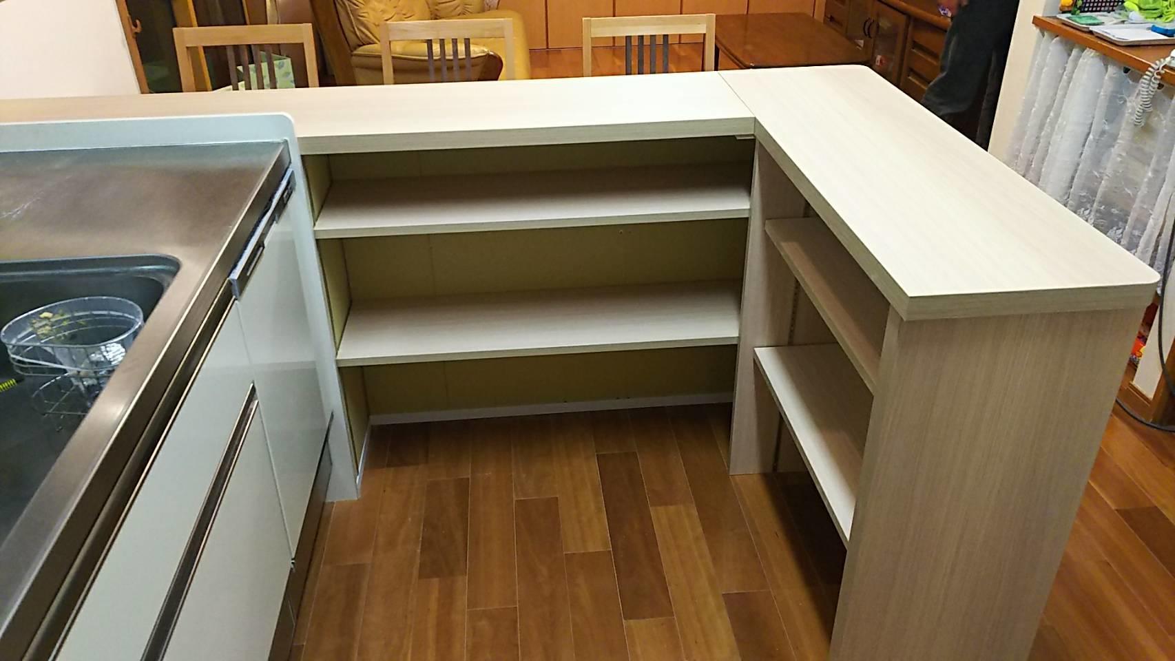 作業台カウンターをL字型にすることで、キッチン側から使用する