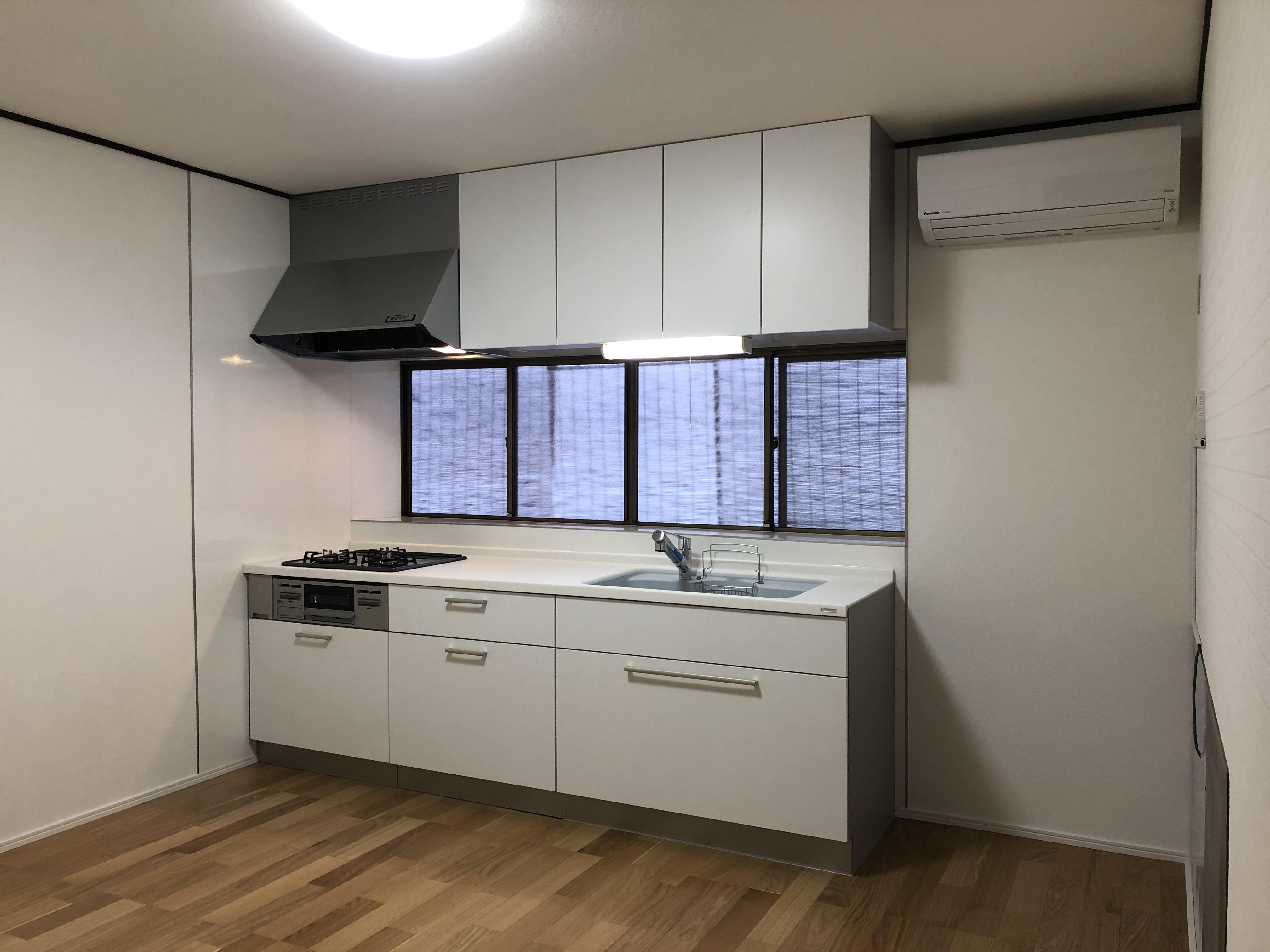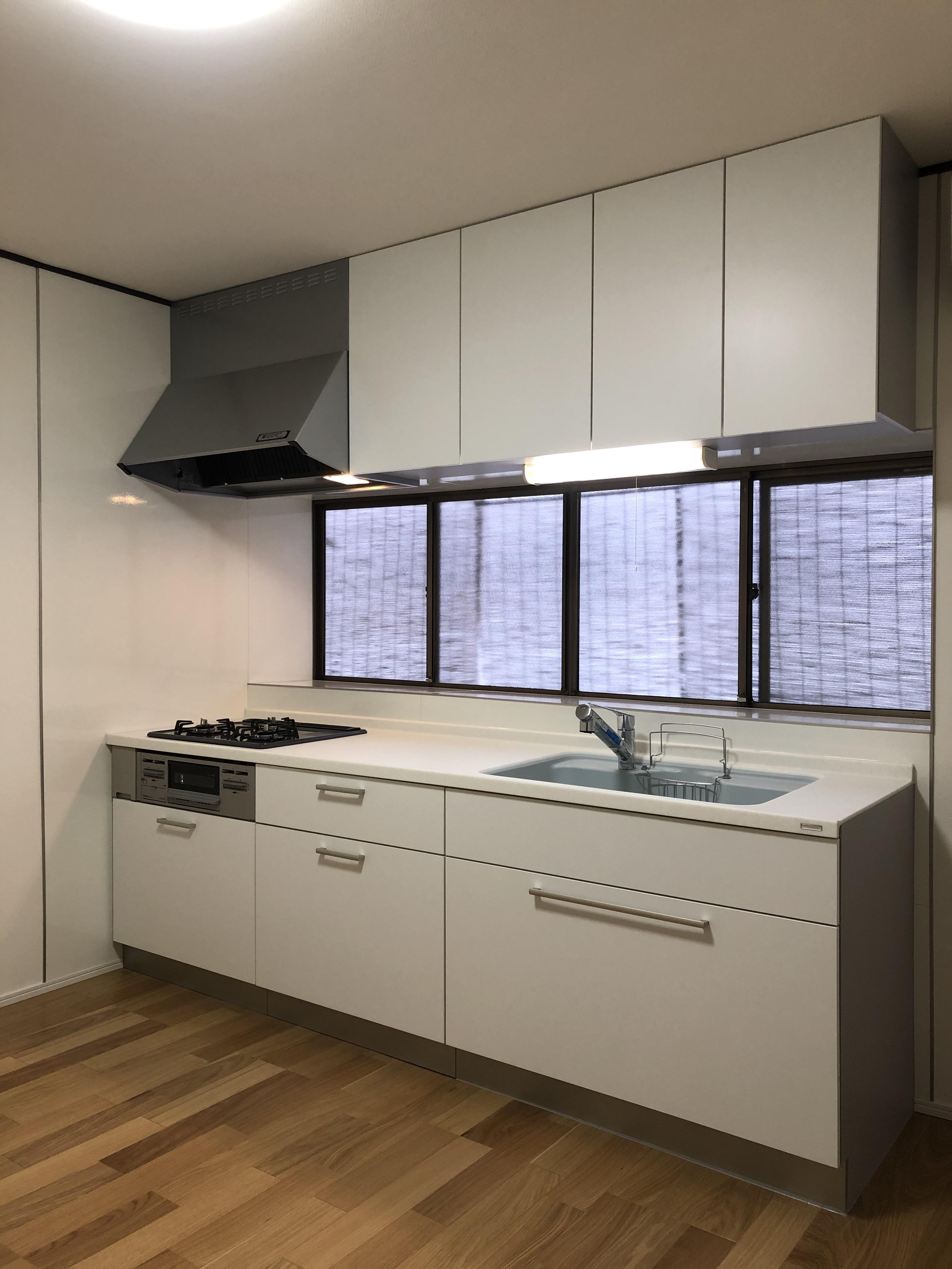 この度のキッチンスペースのリフォーム工事は、ほぼ解体を伴わないお化粧リフォーム中心。 内装は既存の仕上げの上からなので、現状の不陸が目立たないような素材、柄を採用しました。 またキッチンは入れ替えの為、床や壁の水平が、取りにくい環境での工事でしたので、 見えないヶ所での「調整」に苦労しましたが、予定してた内容と工期、予算内で納めることが出来て良かったです。