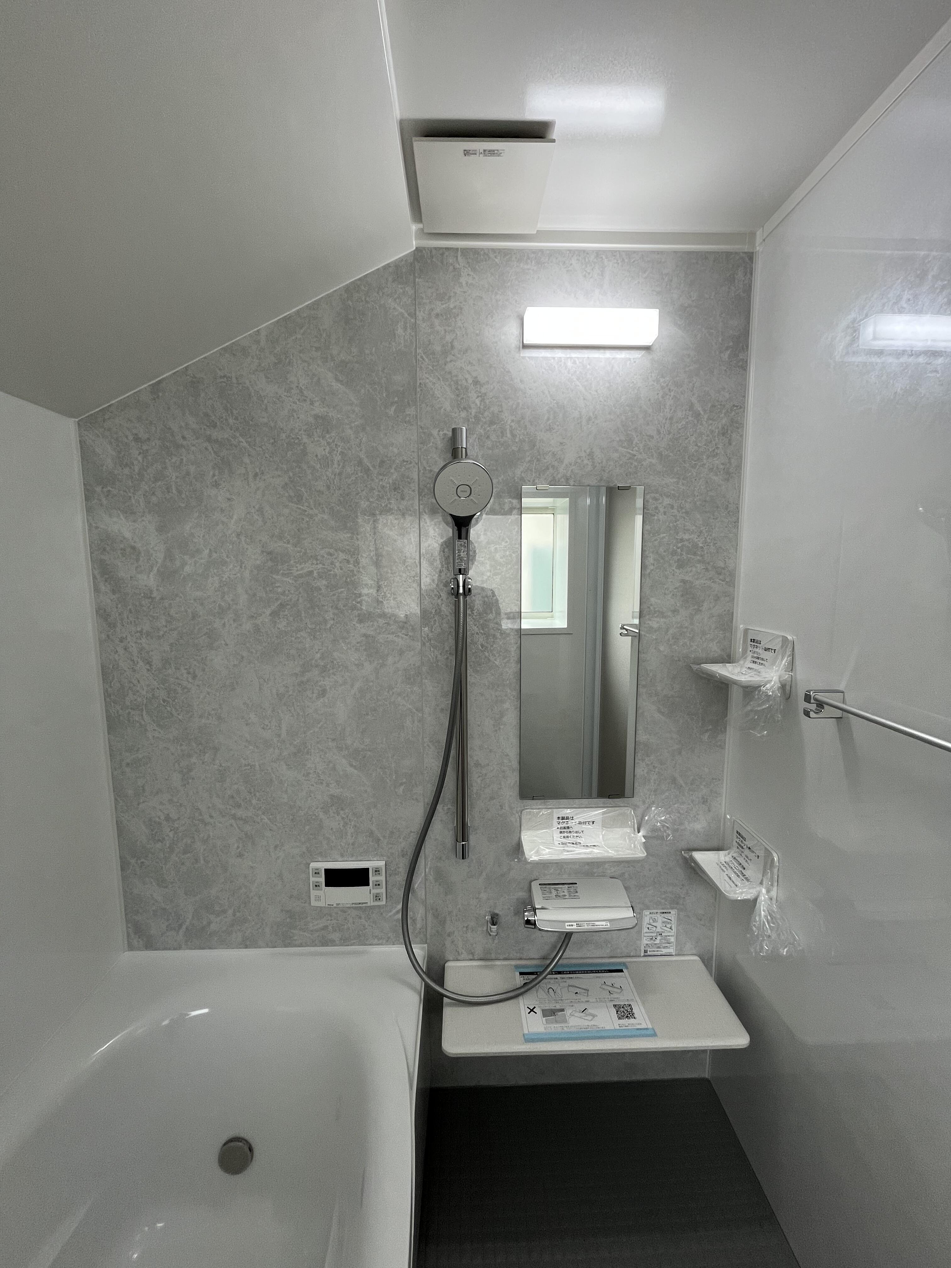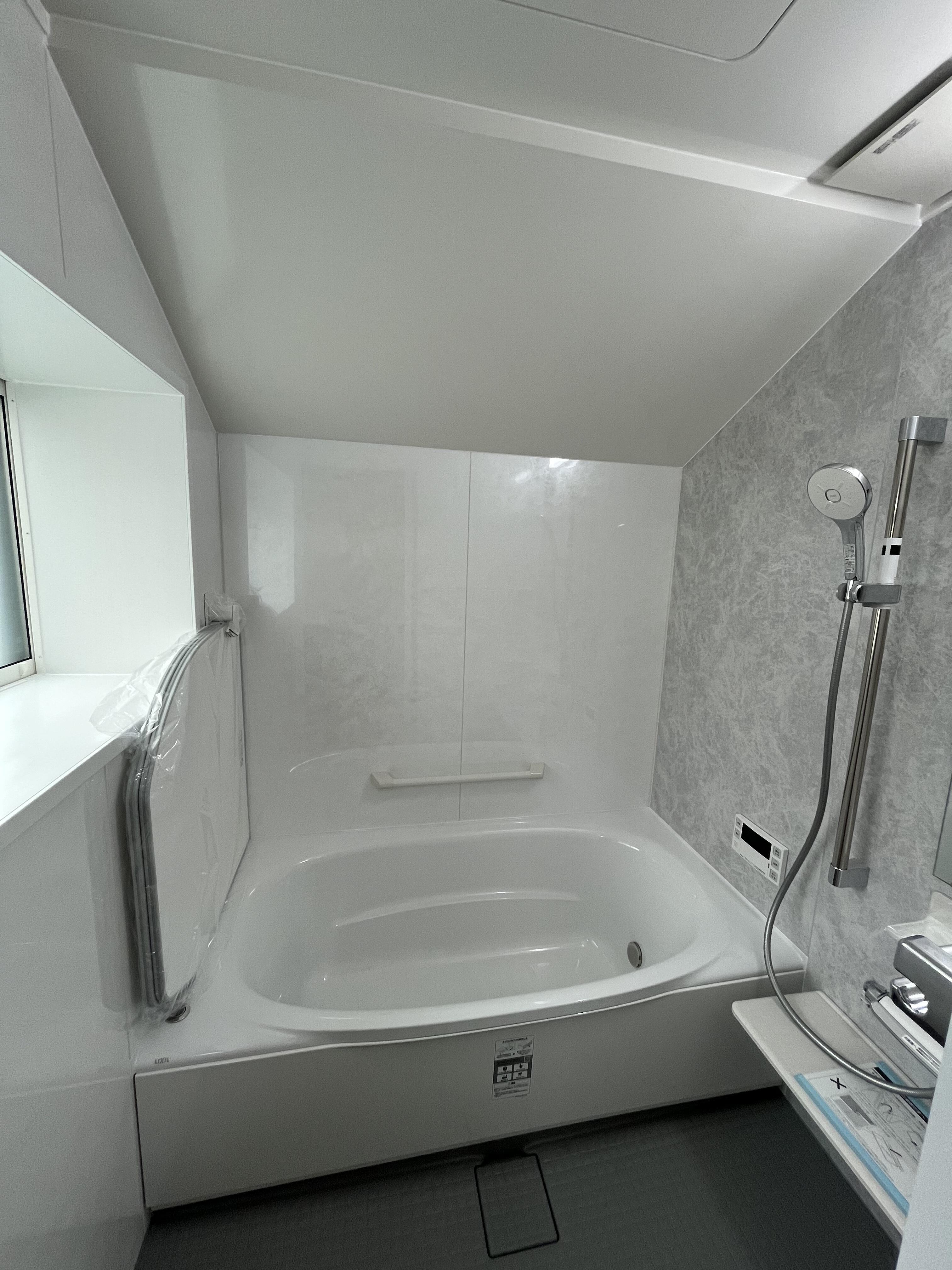 提案時には「平天井で全体高さを下げる」か「斜め天井で洗い場側は高く・浴槽側は低く」の2つの選択肢がありましたが、結果斜め天井を採用して良かったなと思います。 LIXILさんでも斜め天井はあまり出ないとの事で、施工まではちょっとだけ不安もありましたが、良い経験・事例になりました。