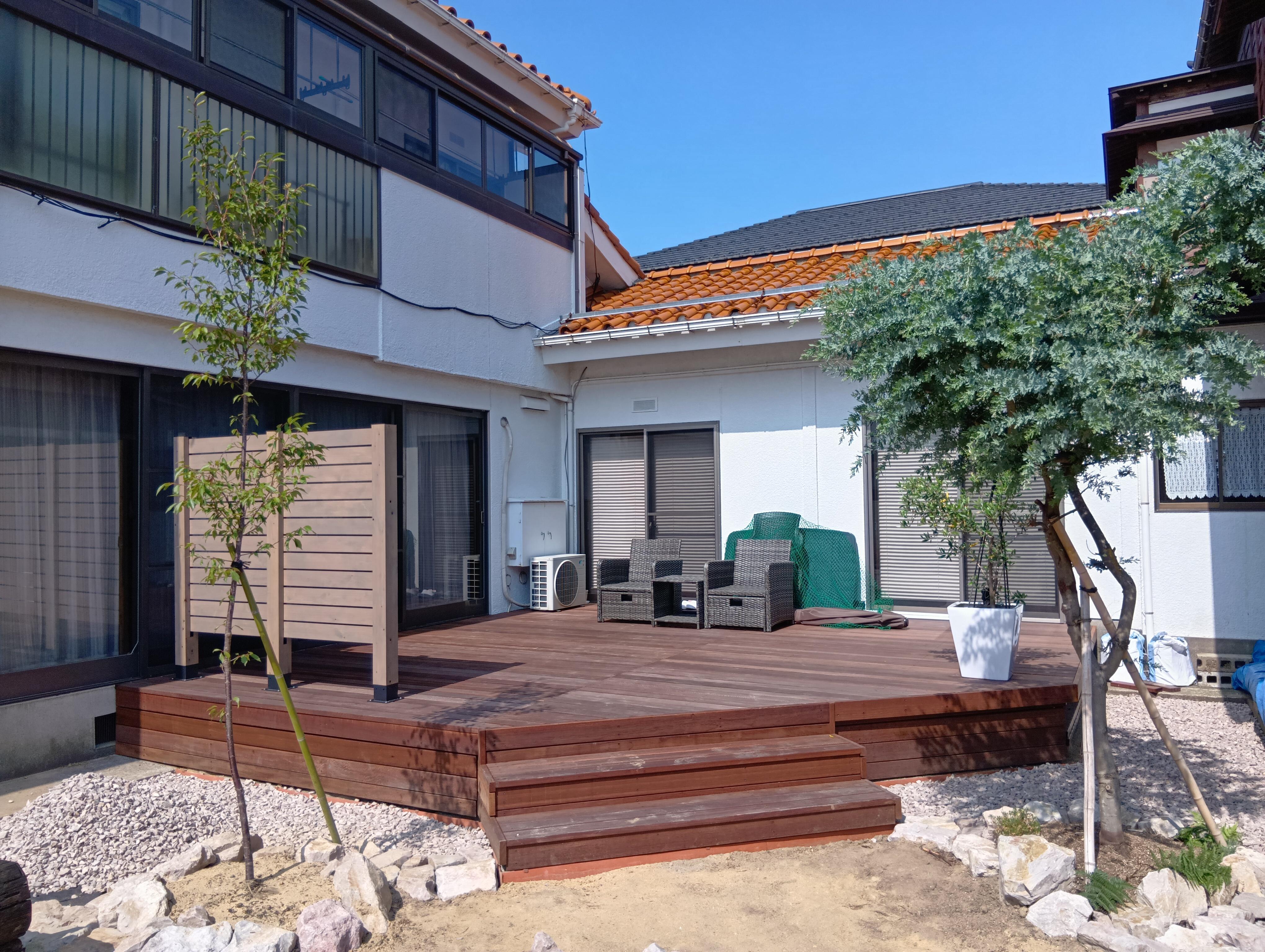 予算や中庭の雰囲気を考慮して、木製デッキを提案しました。 雰囲気がよくて、植栽との相性もよく周辺の視線も気にせず、中庭を家族で楽しめる空間になりました。