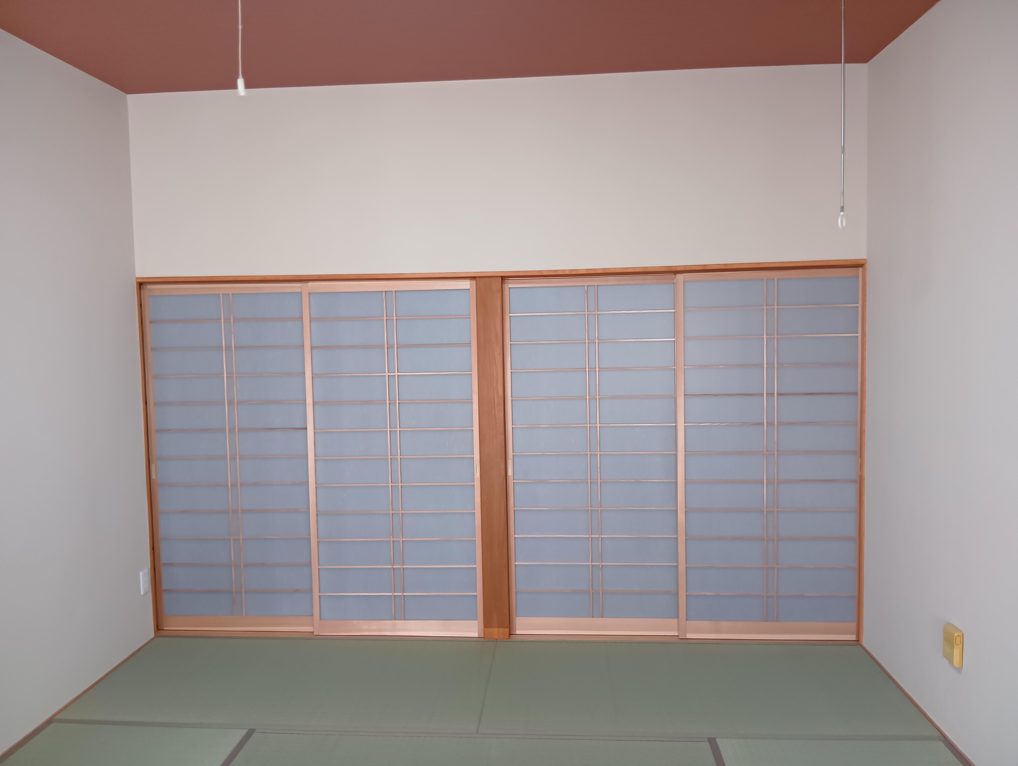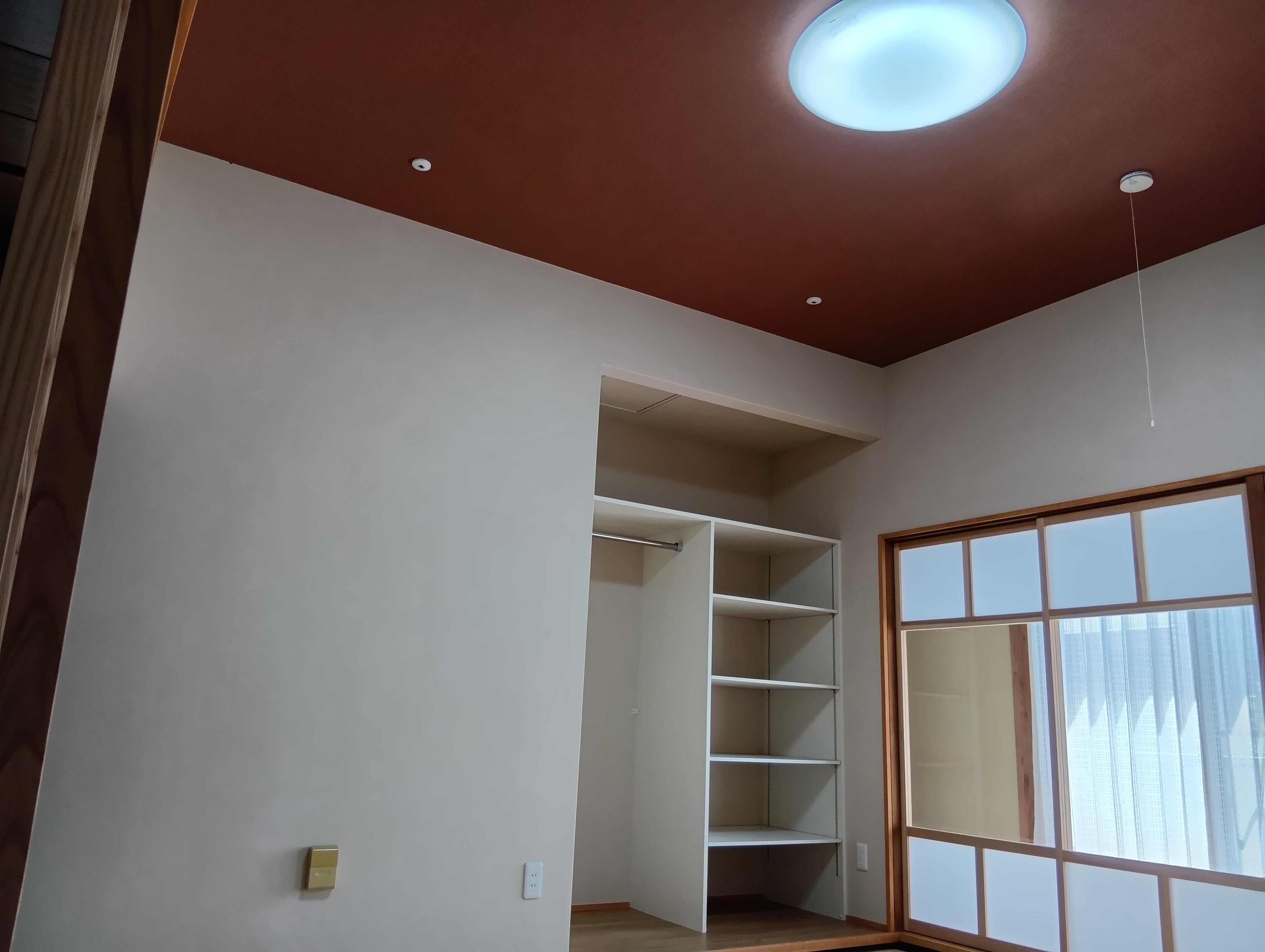 壁の仕上げは『珪藻土』をぬり調湿性のある仕上げへ、天井はワンポイントで朱色のクロスを採用。
