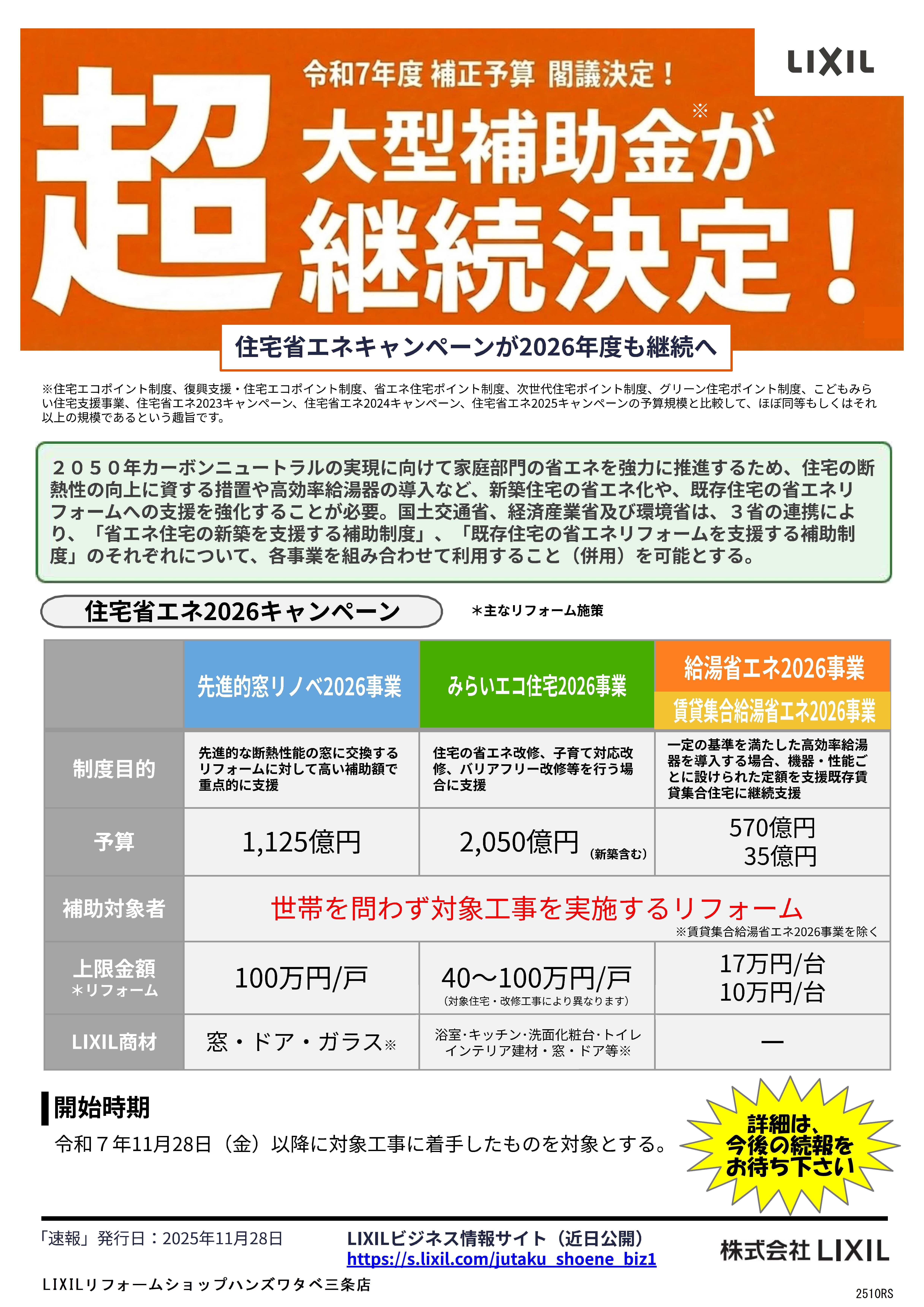 このたび、国による窓の断熱改修を支援する補助金が、2026年度も継続されることが閣議決定されました!!