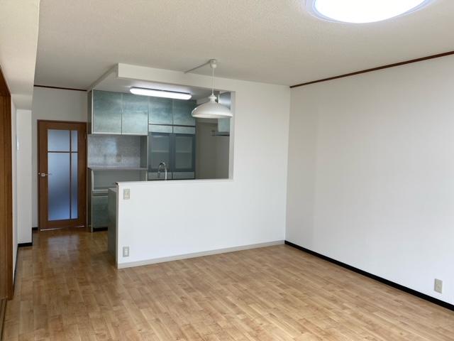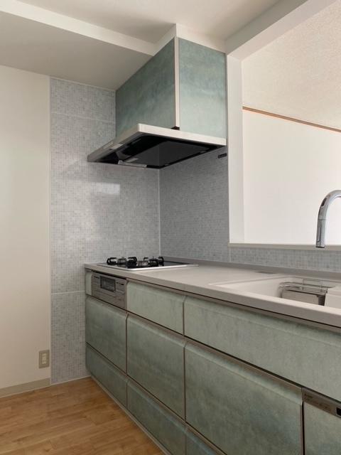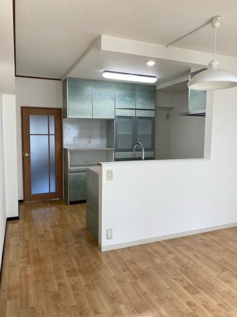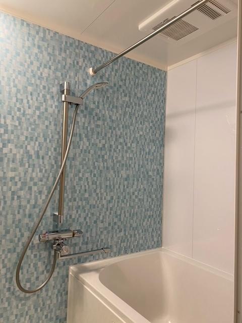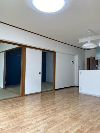 築44年のマンション、タイル張りのお風呂は換気乾燥暖房機で暖かく、壁付けでタイル貼りだったキッチンも対面にして快適にしたフルリフォームです。 ご家族の対話も増えそうですね。 内窓もインプラスで断熱性を高めました。寒冷地用エアコンを設置しています。 リビングからつながる二間続きの和室はデニムブルーのクロスが素敵です。