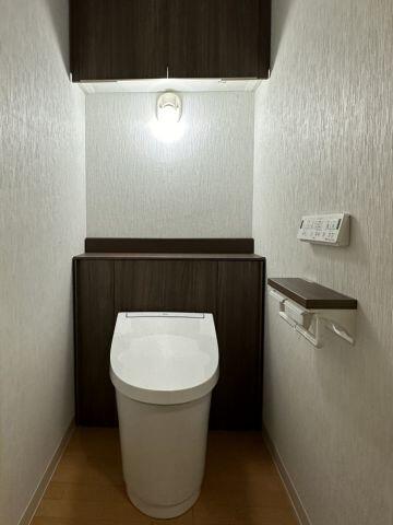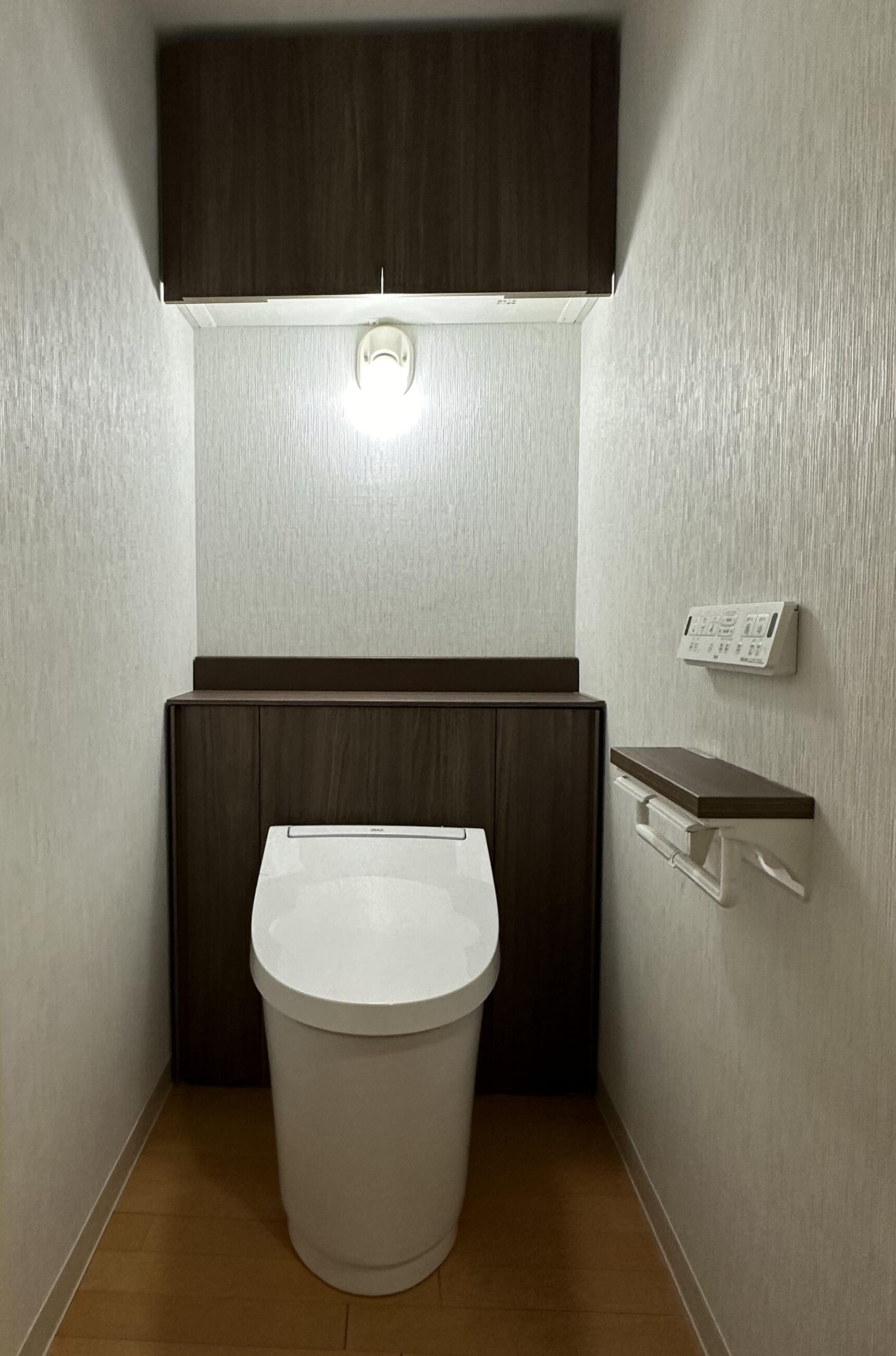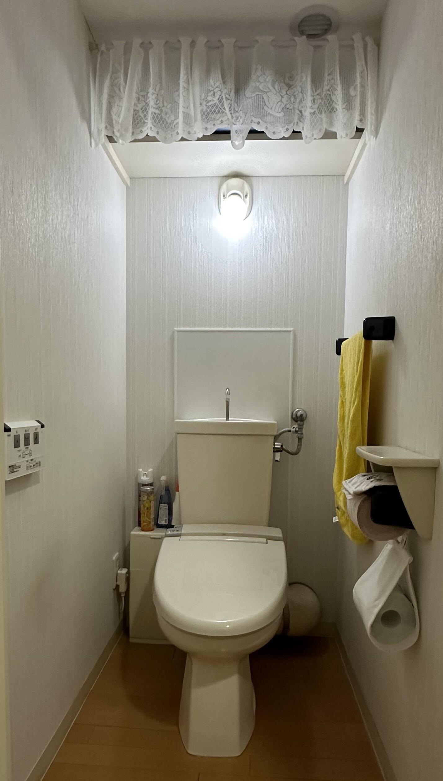 中古マンションをご購入時にはリフォームされなかったトイレ。 掃除道具や洗剤、カーテンに隠されたトイレットペーパーなどもスッキリ収納できるJフィットをご提案しました。 照明はそのまま生かしつつ、棚はアッパーキャビネットに変え、紙巻器とともにトイレキャビネットの色と同色にし 見た目もスッキリ! 床にモノを置かないので掃除も楽になります。