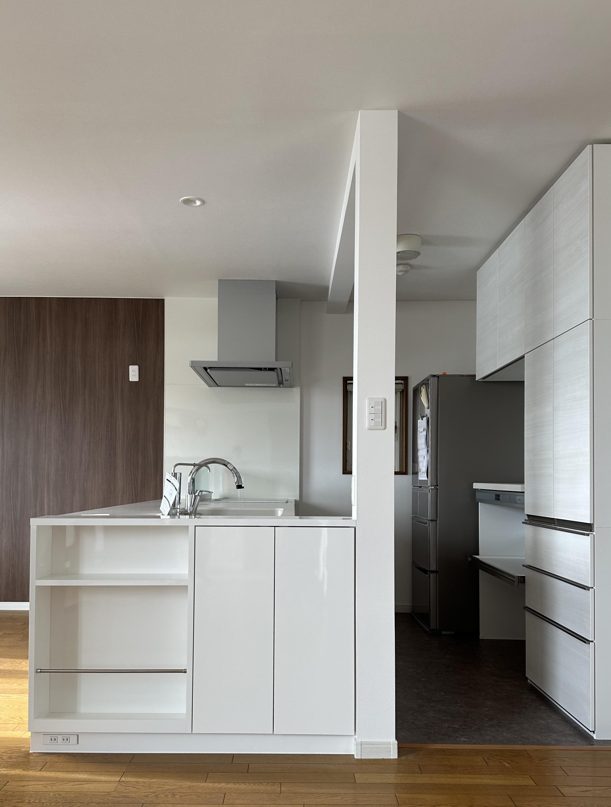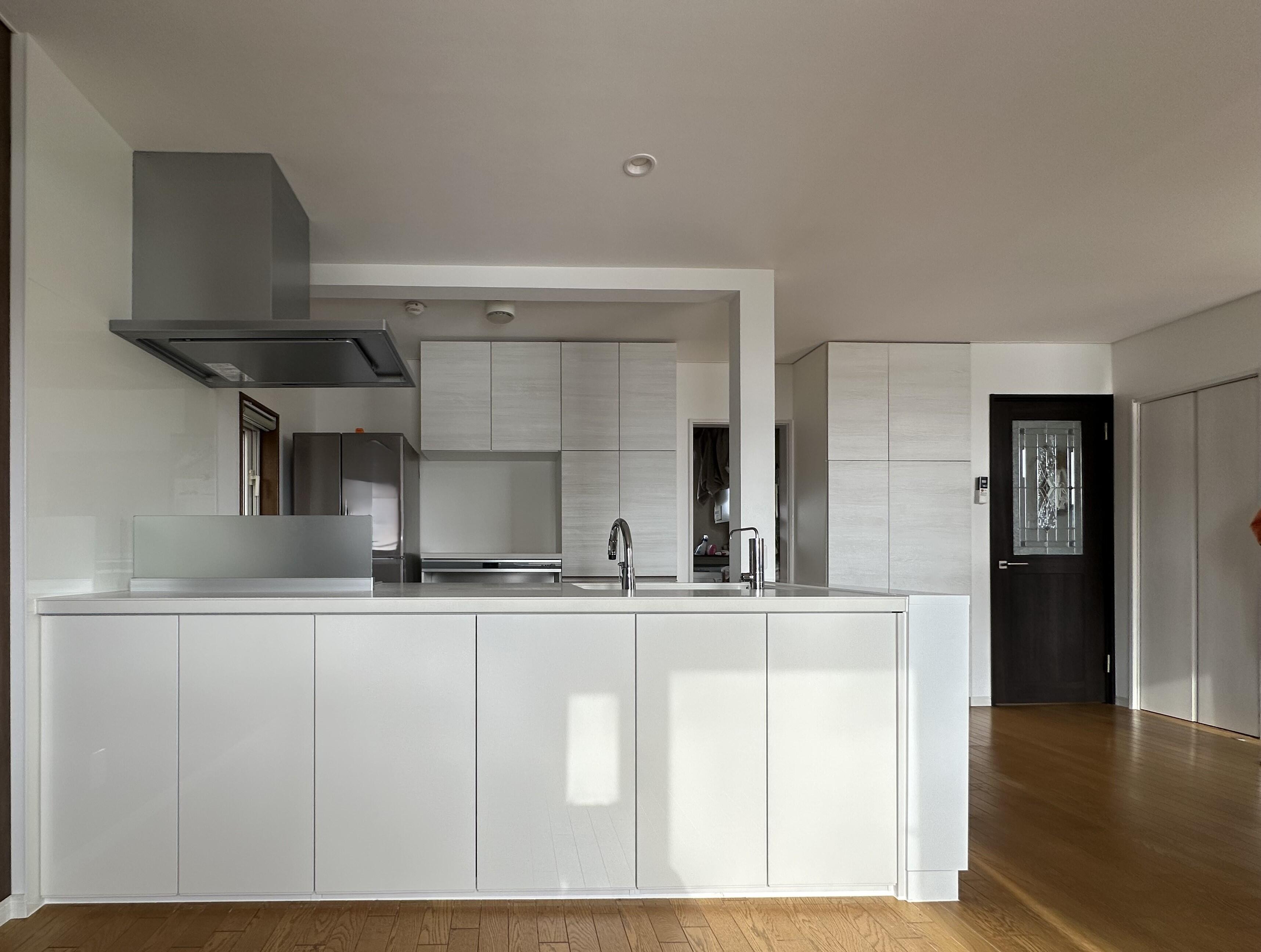 とっても明るくなったキッチンのフォームをご紹介します。 リビングからの陽ざしがキッチンにまで差し込んで光沢のある扉カラーのホワイトがキラキラと。