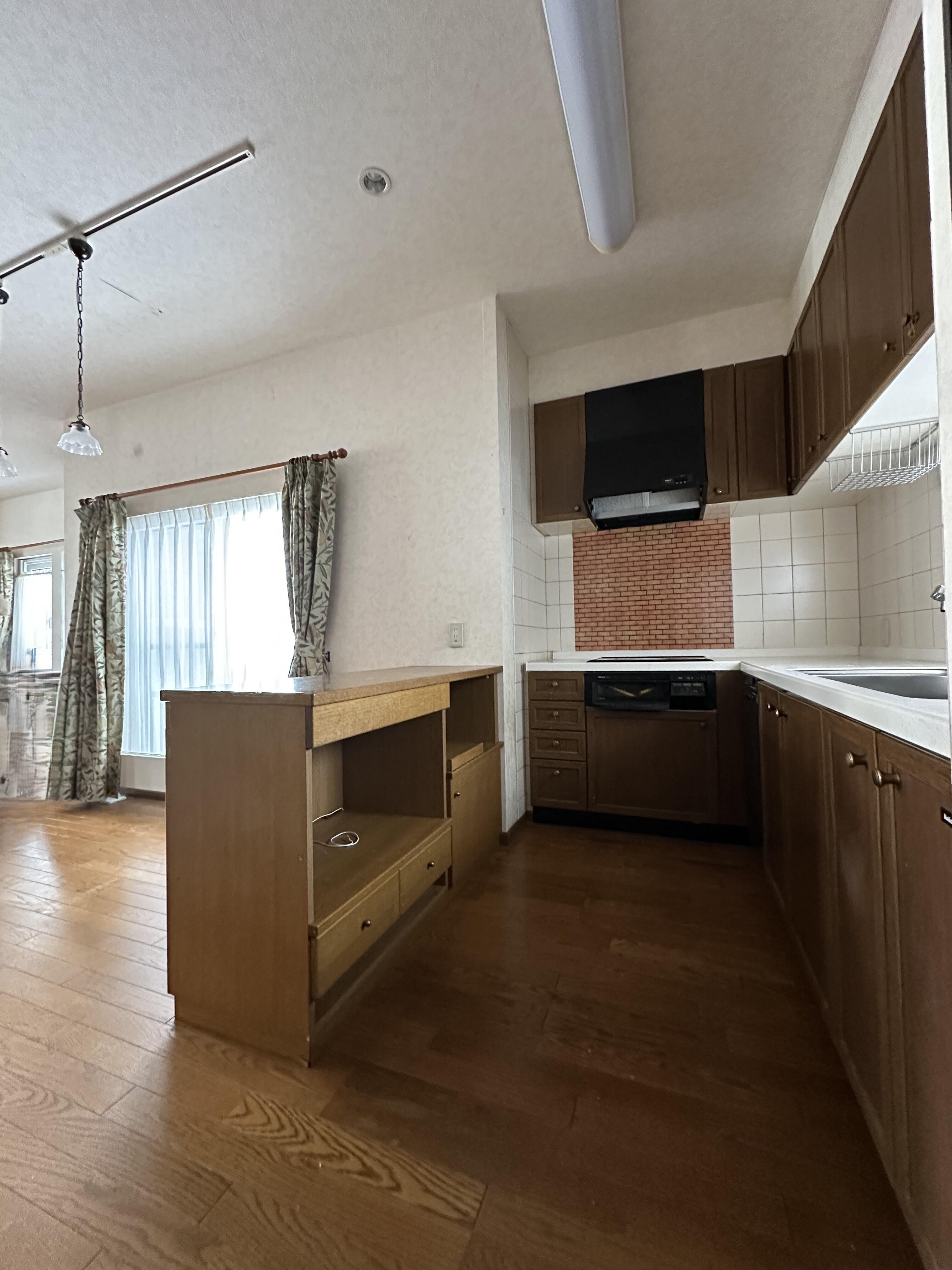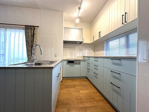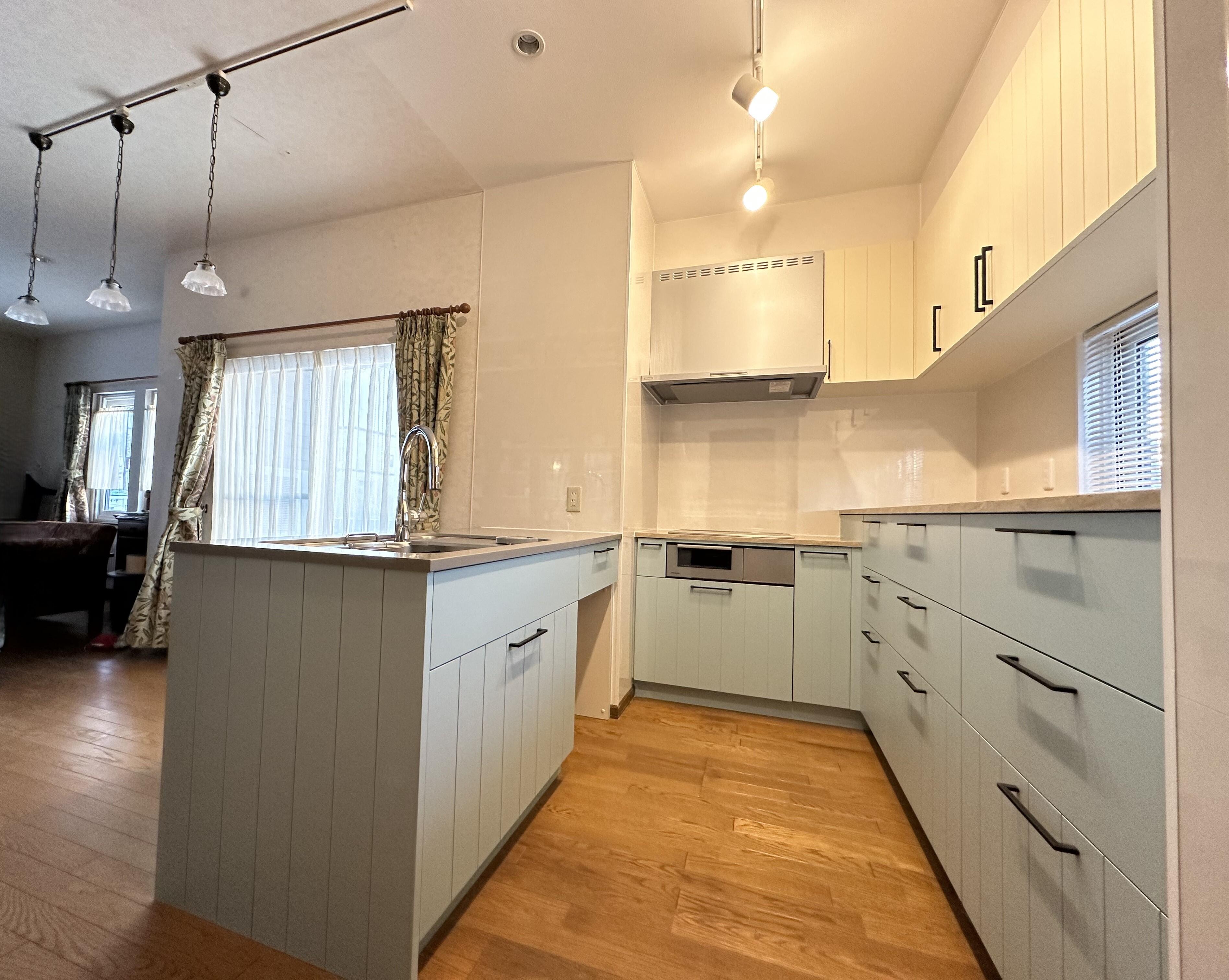 シンクのみペニンシュラ型にしたのでグースネックの水栓が映えますね。 リビングの家族との会話も弾みそう!