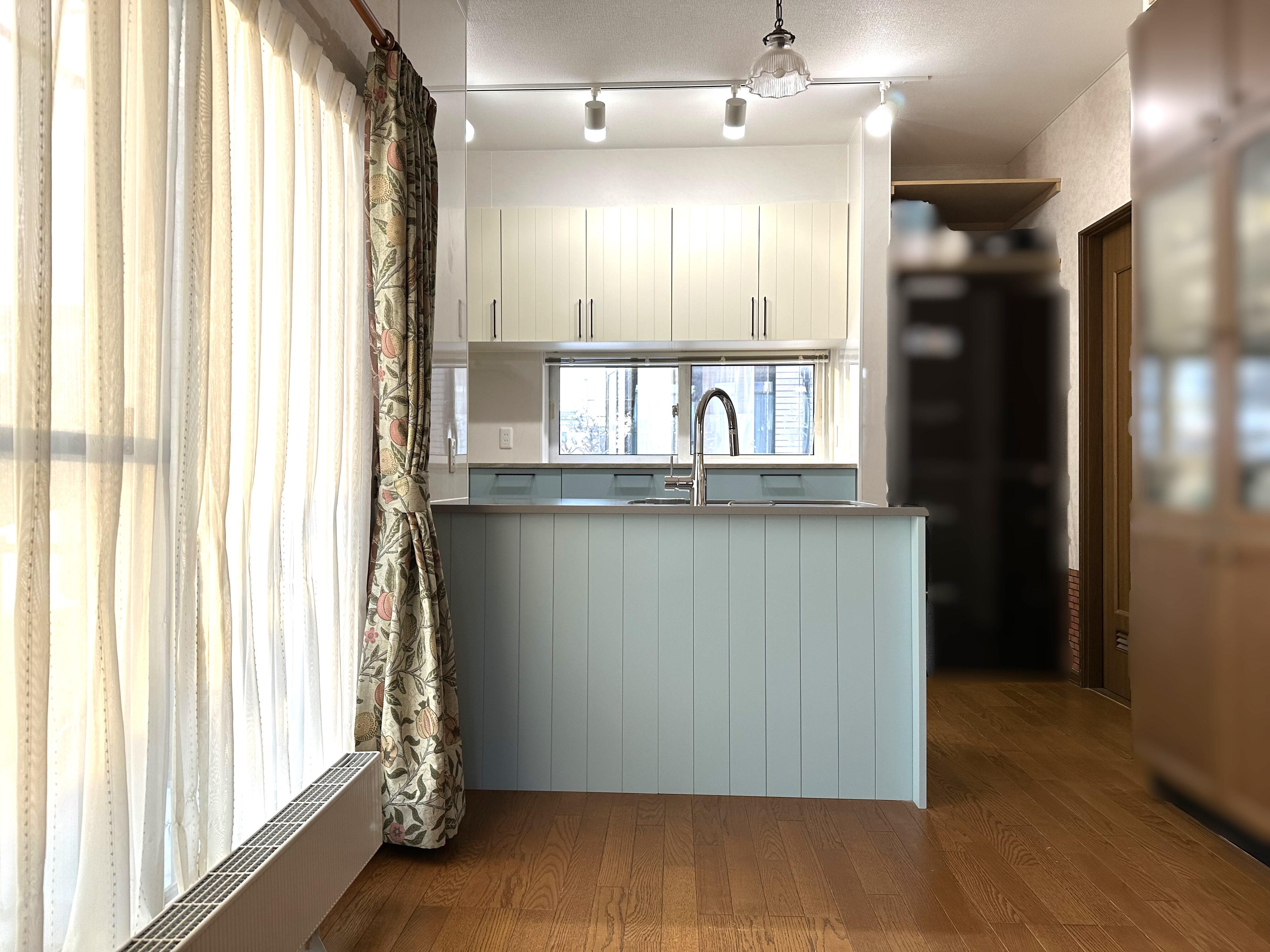 重厚感があるカラーが暗めでタイル壁のキッチンが奥様お気に入りのカラーでこんなに明るく素敵なキッチンに!