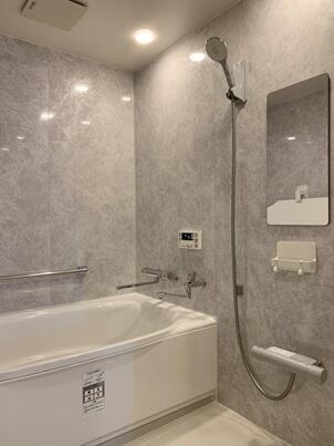 中古マンションの購入を機に古かった温泉付き浴室をリフォーム。リノビオV Fシリーズ1418壁パネルにストーンシェルグレーを選び、マグネットシェルフなどグレーでまとめました。ごちゃごちゃしていたお風呂がスッキリして、日々の疲れもいやせますね。