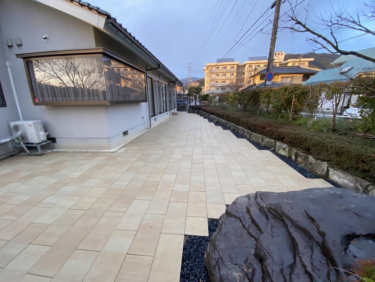 まず、いらない木を撤去し、土を15cmくらいすき取り、砕石を敷き、砂を敷いて、インターロッキングという30cm角の色のついた整形板を敷き詰めました!念には念を入れて、その下には防草シートを敷いています。