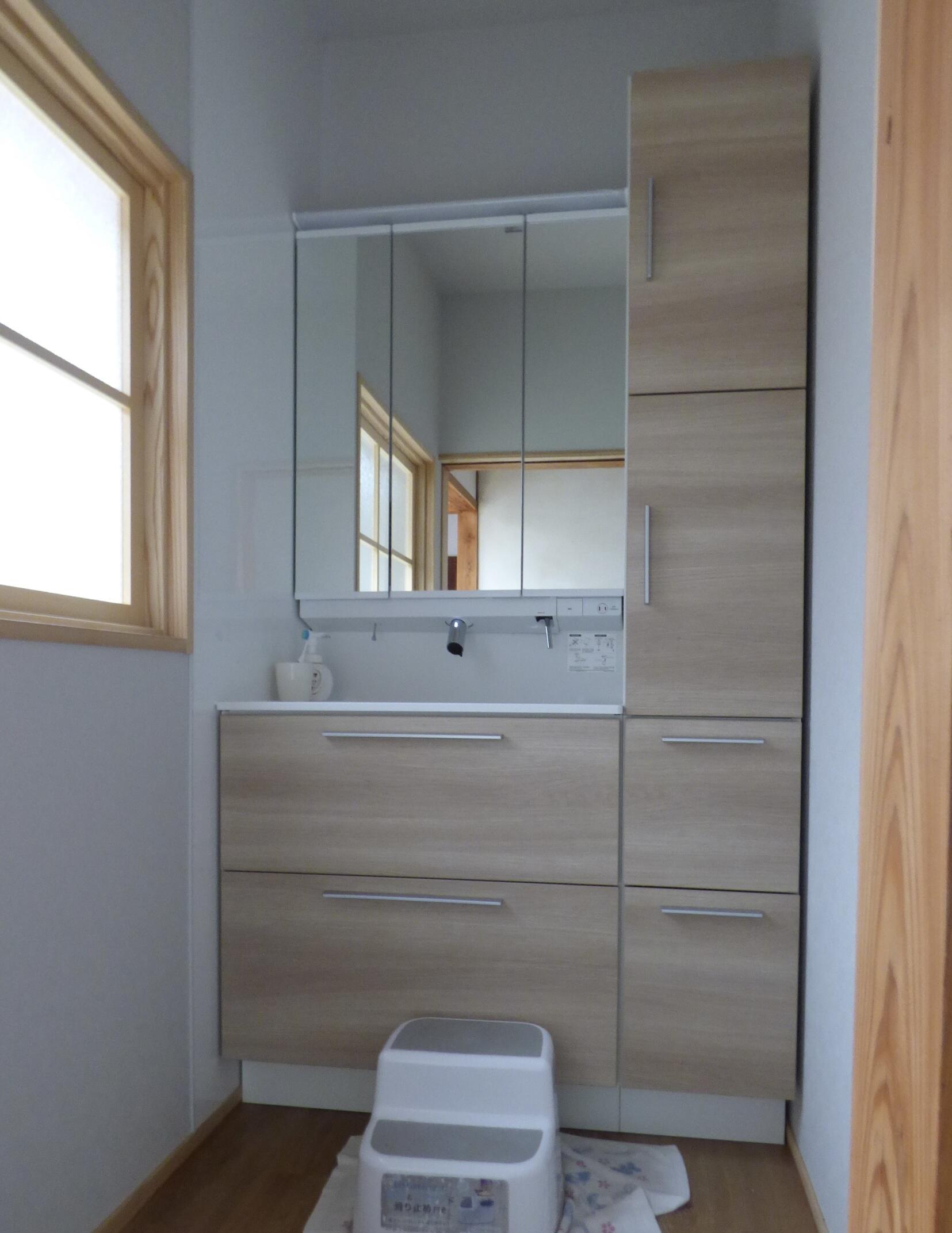 洗面化粧台の周辺は、水や汚れが飛んでも掃除しやすいように クロスではなく、キッチンパネルを採用しています。
