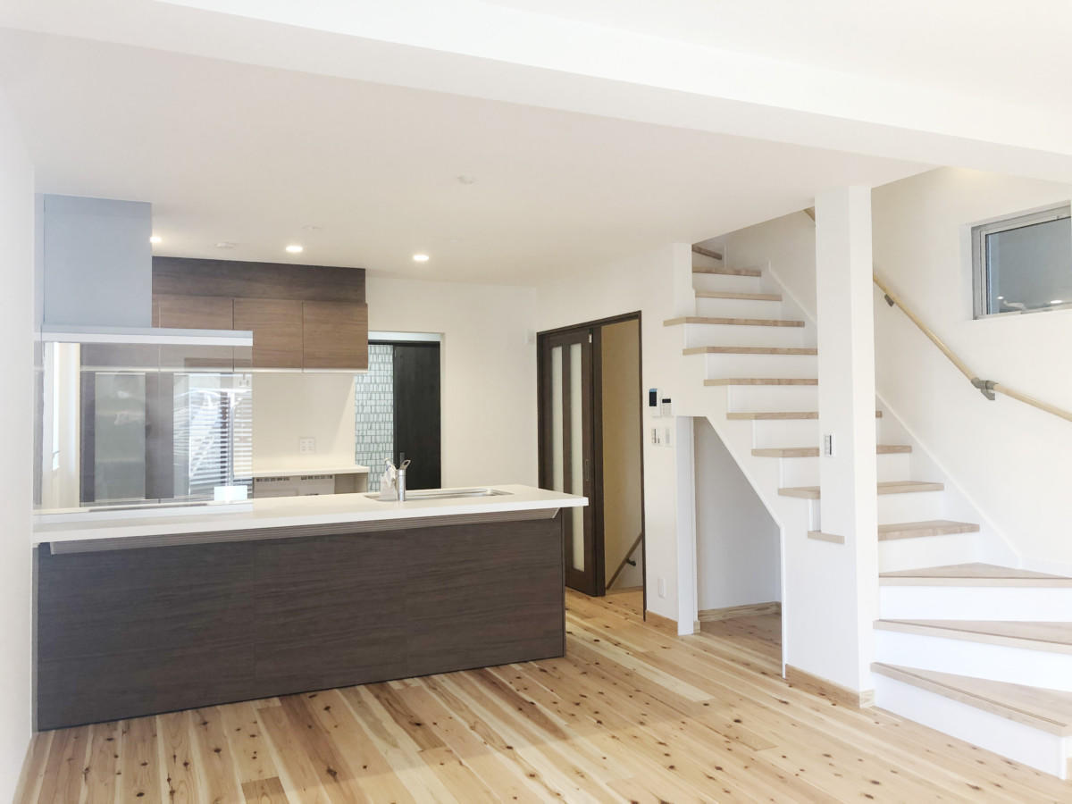 LDKとの繋がりが感じられる対面キッチン。無垢材(スギ)の床は、自然のあたたかみがあり、裸足でかけまわりたくなるような空間に。オープンな階段の下には収納を設け、デットスペースを有効活用しています。