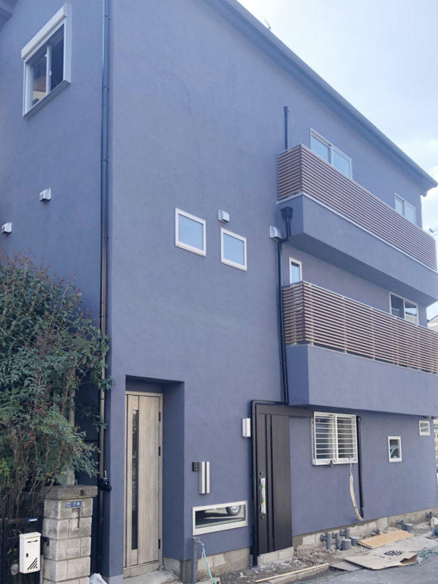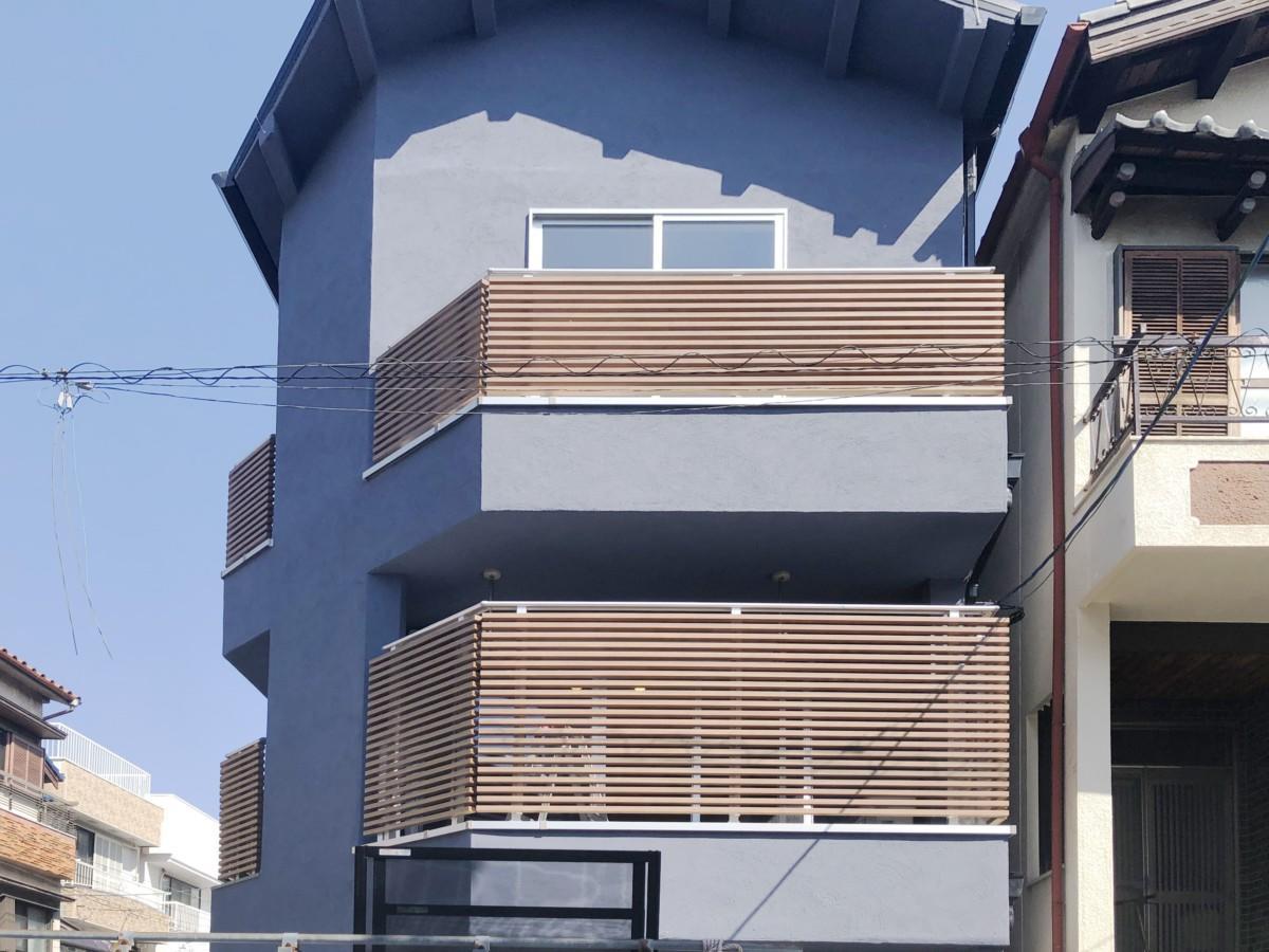 塗り壁には、カラーバリエーションも豊富でレンガの上からでも塗ることのできるSTOを使用しました。かっこいい雰囲気を出しながらも、撥水性もありメンテナンスフリーでリフォームでも大人気のものです。バルコニー部分には、目隠し効果のあるルーバーを付け、プライバシー確保とともに外観のアクセントにもなっています。
