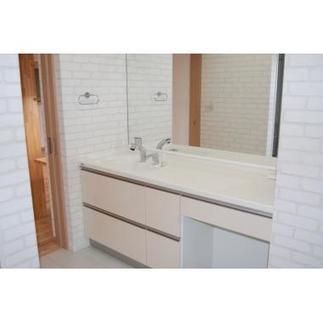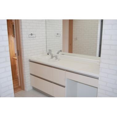 ひろーい洗面台で朝混雑することがありません。壁紙は全面レンガ調のものを採用し、おしゃれなカフェ風の洗面室になりました。
