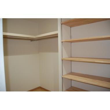 収納されるものと量を確認し、大きさと内容をご提案したウォークインクローゼット。ハンガーパイプにはコートなどを掛ける事ができ、手前の棚は可動式になっているため、背の高い物から低いものまでしっかりと収納することができます。