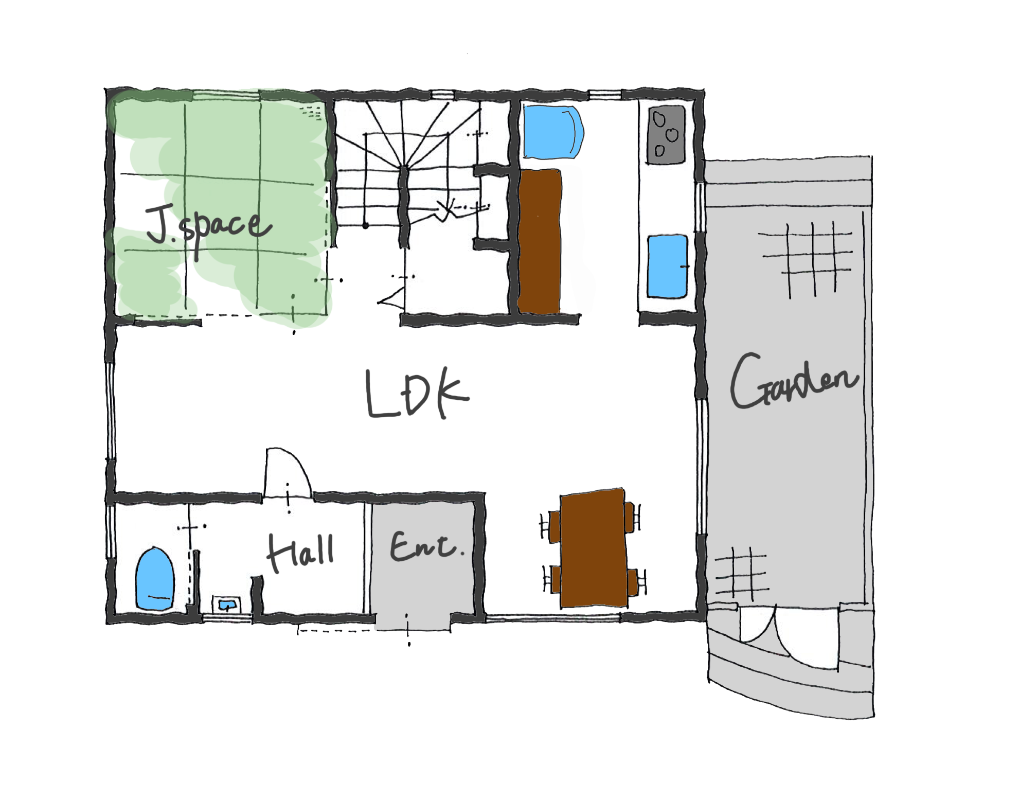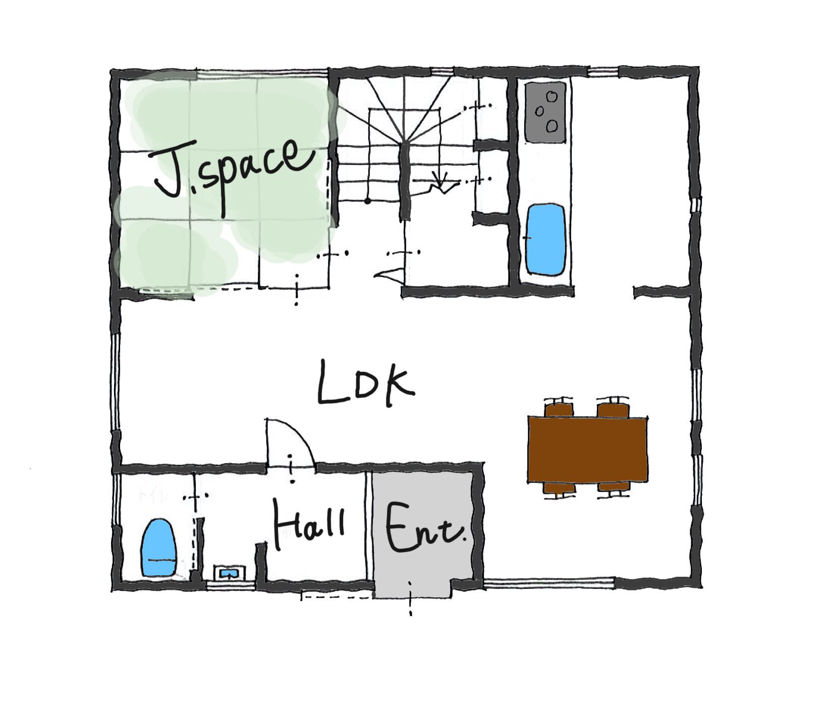 キッチン空間の垂れ壁を撤去し腰壁にすることで、開放感と部屋との一体感を ・垂れ壁を撤去し、腰壁にしたことで夫婦間のコミュニケーションも増えて、それだけで動線がよくなったように感じる、とのお声を頂いております。