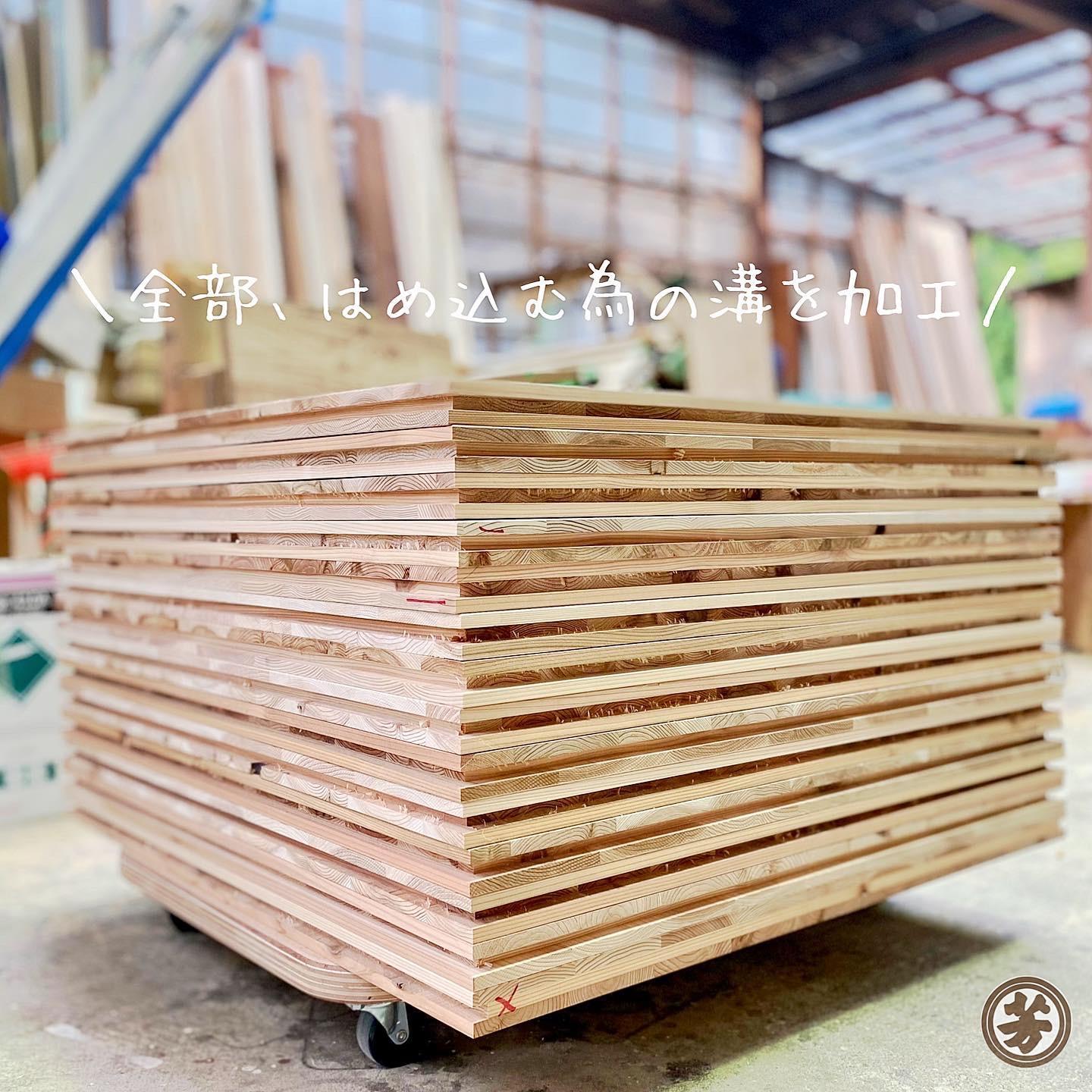 その後、フローリングにする為に欠かせない嵌め込みの溝を作って、1枚が完成。