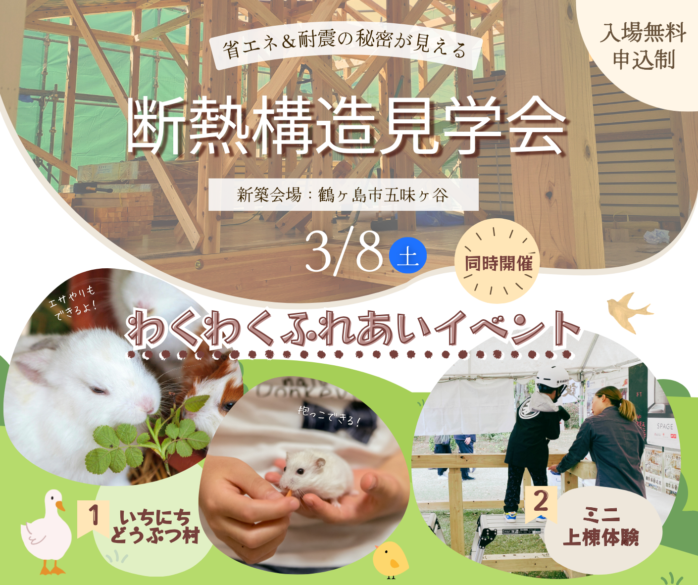 ✧上棟体験1組1時間の枠で、構造見学会とふれあい体験をセットで体験。