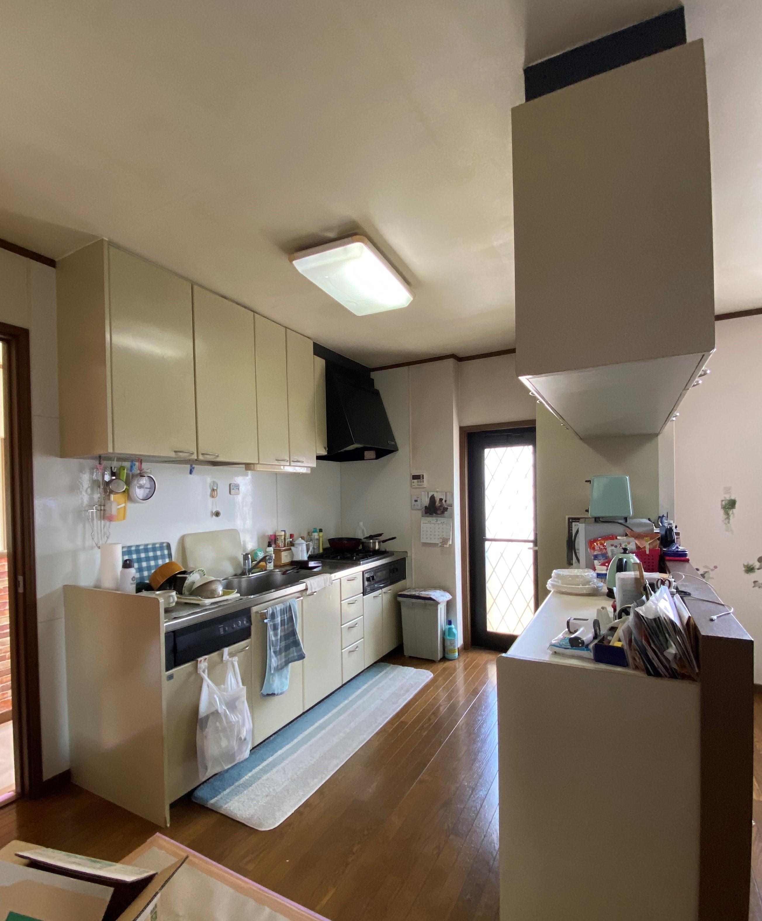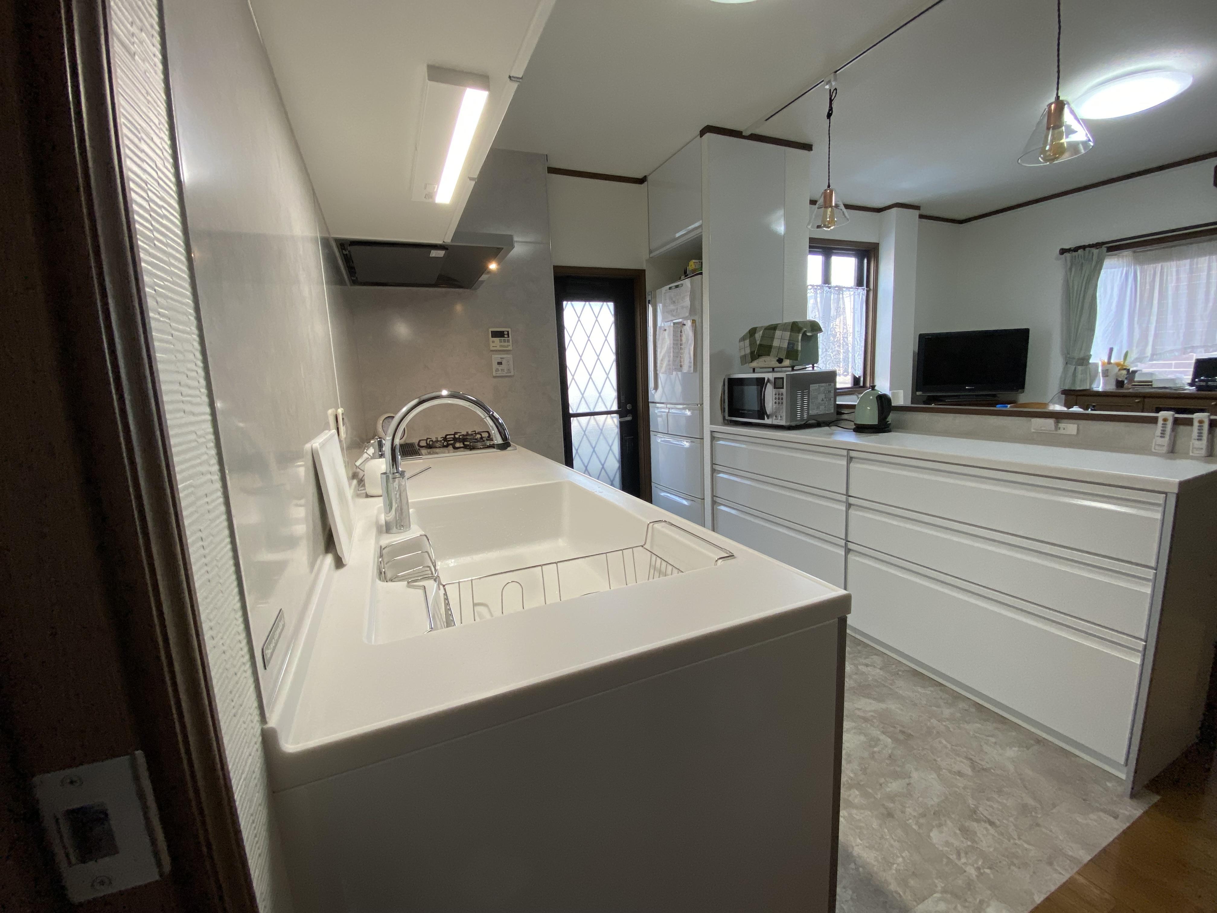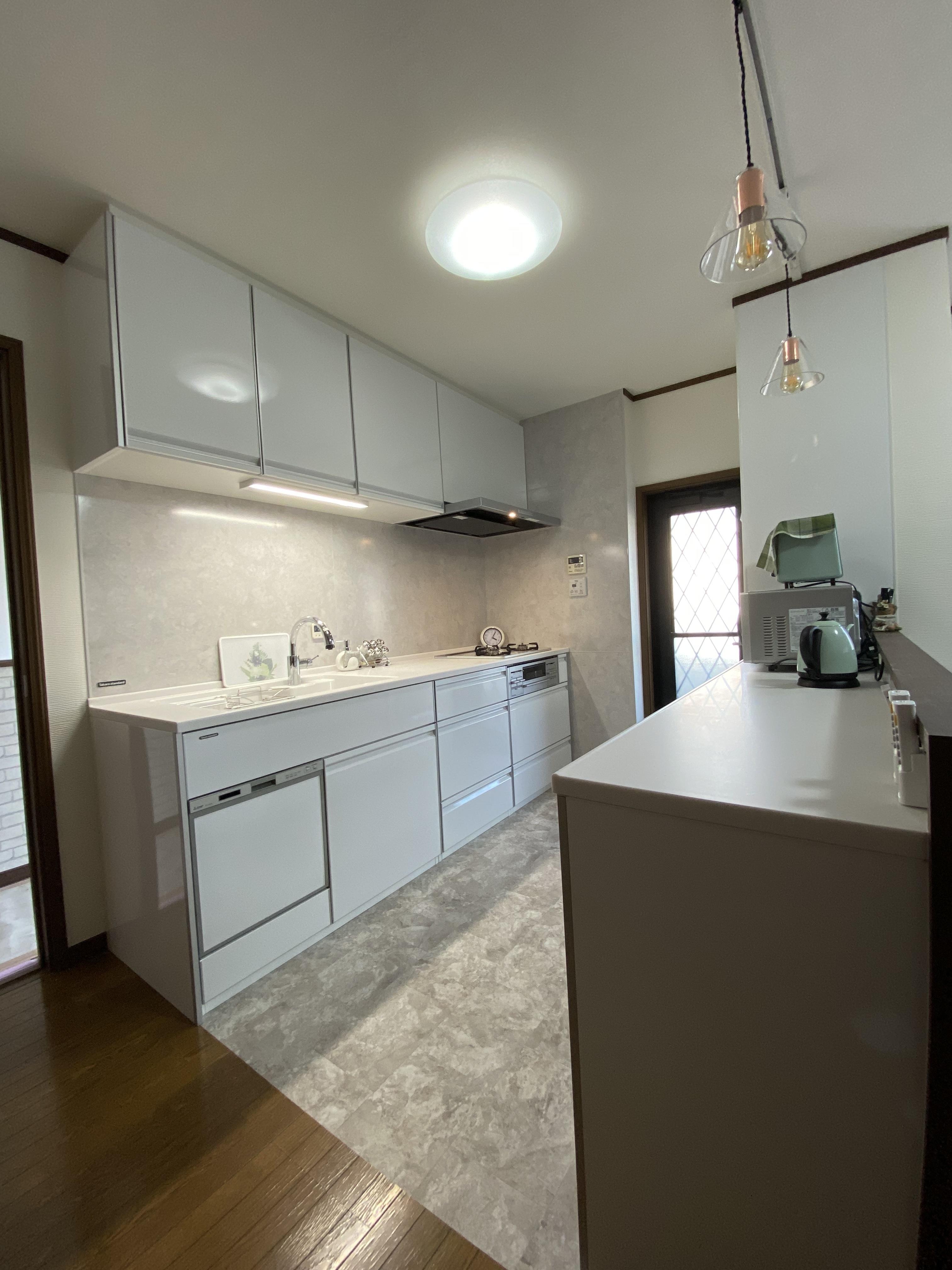 20年以上使用したキッチンは、所々不調が出ていました。 食洗器は壊れてから何年も使用しておらず、キッチン全体が色褪せて暗い印象だったこともあり、全部取り換えることにしました。 新しいキッチンは掃除がとても簡単で、特に換気扇の掃除が楽にできることが気に入っています。 担当者のアドバイスで、既存の吊戸棚を外してペンダントライトを付けましたが、これが大正解!キッチンもダイニングもとっても開放的で明るくなりました。 キレイに生まれ変わったキッチンには、おしゃれな雑貨屋さんで買ったインテリアを飾って楽しんでいます。 自分では思いつかなかったアドバイスが貰えて、齊藤建設に相談してよかったです。