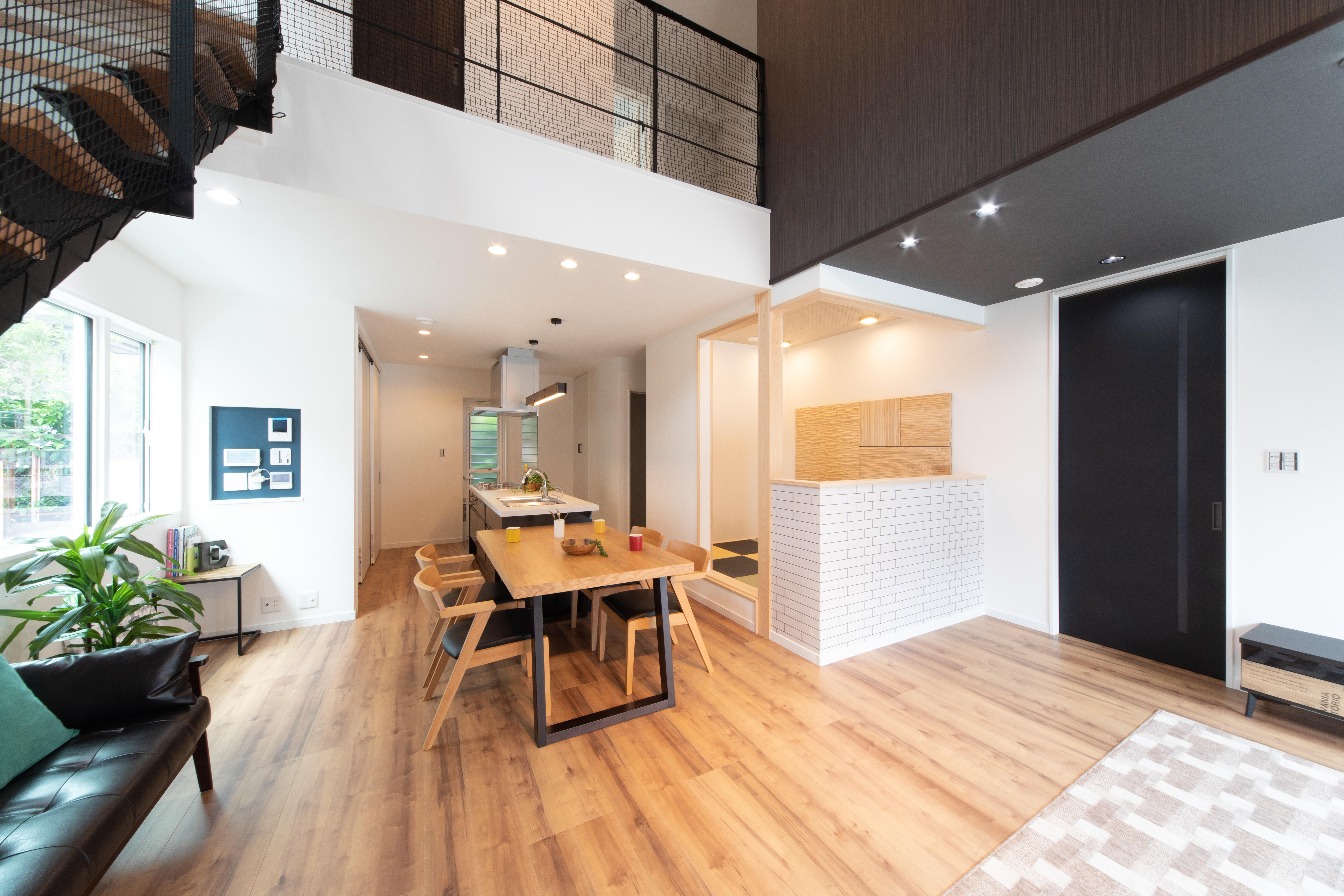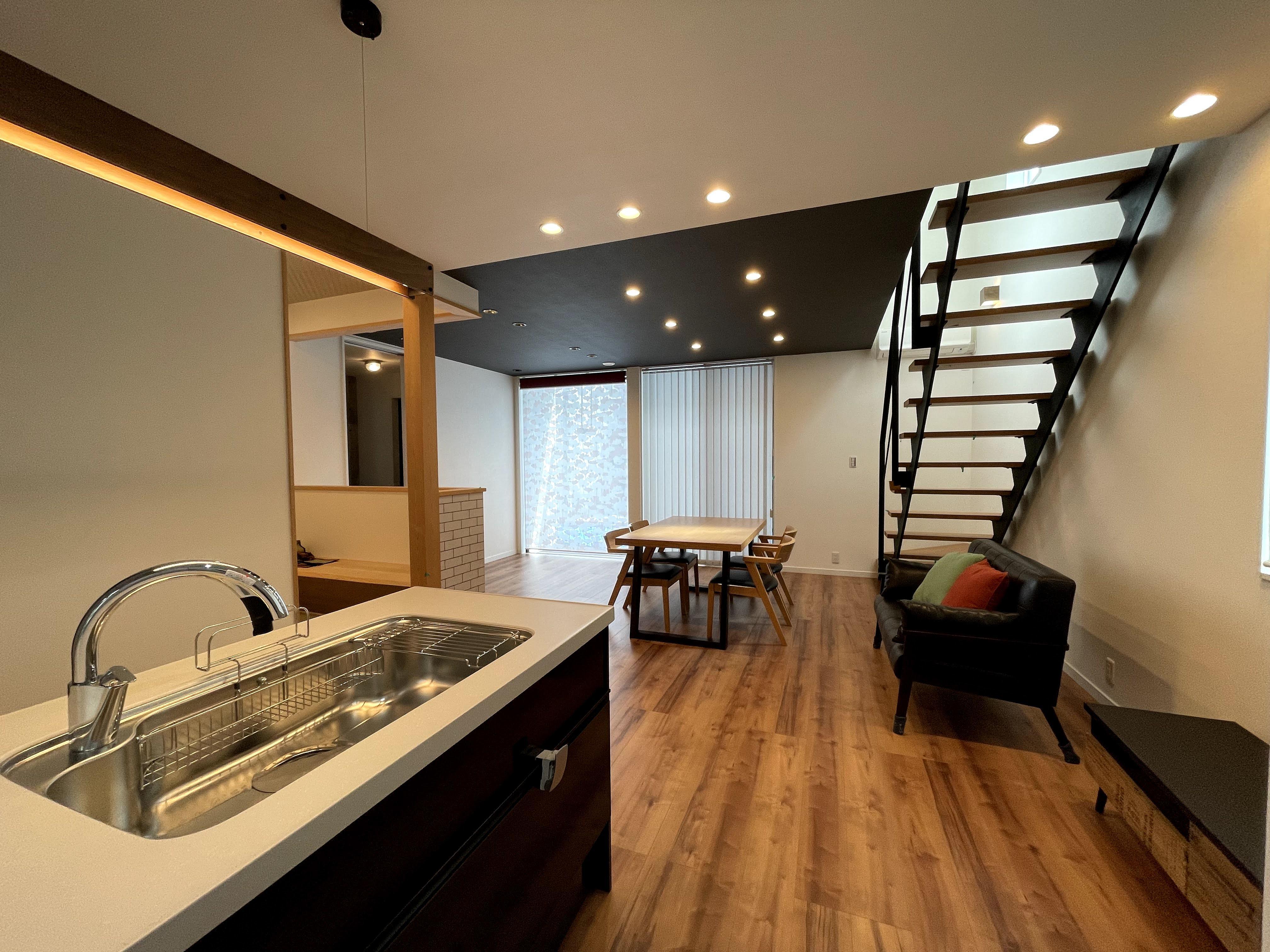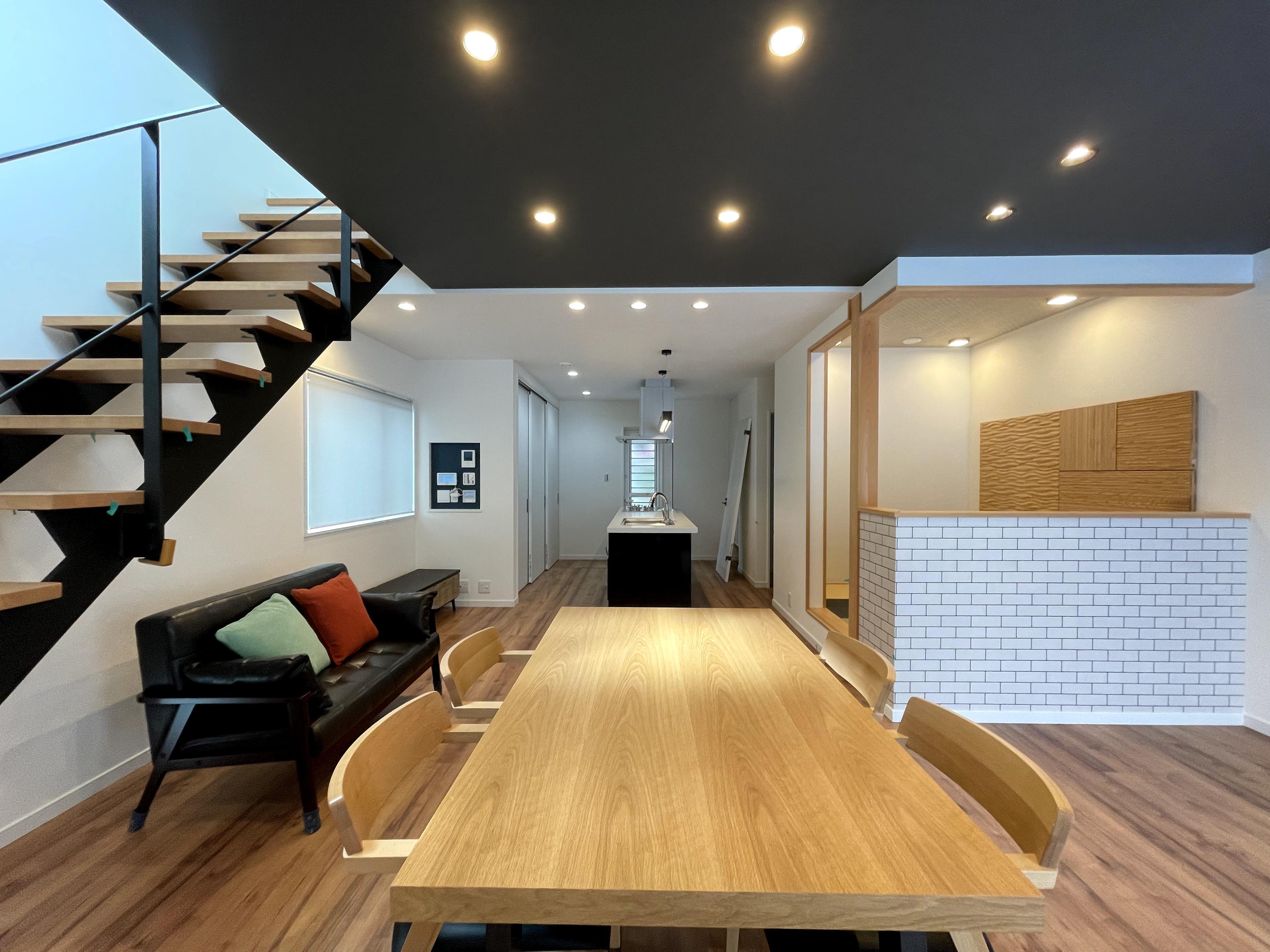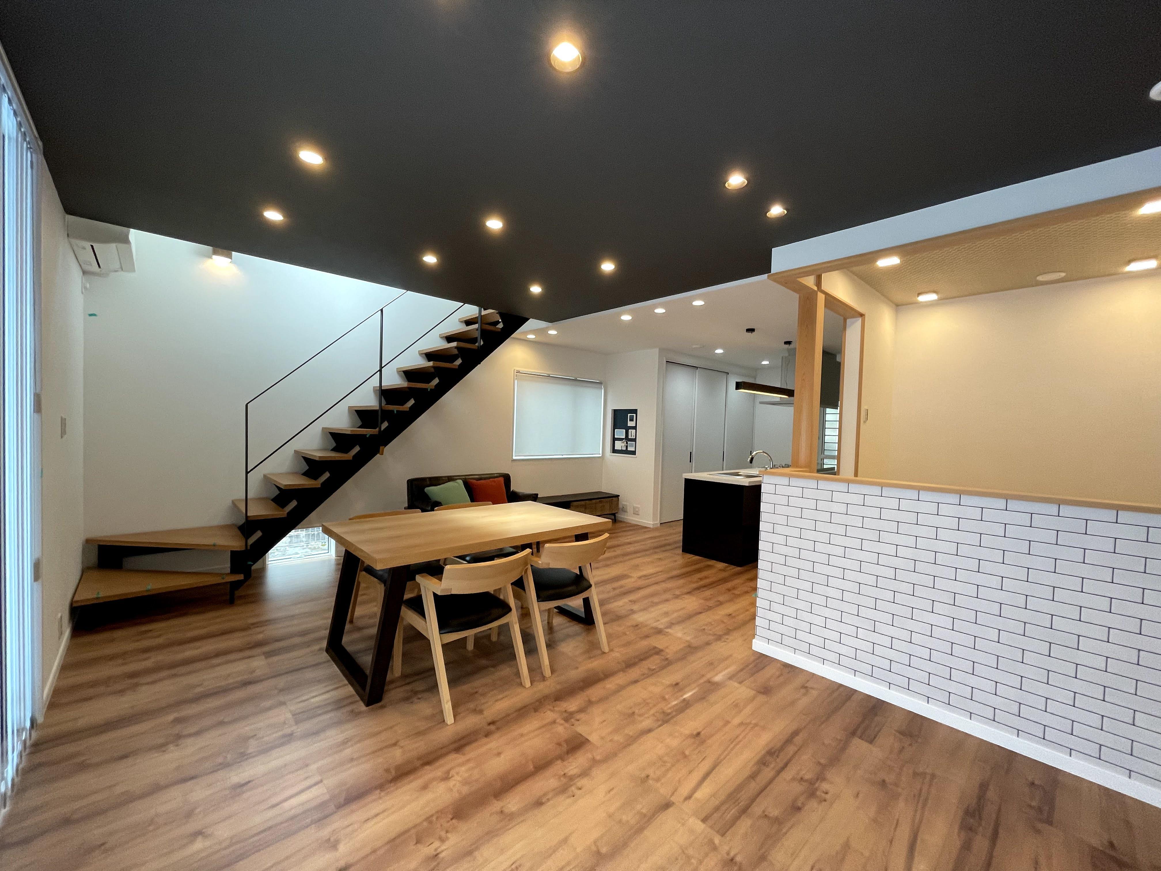 当初はリビングには吹抜けの大空間だったのですが、二階にお部屋を作ることになり吹抜をなくして欲しいとのご依頼でした。 以前の開放的でお洒落場なイメージをそのままにリノベーションをして欲しいとの事だったので、天井をブラックの落ち着いた色調にしました。 又ダウンライトを配して上質感のある雰囲気に仕上げました。