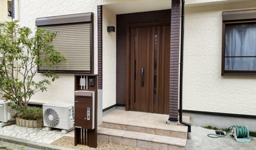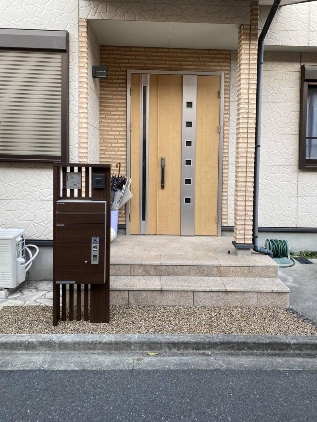 外壁、玄関柱、玄関ドア、宅配ポストの色をチャコールブラックに揃えました。 色を揃える事で統一感が出て、重厚感のある玄関アプローチに変わりました。