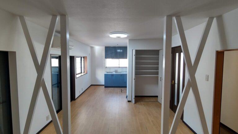 今回のキッチン改修工事では、お客様のご要望に合わせて、和室をなくしてLDKとして広く空間を確保しました。この中でも、特に注目していただきたいのが、リビングダイニングの境に設けた収納棚と構造上必要な見せる筋交いです。デザインもおしゃれで、お客様からも好評をいただいております。