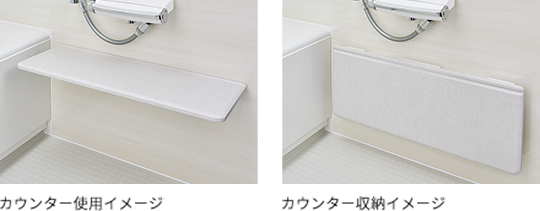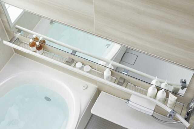 洗い場からバスタブへの動作をサポートし、収納もたっぷり。ゆったりとしたくつろぎの空間で心地よいバスタイム♪