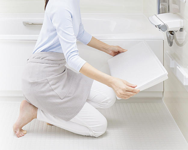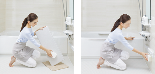 カウンターを外してまる洗いできるから、裏までピカピカに。洗いにくい壁や床もラクな姿勢で洗えます。