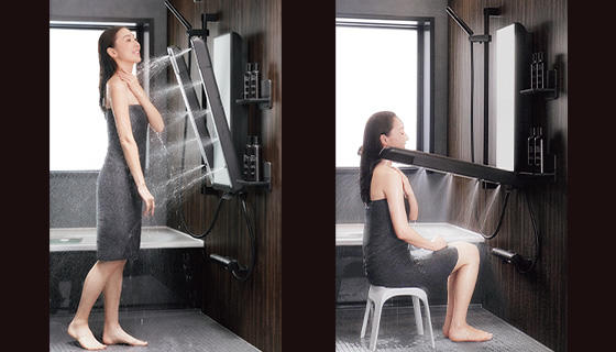 立っても座っても、快適に浴びることができます。お湯にやさしく包まれて温まる、新しいシャワースタイルです。