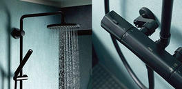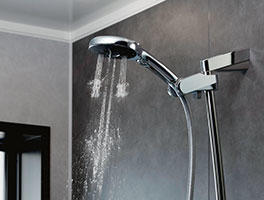 オーバーヘッドシャワーで頭上から思う存分、心地よく浴びられます。シンプルで機能的なメタルシェルフは、シャワーでもバスタブでも使いやすい。