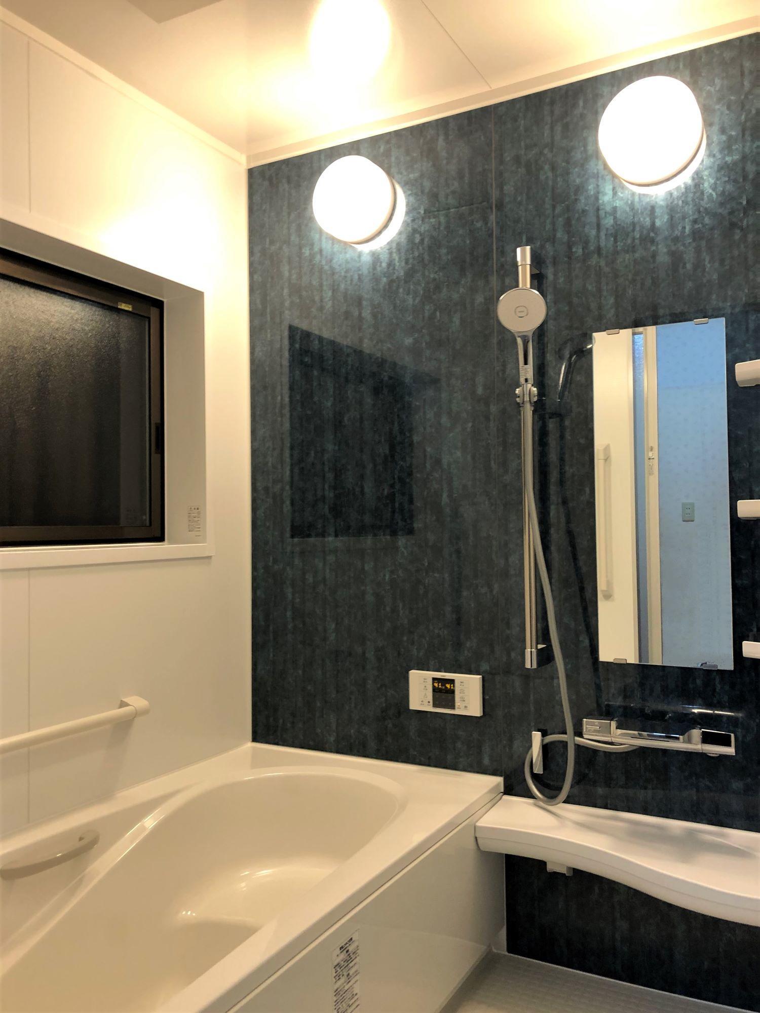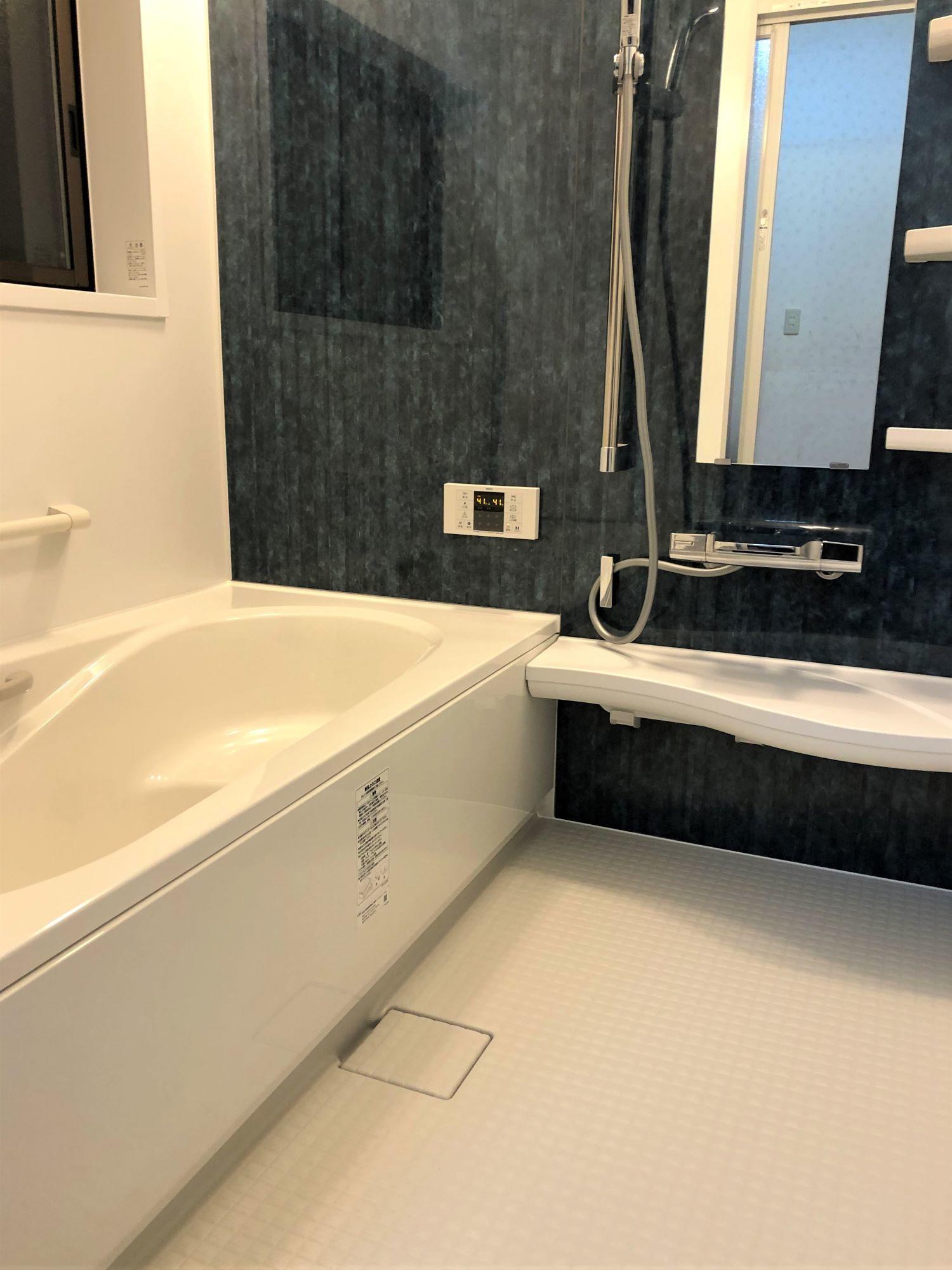 「工事前の印象を一切なくしたい」とS様たってのご希望で、リフォーム前と雰囲気を一新。デザインや内装はご家族皆様でご検討頂きました。壁の深いブルーはショールームをご見学された際に第一印象で選ばれました。清潔感もある落ち着いた雰囲気の浴室に生まれ変わったと思います。