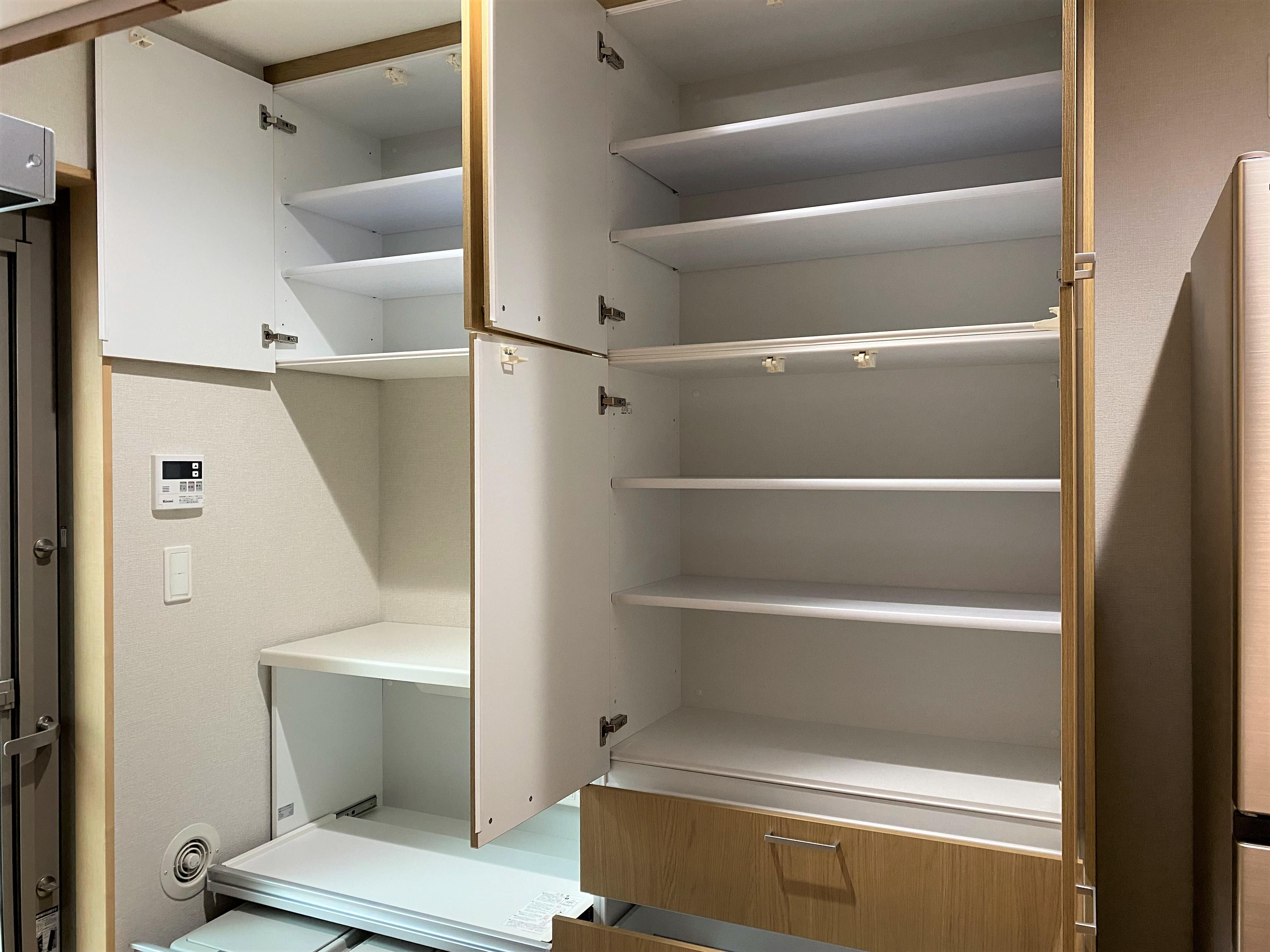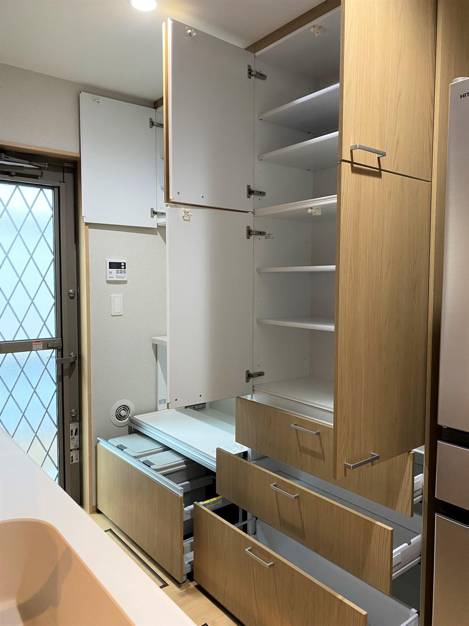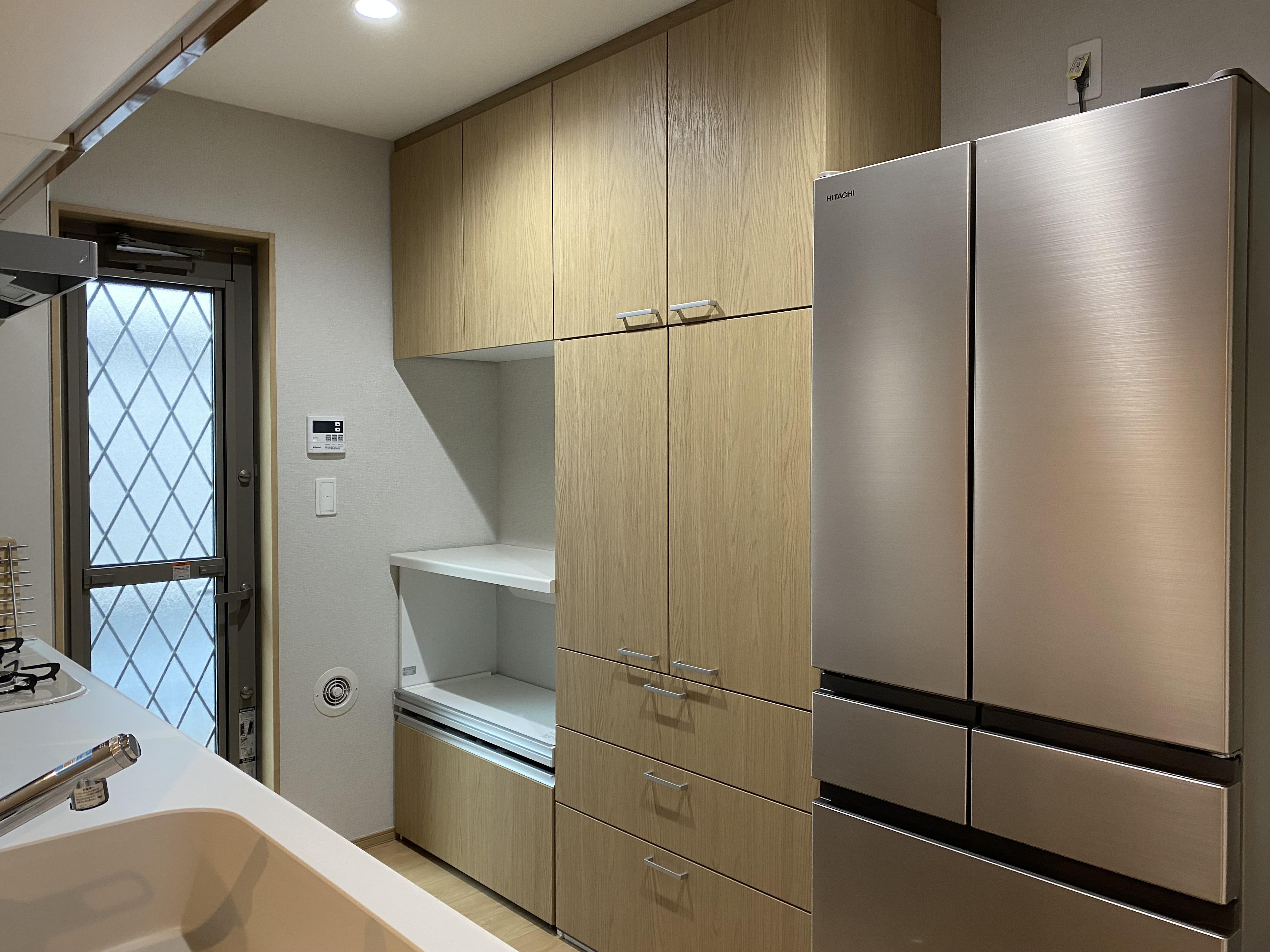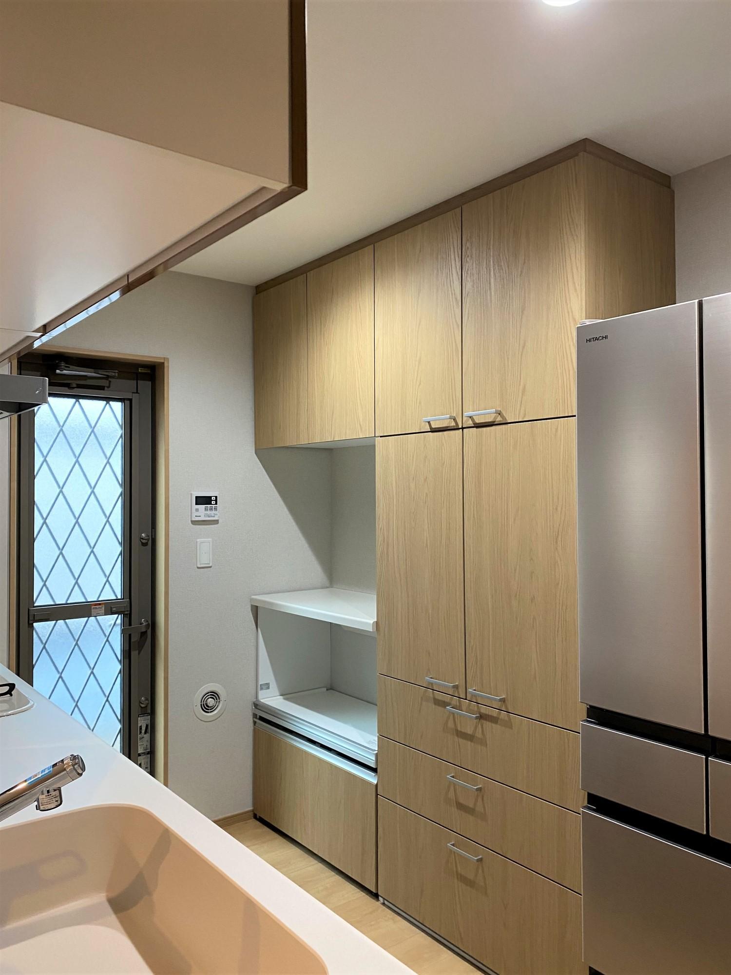 新築住宅を購入されたU様。お引越しをされる前に対面キッチンの背中側に、きちんとしたカップボードの設置をご希望でした。置く予定の家電や食器類などをあらかじめ考え前もって設置しておくと、お引越し後の片づけがスムーズなのでオススメです。 ▶ご採用LIXIL製品:シエラS/扉カラー:プレーンオーク