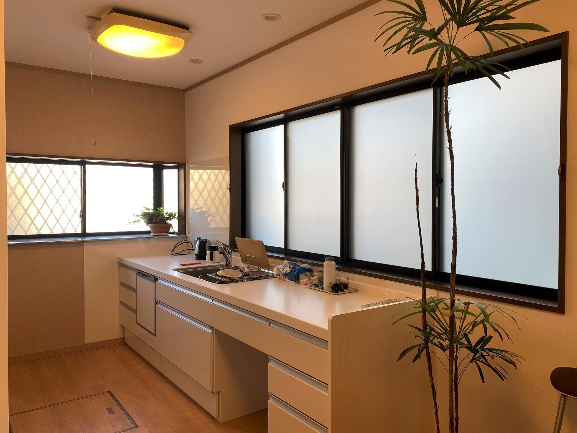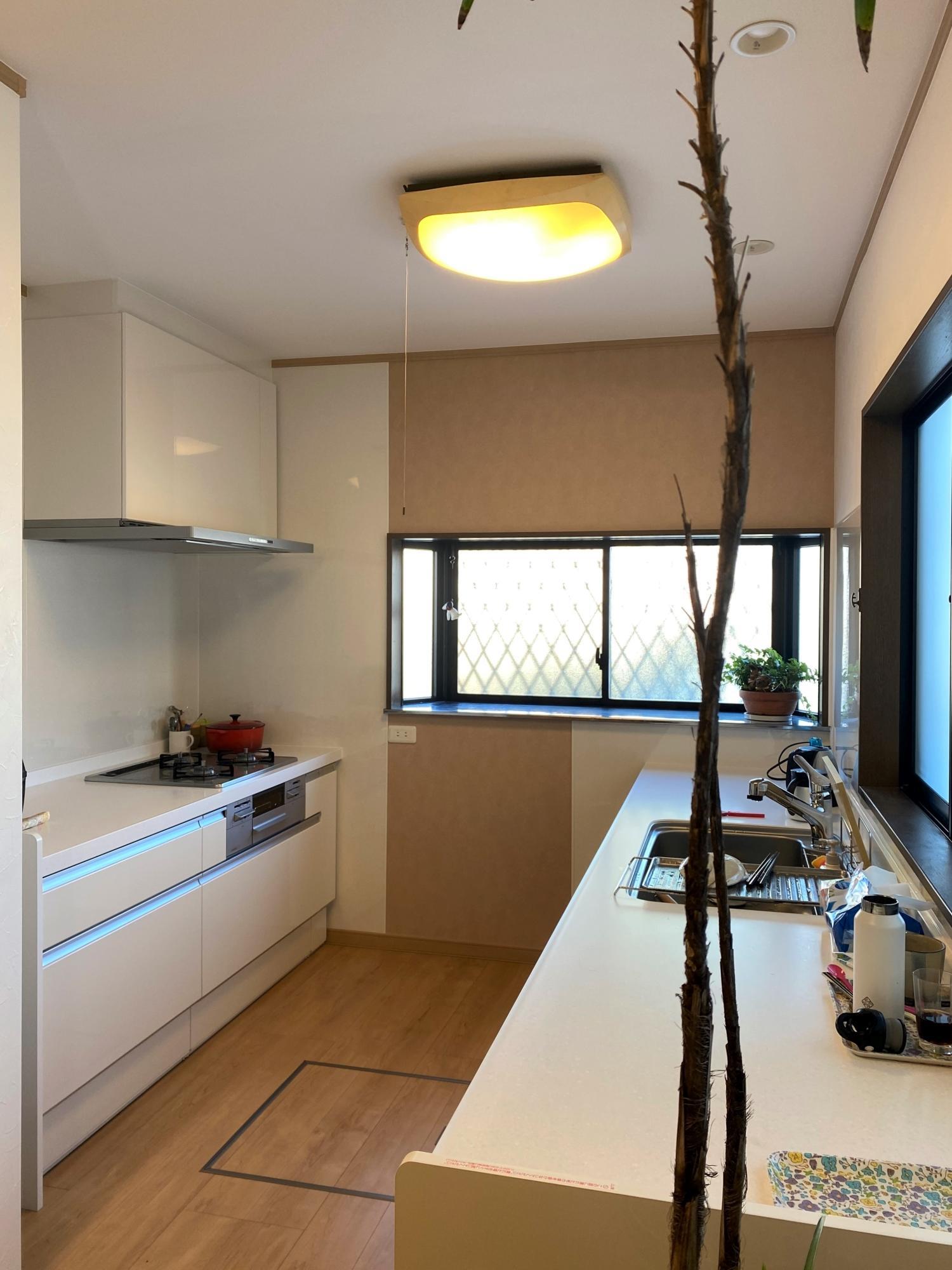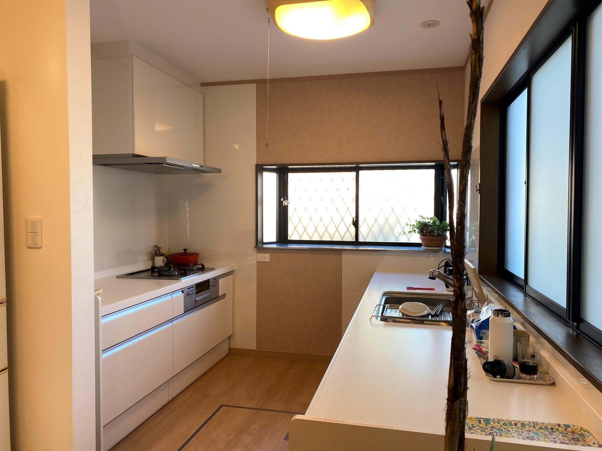 リビング・ダイニング空間に対して背を向けて料理をしているのがずっと気になっていらした奥様。キッチンを二列型のタイプに変更して、奥様と遊びに来られたお嬢様ご家族の皆様で、楽しく使えるキッチン空間を目指しました。 4枚建ての窓に面したシンク側は、家電を置いても十分な調理スペースがあり、来客があった際には大人数のお料理を配膳するためのスペースとしても広々お使いいただけます。窓に向かっている時間が増えたことで気にされていた外からの視線は、ガラスをフロストタイプに交換し、カーテンで閉め切らなくても適度に視線だけを遮り、室内を明るく保つことができました。 また、リビング側に隣接している和室との小さな段差も、フローリングを上張りすることで解消し、床が二重になって強度も増しました。ご主人様が「ログハウスのような雰囲気」がお好みでしたので、天然木(杉)を壁のアクセントに使用し、本物の木の良さを感じていただける空間になったかと思います。 これから経年変化を味わいながら、ご家族皆様で長く快適にご使用いただけましたら幸いです。