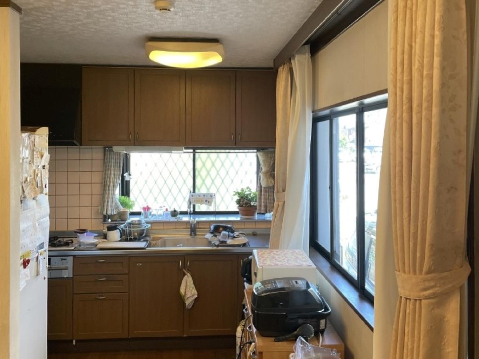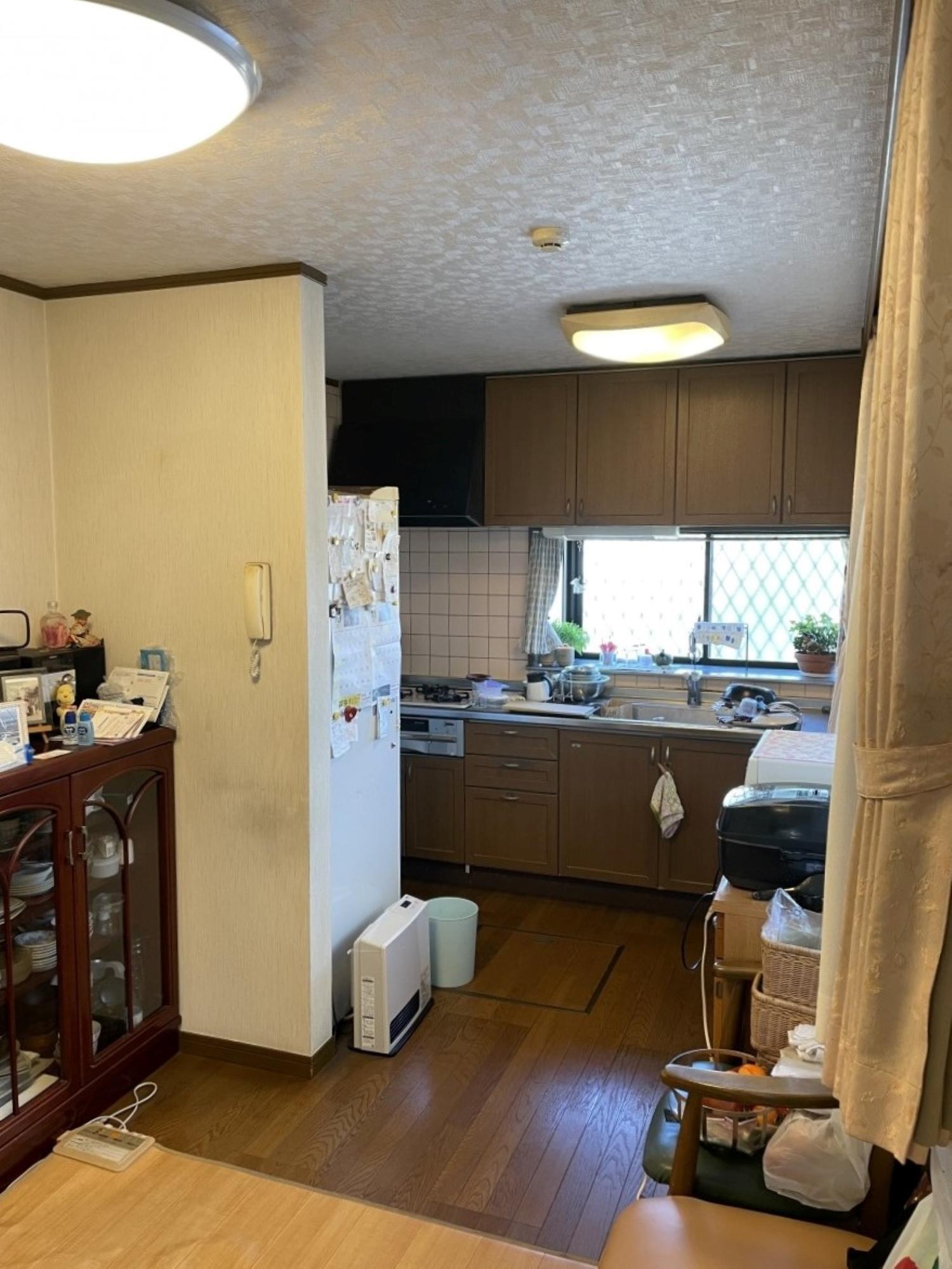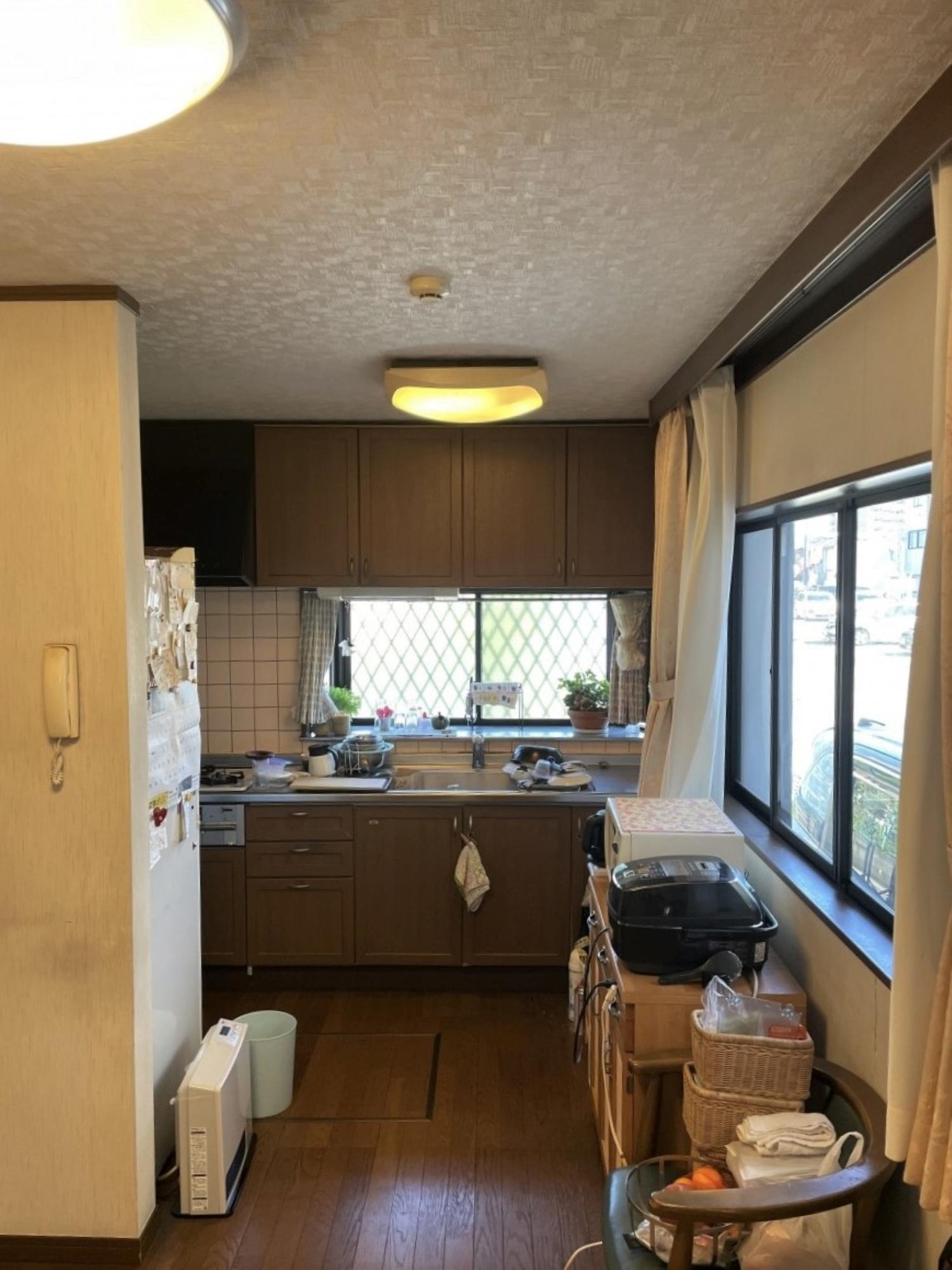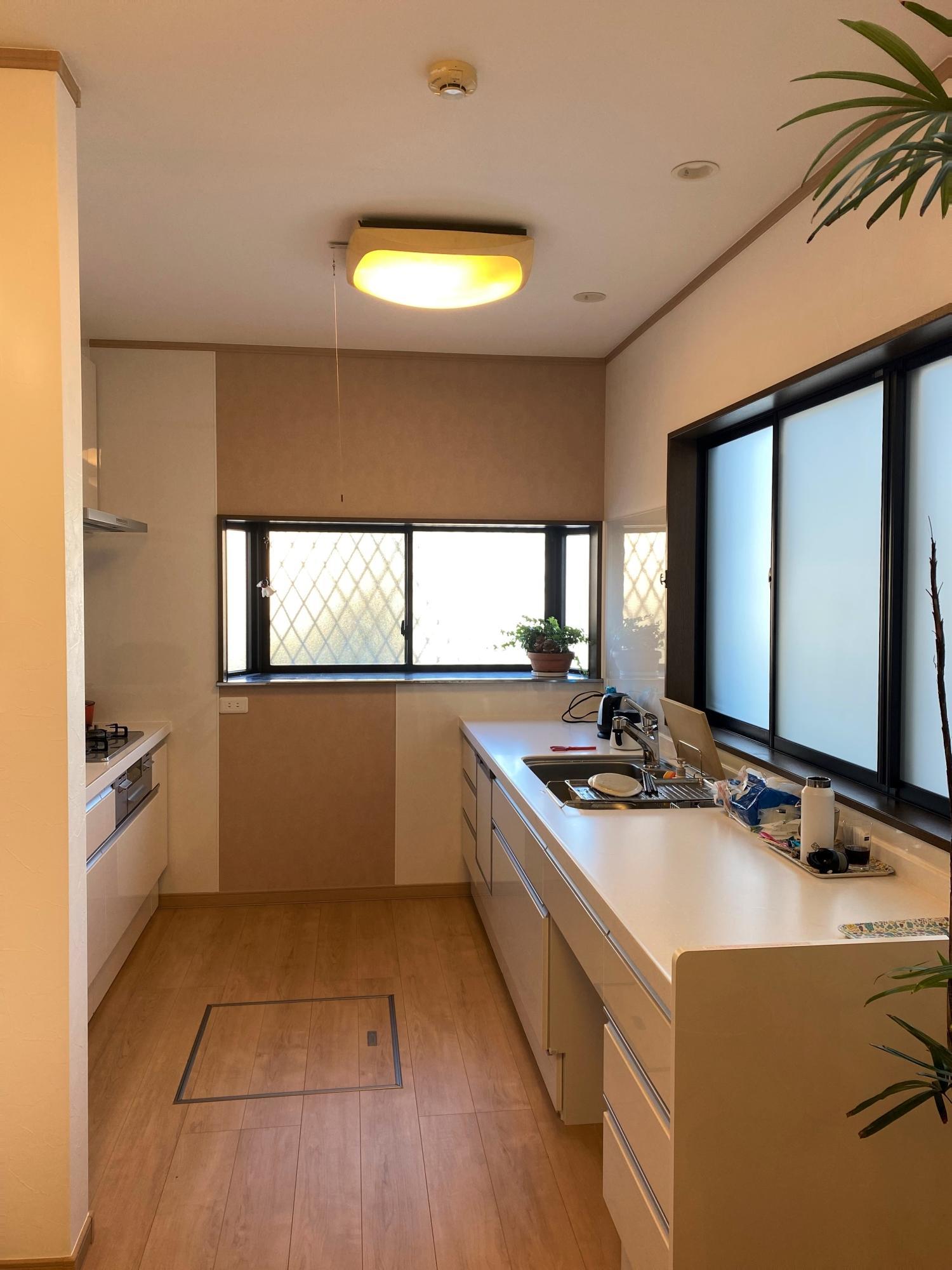 リビング・ダイニング空間に対して背を向けて料理をしているのがずっと気になっていらした奥様。キッチンを二列型のタイプに変更して、奥様と遊びに来られたお嬢様ご家族の皆様で、楽しく使えるキッチン空間を目指しました。 4枚建ての窓に面したシンク側は、家電を置いても十分な調理スペースがあり、来客があった際には大人数のお料理を配膳するためのスペースとしても広々お使いいただけます。窓に向かっている時間が増えたことで気にされていた外からの視線は、ガラスをフロストタイプに交換し、カーテンで閉め切らなくても適度に視線だけを遮り、室内を明るく保つことができました。 また、リビング側に隣接している和室との小さな段差も、フローリングを上張りすることで解消し、床が二重になって強度も増しました。ご主人様が「ログハウスのような雰囲気」がお好みでしたので、天然木(杉)を壁のアクセントに使用し、本物の木の良さを感じていただける空間になったかと思います。 これから経年変化を味わいながら、ご家族皆様で長く快適にご使用いただけましたら幸いです。