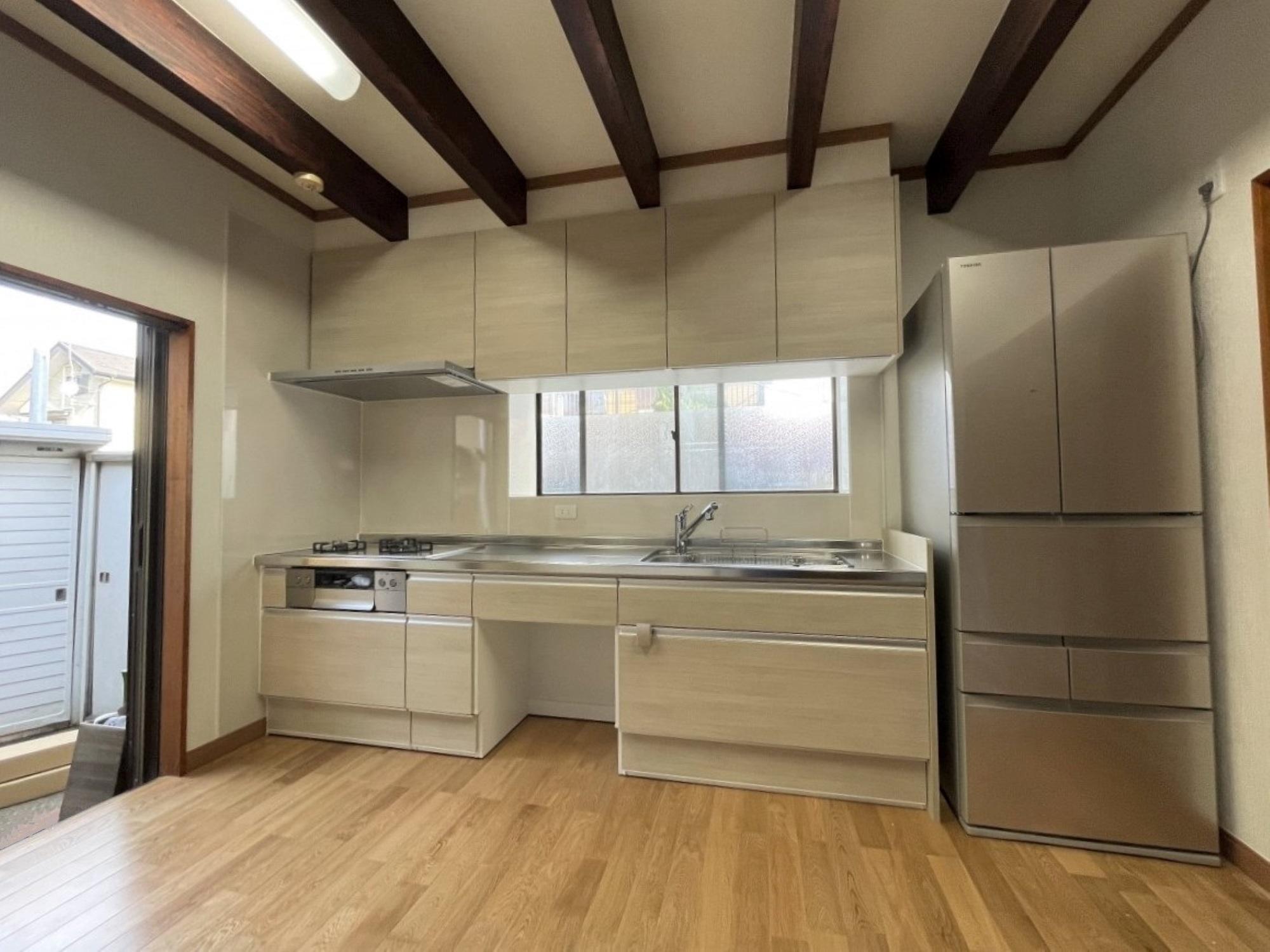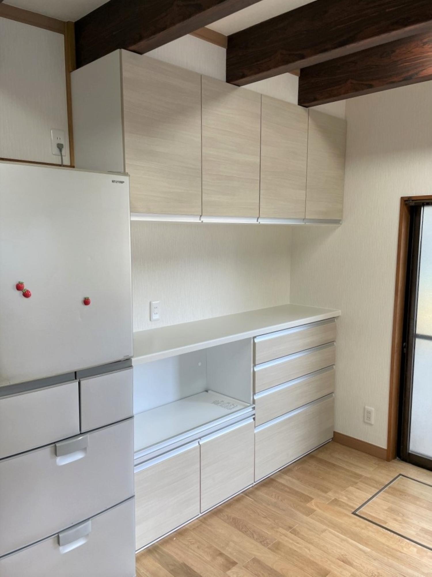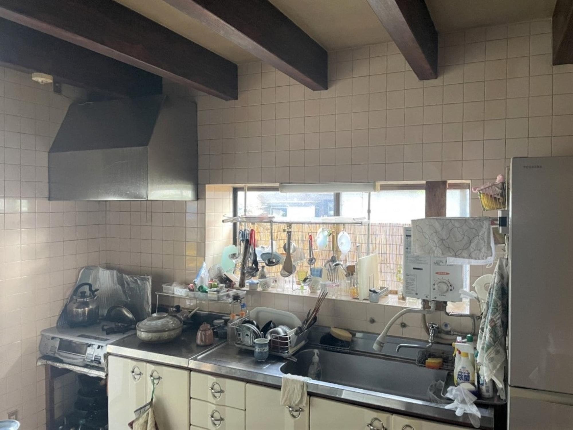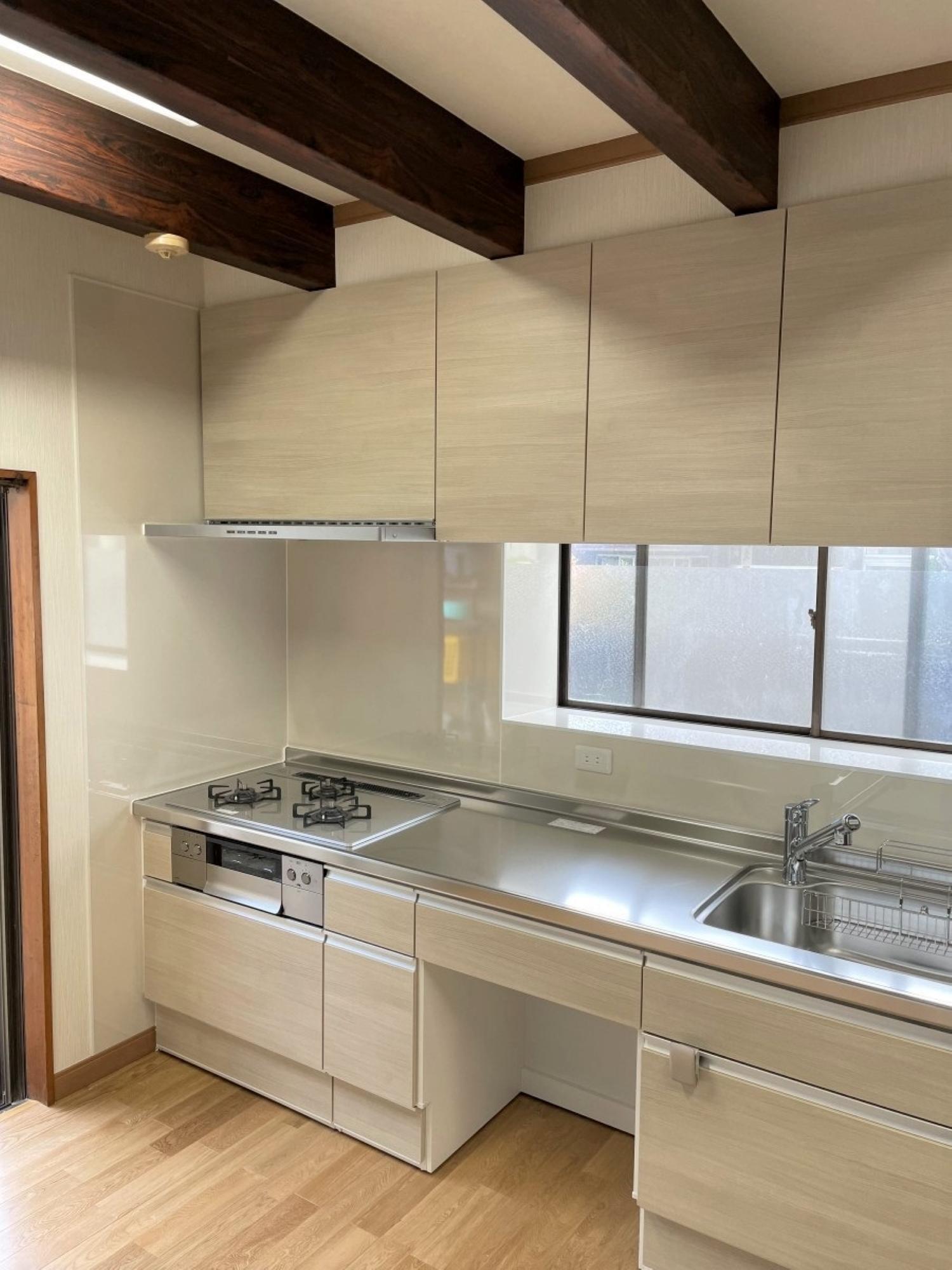 S様のリフォームのきっかけは、キッチンの床がブヨブヨになってしまったので直したいとのことでした。お話をうかがっていく中で「水は蛇口、お湯は瞬間湯沸かし器と別々になっているのを1つの水栓で操作できるようにしたい」「収納力を高めたい」などのご希望が出てきたため、キッチンの交換も含めたリフォームをご提案させていただきました。S様邸のキッチンは何といっても天井付近にある複数の梁が印象的です。梁下でもキッチンを設置するのに十分な高さが取れていることもあり、そのまま活かしてリフォームを行いました。昔ながらのセクショナルキッチン+タイル仕上げの壁からシステムキッチンになり、スッキリとした見た目とお掃除も格段にしやすくなりました。また内装工事を行う前に断熱補強工事を行い、寒さを気にされていらした奥様の身体への負担も軽減。床はナラの無垢材で仕上げ、見た目も足触りも心地よいものに。これからは今まで以上に気持ちよくキッチンをお使いいただければと思います。