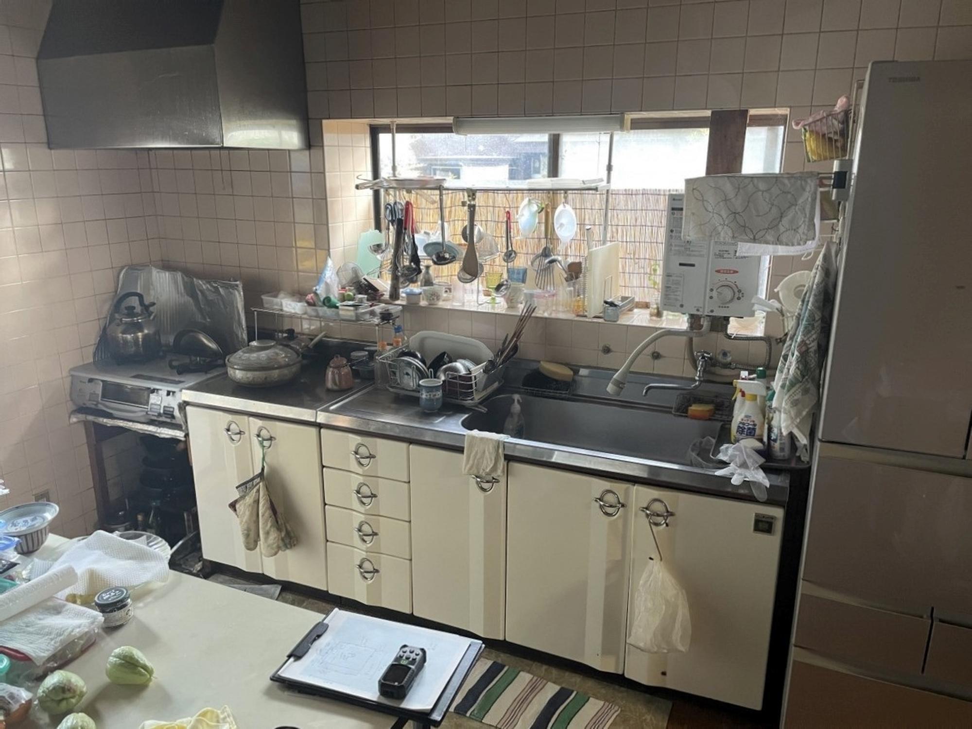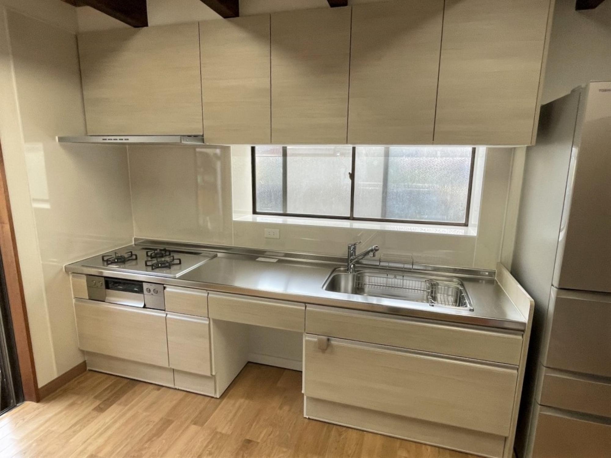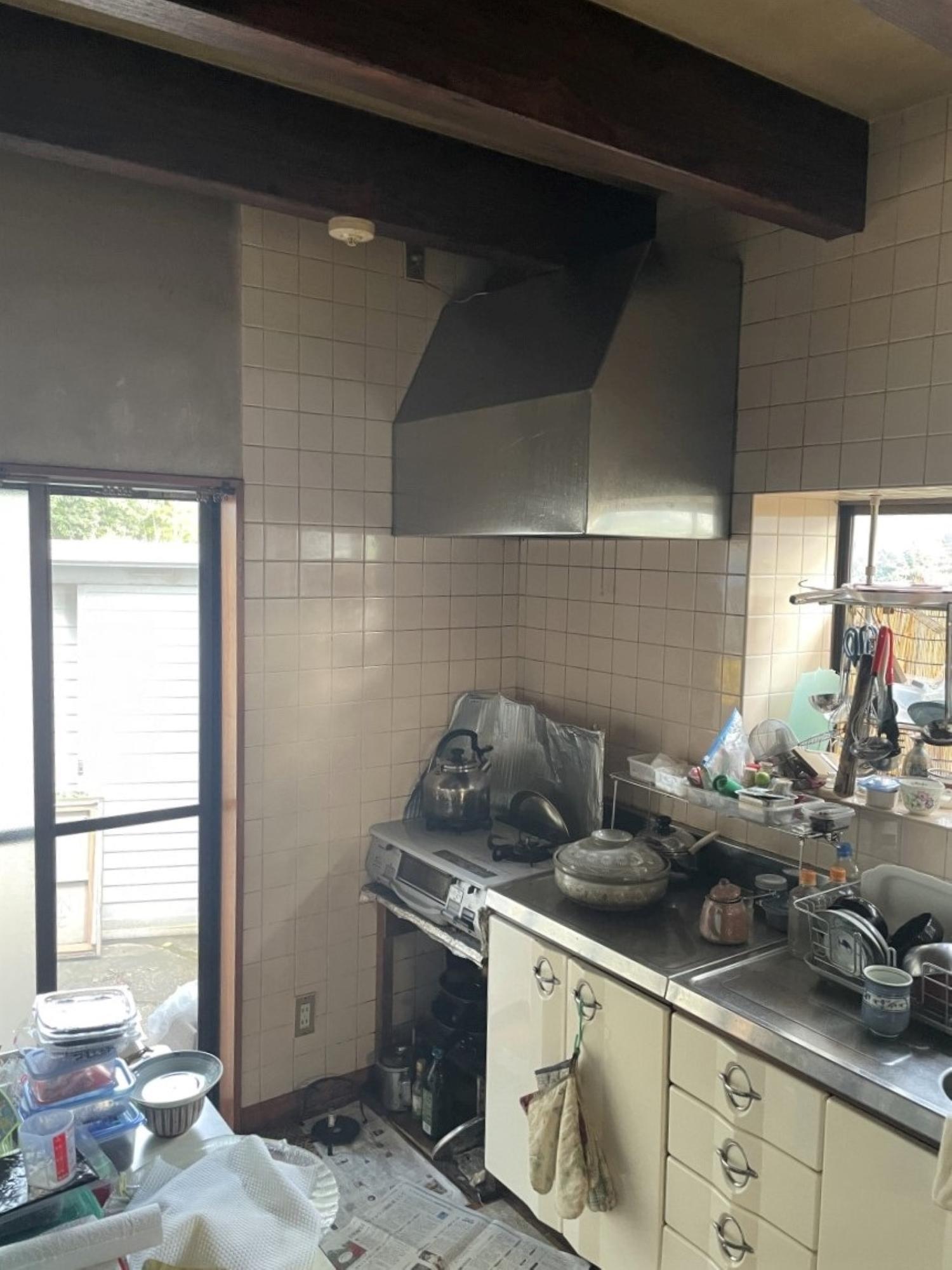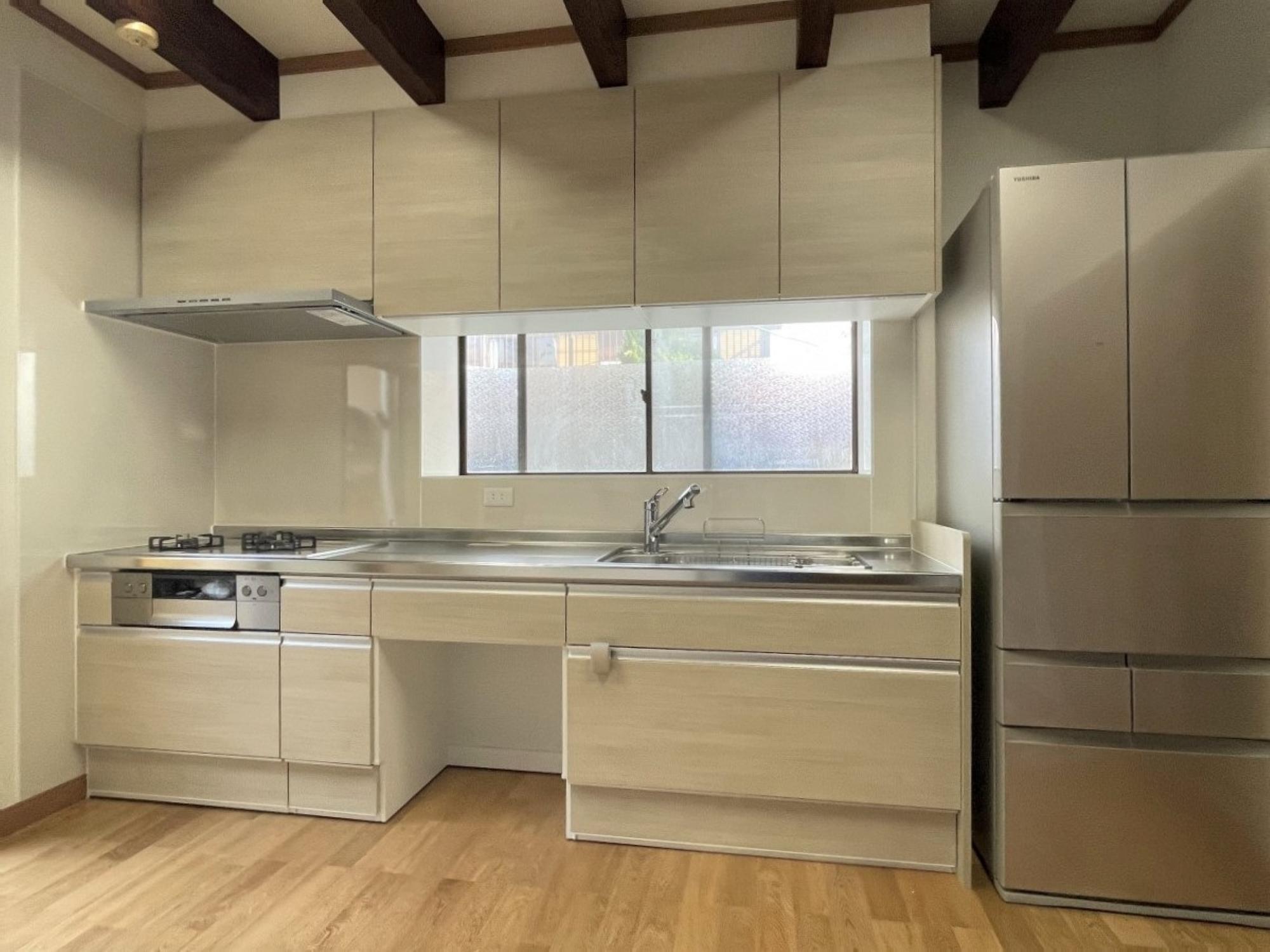 S様のリフォームのきっかけは、キッチンの床がブヨブヨになってしまったので直したいとのことでした。お話をうかがっていく中で「水は蛇口、お湯は瞬間湯沸かし器と別々になっているのを1つの水栓で操作できるようにしたい」「収納力を高めたい」などのご希望が出てきたため、キッチンの交換も含めたリフォームをご提案させていただきました。S様邸のキッチンは何といっても天井付近にある複数の梁が印象的です。梁下でもキッチンを設置するのに十分な高さが取れていることもあり、そのまま活かしてリフォームを行いました。昔ながらのセクショナルキッチン+タイル仕上げの壁からシステムキッチンになり、スッキリとした見た目とお掃除も格段にしやすくなりました。また内装工事を行う前に断熱補強工事を行い、寒さを気にされていらした奥様の身体への負担も軽減。床はナラの無垢材で仕上げ、見た目も足触りも心地よいものに。これからは今まで以上に気持ちよくキッチンをお使いいただければと思います。