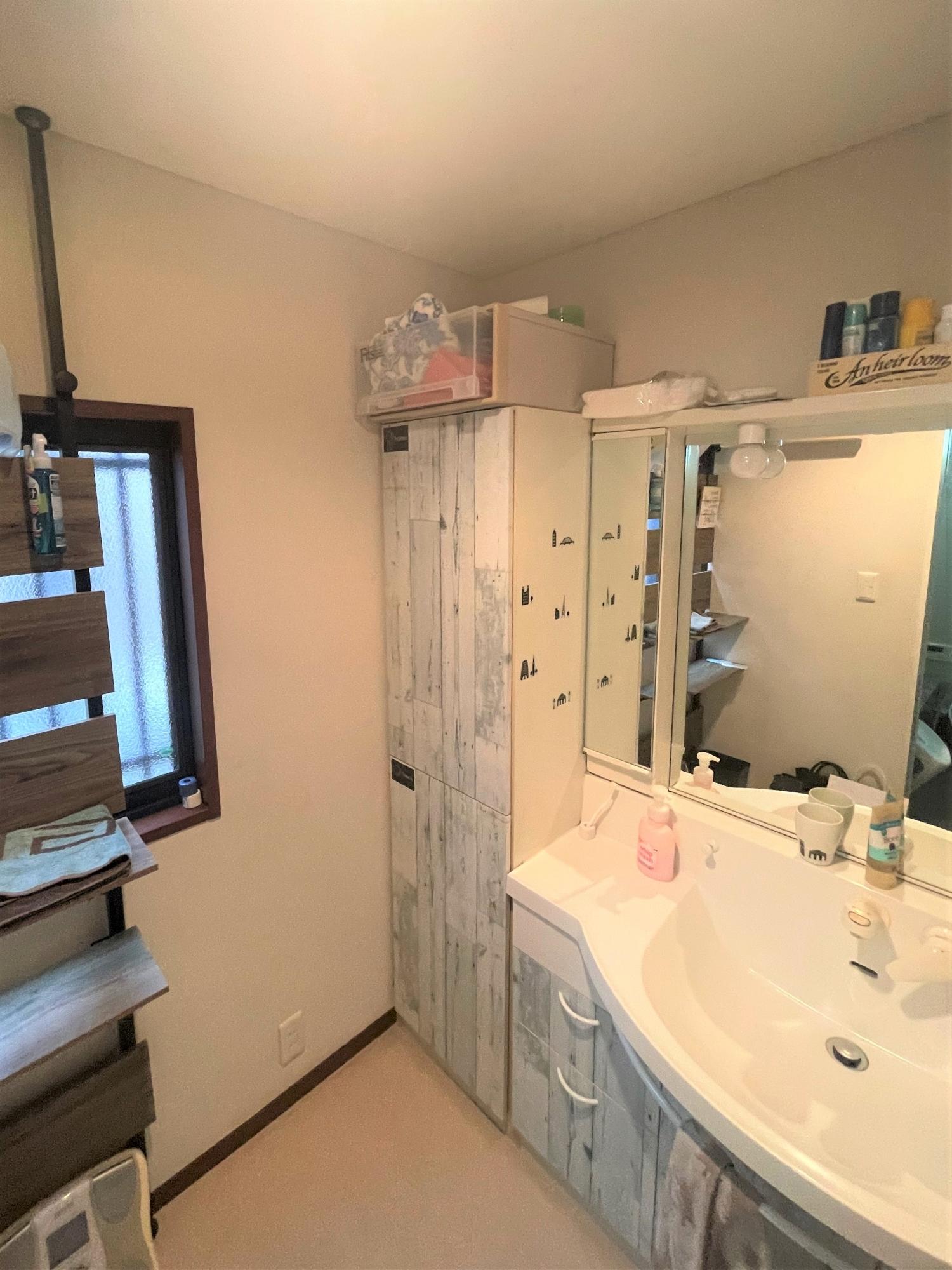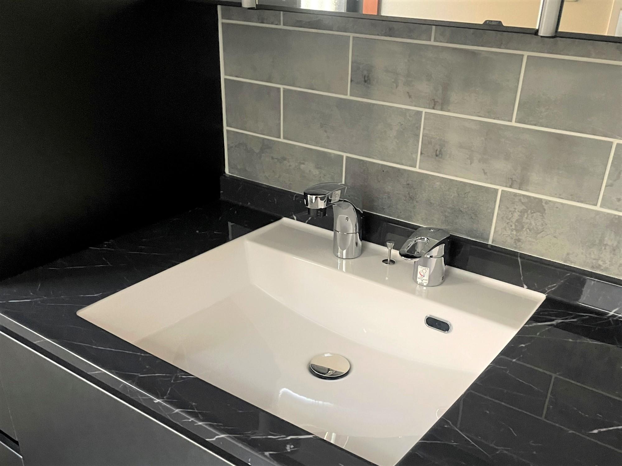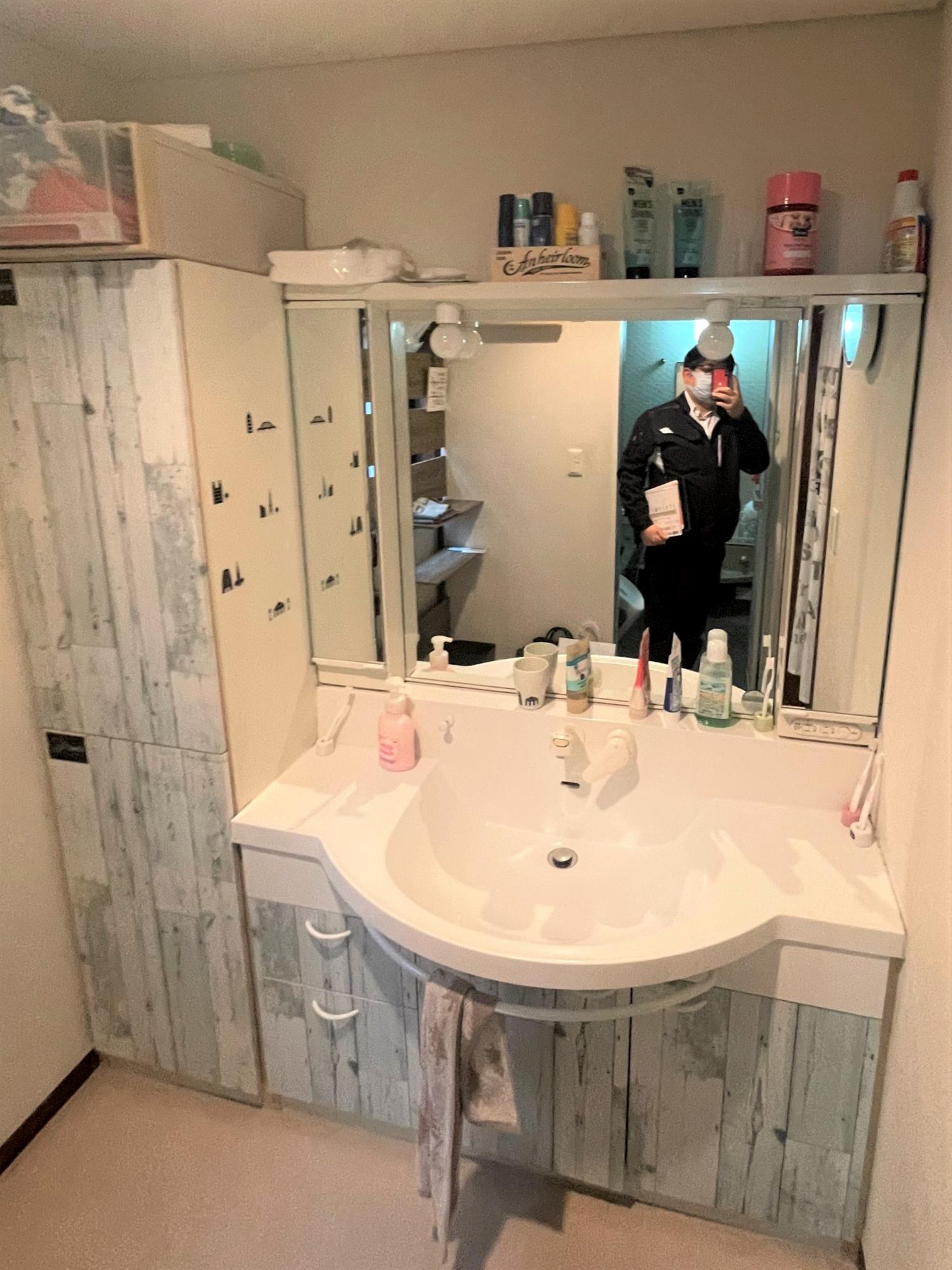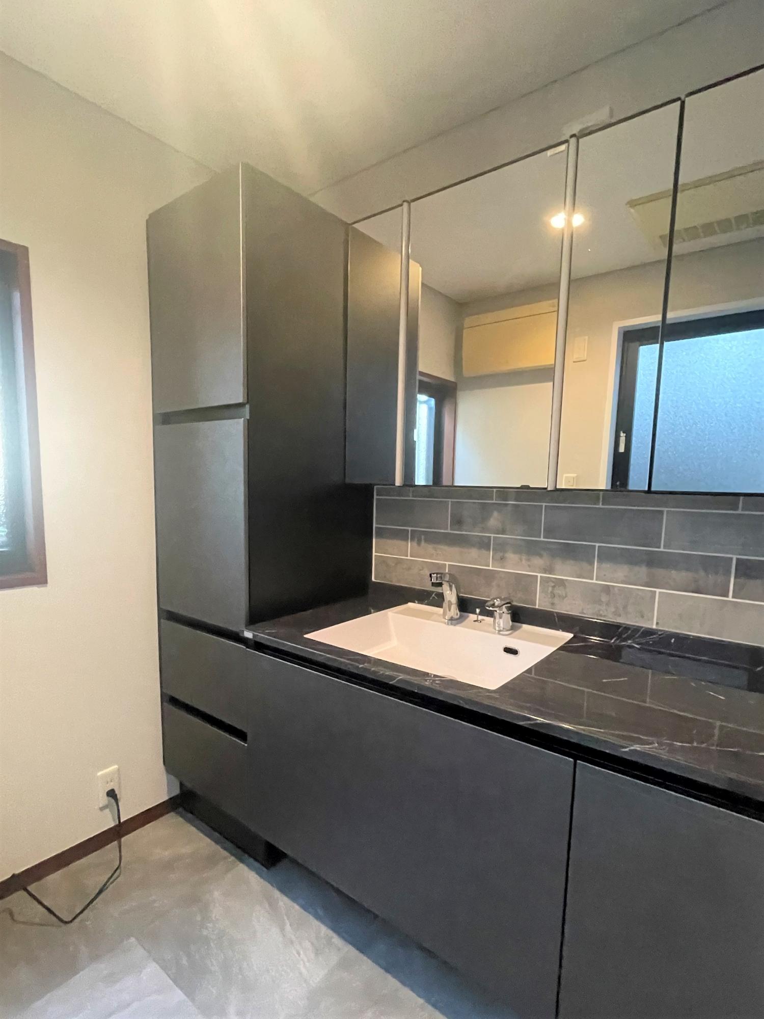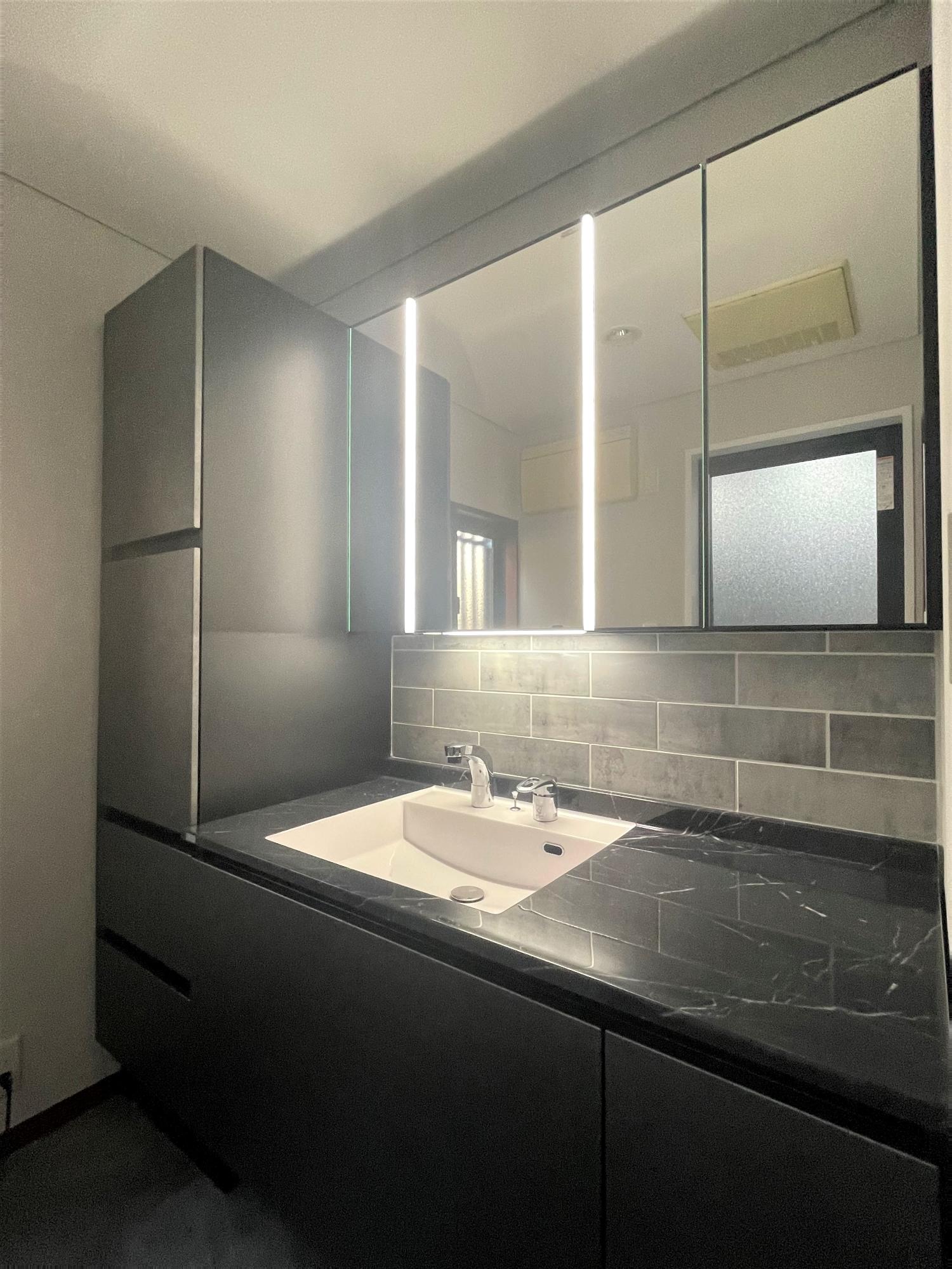 今回水まわりの全体的なリフォームをご依頼いただきましたK様。グレーを基調としたモノトーンのモダンで上質な空間にトータルコーディネート。洗面室も、化粧台のダークグレー~ブラックをアクセントに、淡いグレーの壁紙やストーン調の床でスッキリとした印象にまとまっています。通常キッチンパネルなどで仕上げることの多い化粧台のバックパネル部分には、本物のタイルを張りワンランク上の佇まいに。水まわり4つの空間(キッチン・浴室・洗面・トイレ)が比較的近い間取りなので、統一感があると住んでいて一層気持ちの良いものですね。