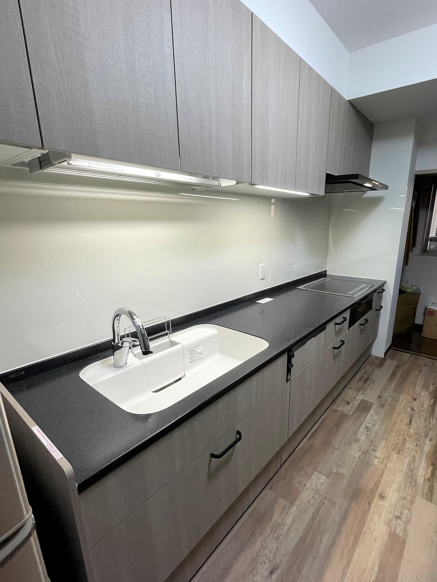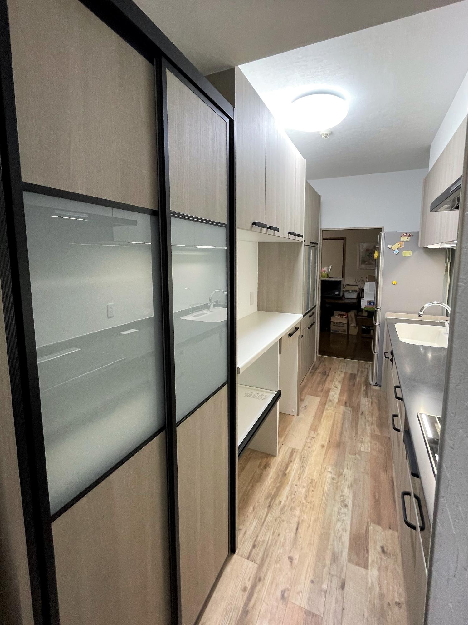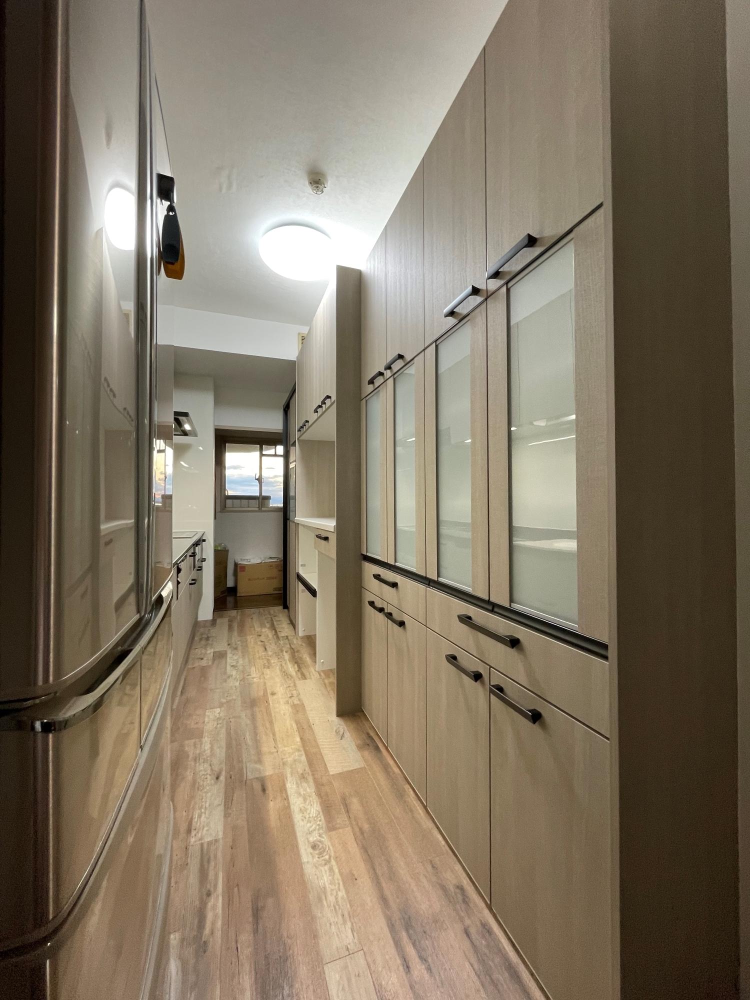 O様邸のキッチンは、横幅4.2m✖奥行き1.8mのやや細長いお部屋。そこにキッチンに必要な調理道具や食器、家電製品・食材のストックなどをすべて使いやすく収納できるようにリフォームさせていただきました。 「なるべく生活感が出ないように隠したい」という奥様のご希望で、オープンな収納は極力避け、扉付タイプにてプランニング。キッチン本体とカップボードの間の動作スペースが狭くなってしまうのを、カップボードの奥行きを変えることで解消しながら、引出しをメインとした十分な収納力を確保しました。 扉や床の色が明るくなったことで、大きくなったカップボードの圧迫感もなく、スッキリとそして優しい印象の空間に仕上がったと思います。