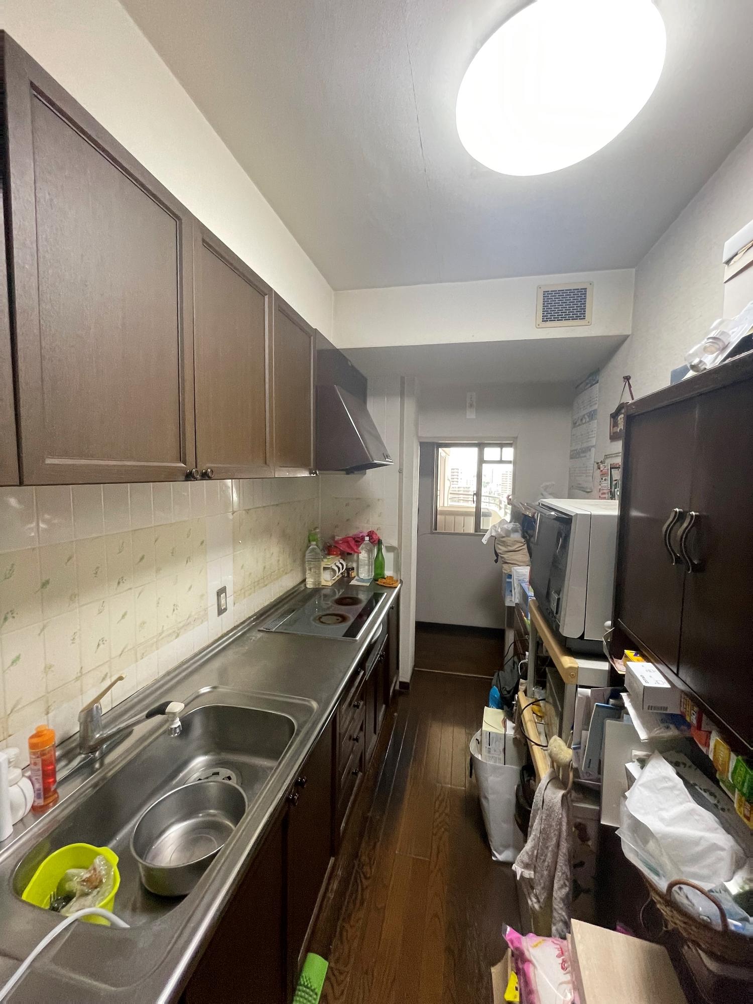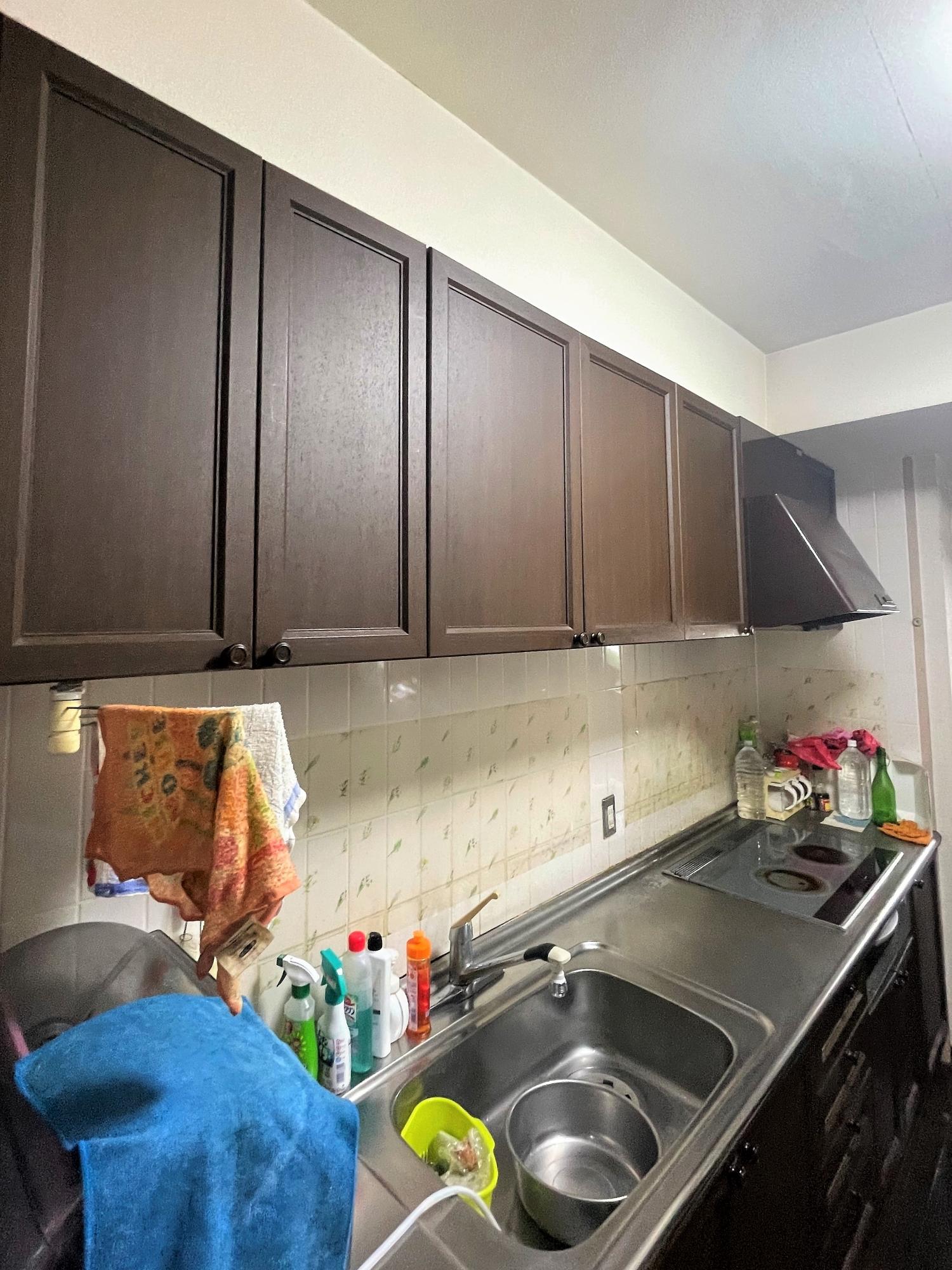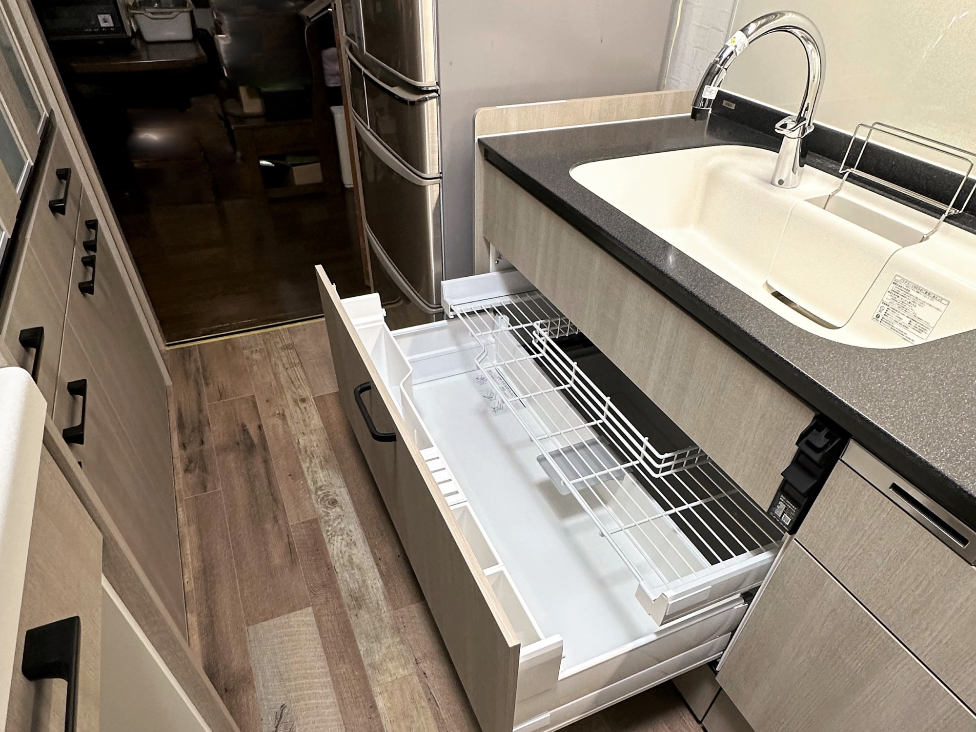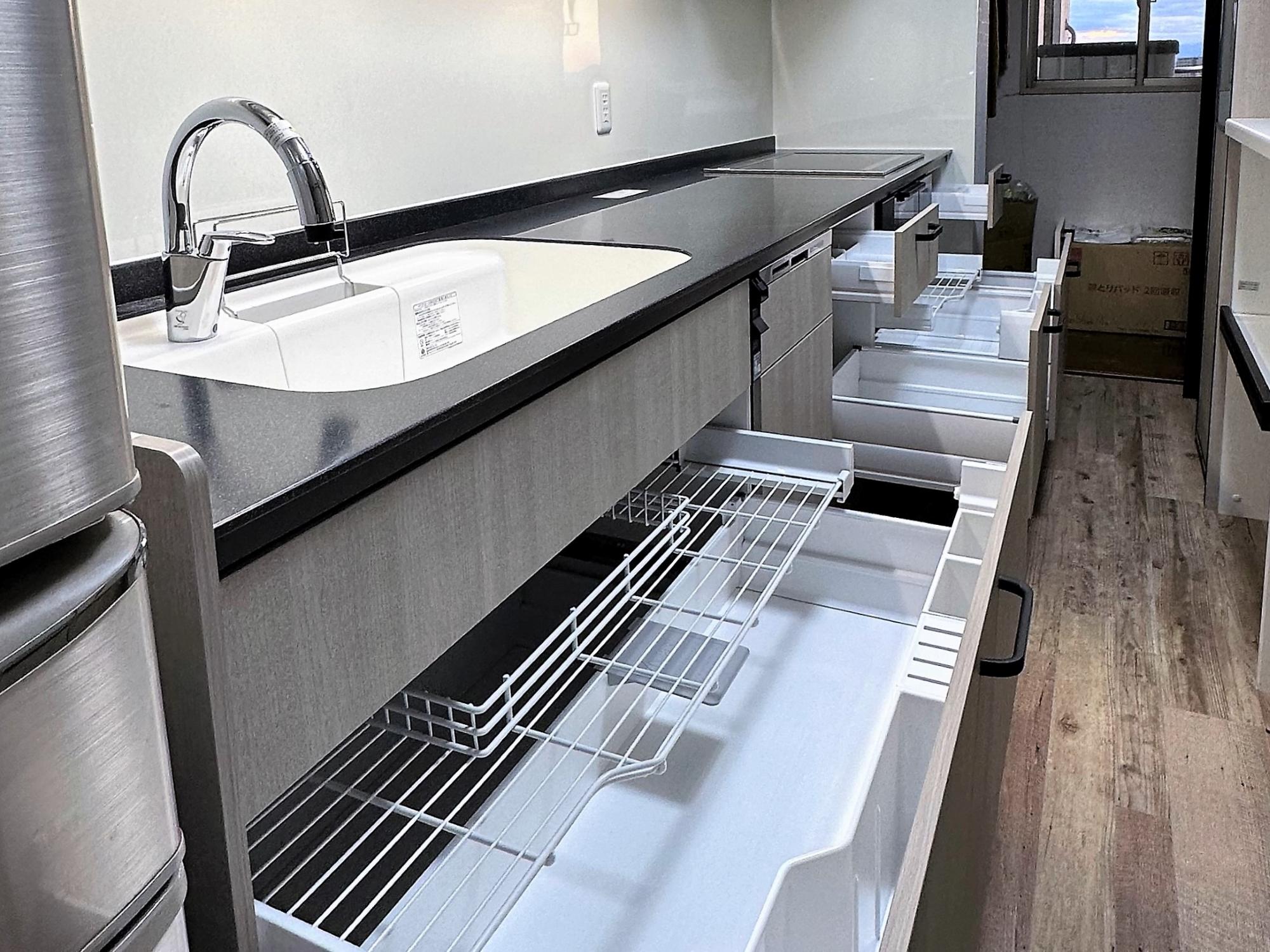 O様邸のキッチンは、横幅4.2m✖奥行き1.8mのやや細長いお部屋。そこにキッチンに必要な調理道具や食器、家電製品・食材のストックなどをすべて使いやすく収納できるようにリフォームさせていただきました。 「なるべく生活感が出ないように隠したい」という奥様のご希望で、オープンな収納は極力避け、扉付タイプにてプランニング。キッチン本体とカップボードの間の動作スペースが狭くなってしまうのを、カップボードの奥行きを変えることで解消しながら、引出しをメインとした十分な収納力を確保しました。 扉や床の色が明るくなったことで、大きくなったカップボードの圧迫感もなく、スッキリとそして優しい印象の空間に仕上がったと思います。