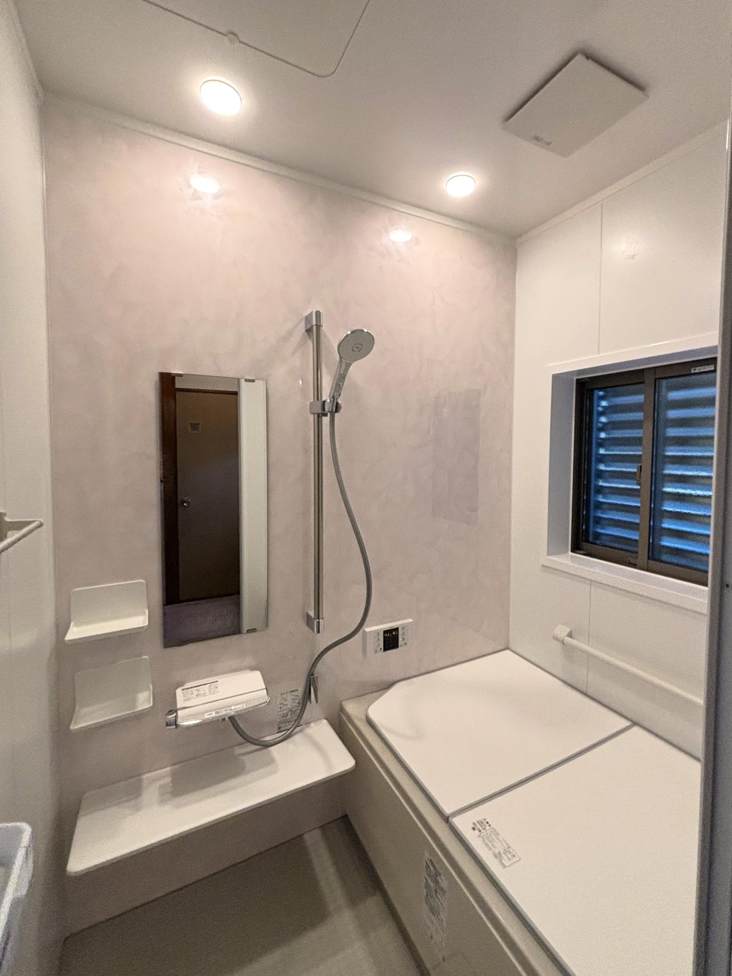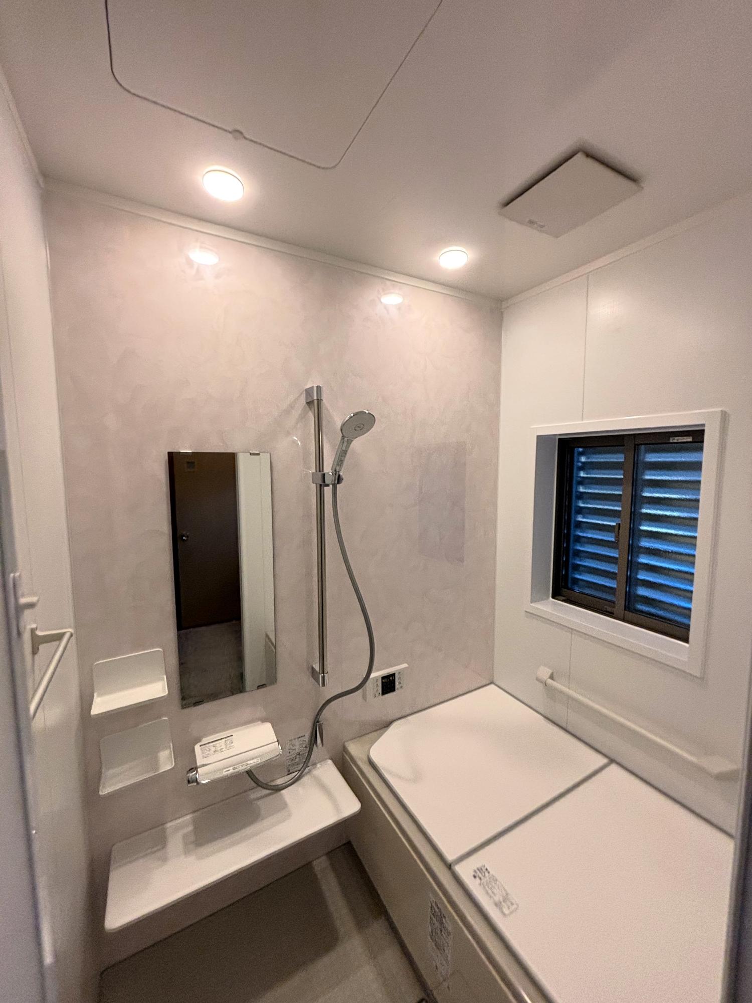 タイル張りに大きな窓で、冬の寒さが非常に堪えるとおっしゃっていたN様。 さらに自動湯張りではない給湯器をご使用だったため、 お湯をはるのにも近くで待ち構えていなければいけなかったり、 ステンレス製の湯舟はお湯がすぐに冷めてしまったりと、 なかなか快適とはいえなかった浴室。 そんなN様に、入りたいと思ったときに、もっと気兼ねなく 快適なお風呂時間を楽しんでいただくためのリフォームをご提案させていただきました。 一部変則的な形をしていた浴室は、浴槽側の間仕切り壁を隣の部屋側へ少しずらし、 断熱施工を施したうえで、ユニットバスに交換しました。 壁をずらしたことで既存の浴槽より20cm以上長くなり、 湯舟にゆったりと浸かっていただけるようになりました。 対して寒さを感じやすい窓は、既存よりも小さい断熱サッシに交換。 可動ルーバー付なので、市販のブラインド等を設置せずに、 目隠しと換気をレバーでサッと切り替えられて、お手入れも簡単です。 もちろんお湯張りはリモコンのボタンひとつ!自動ではれるようになりました。 これからは寒さや煩わしさのない、快適なお風呂時間を 存分に楽しんでいただけましたら幸いです。
