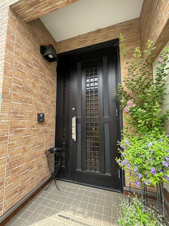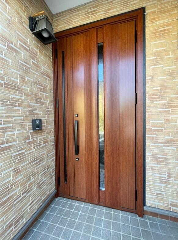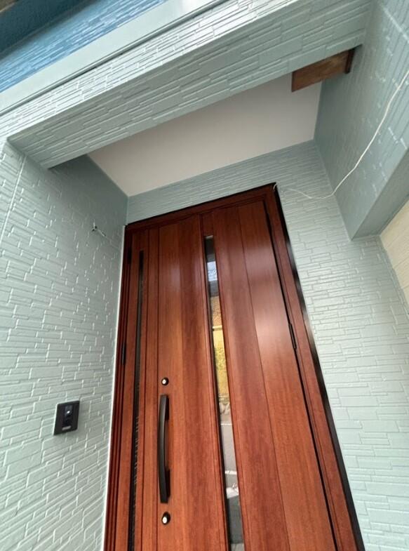 ご採用商品:LIXILリシェントK2断熱仕様 ドア本体:G12型 ポートマホガニー ハンドル:A3A型 玄関ドア施工後、外壁塗装工事を行いました
