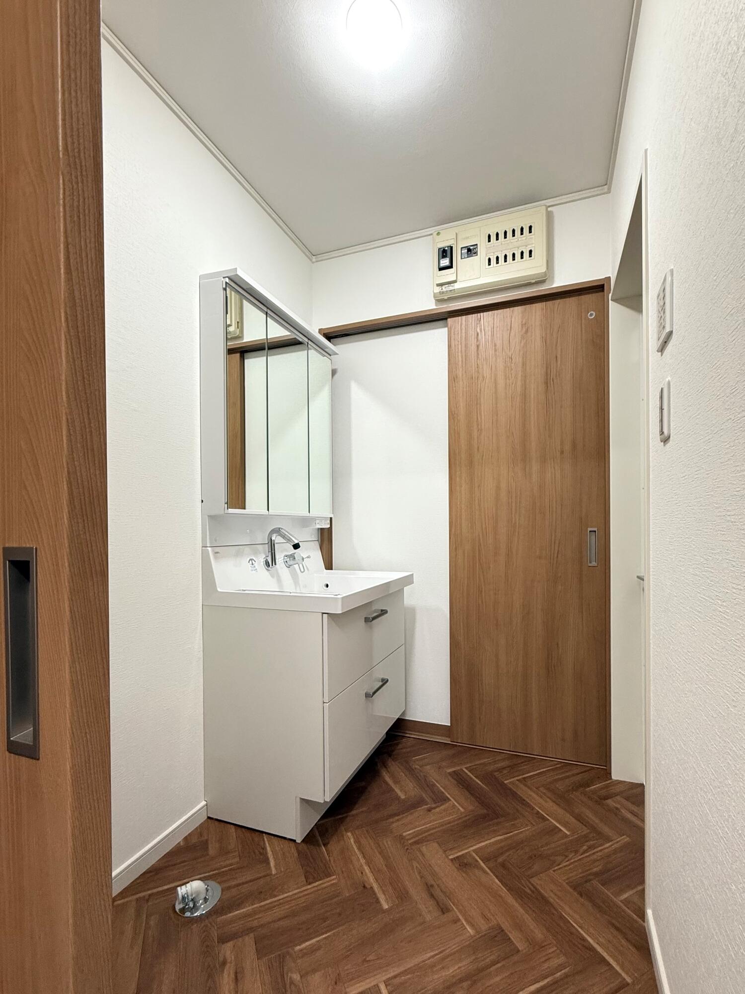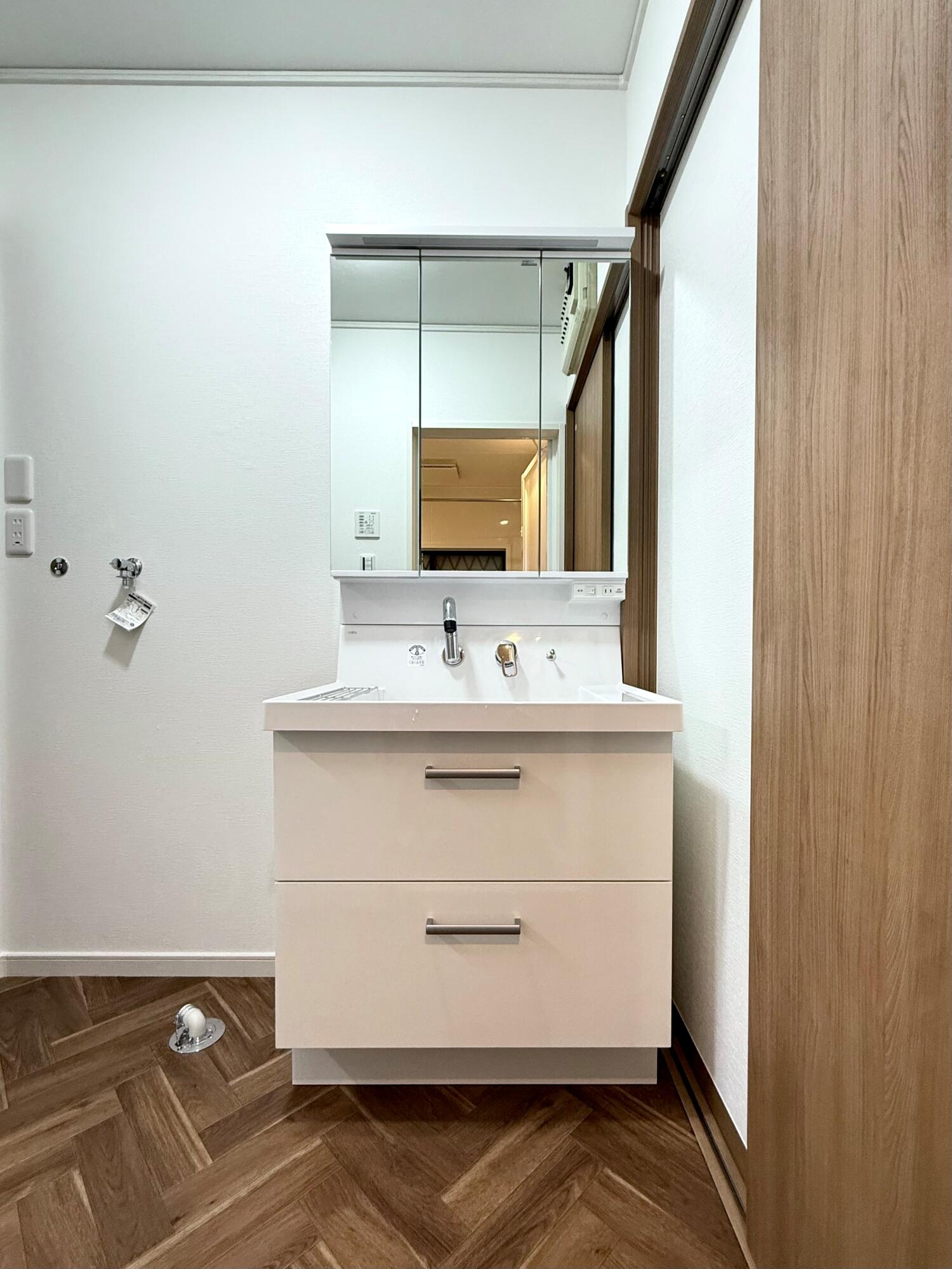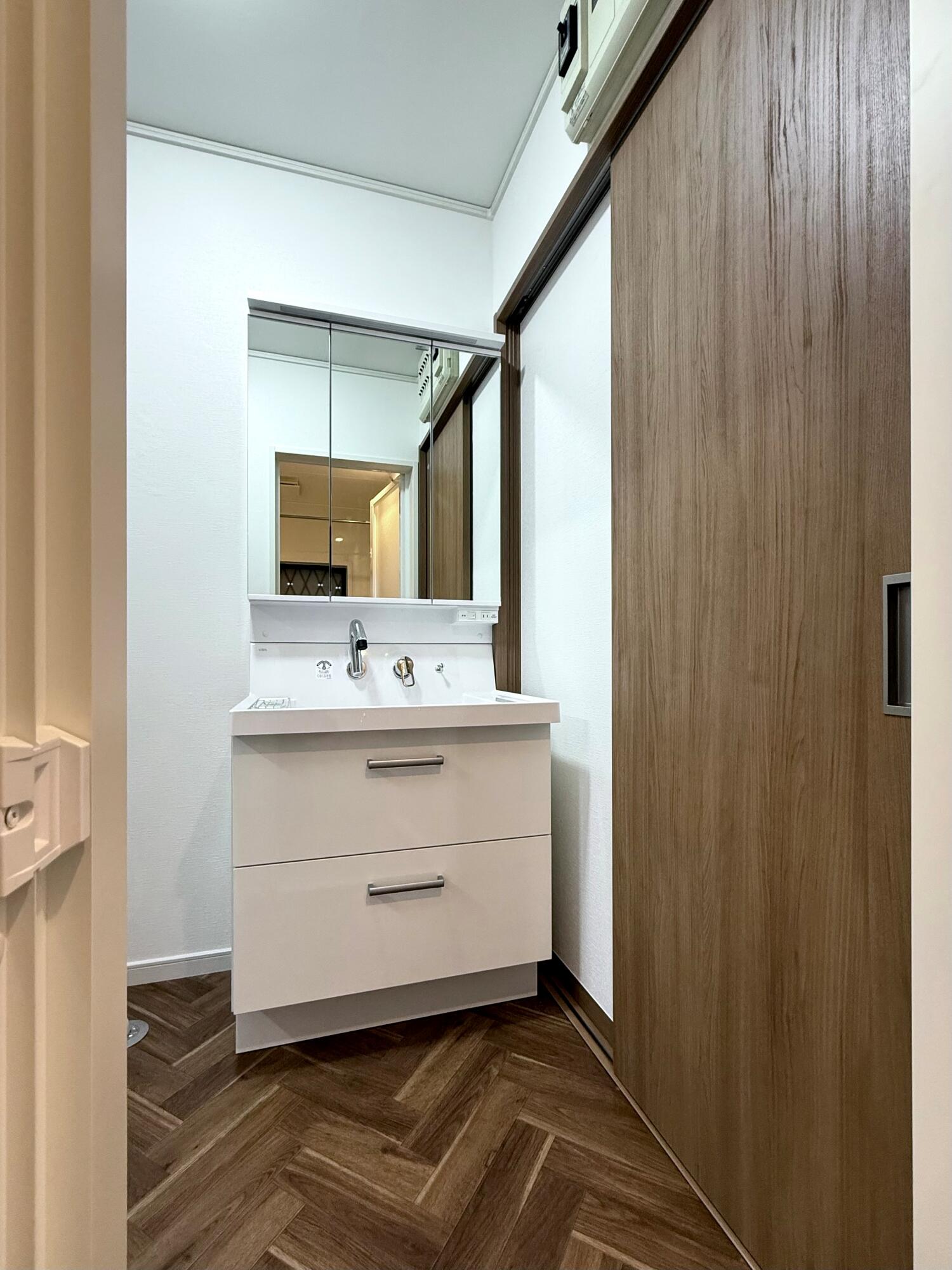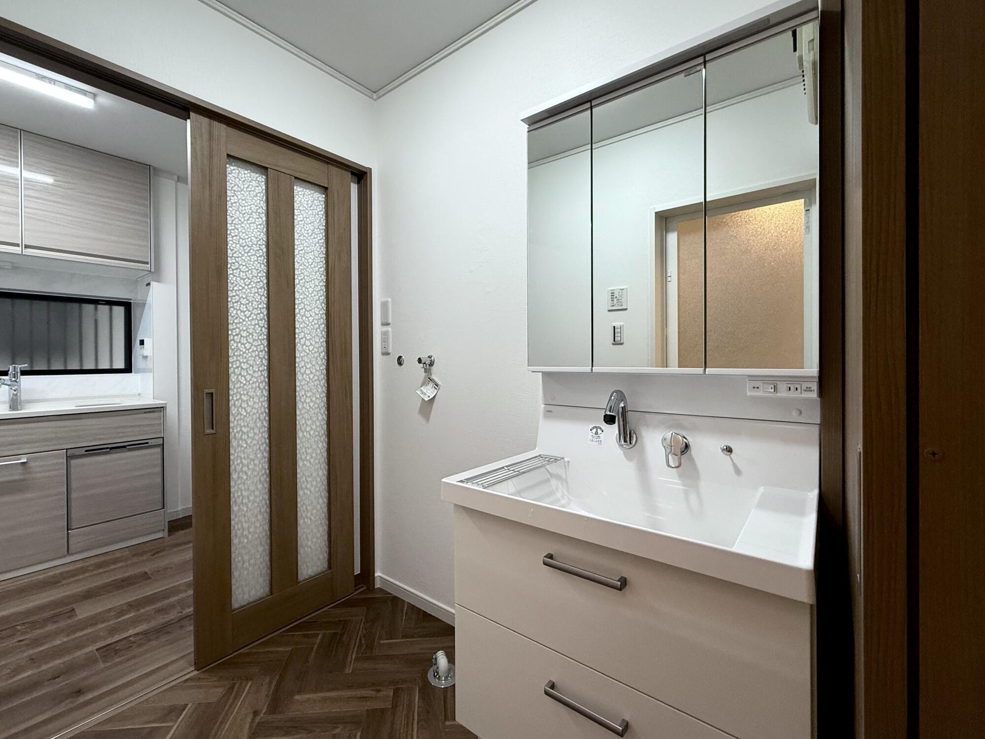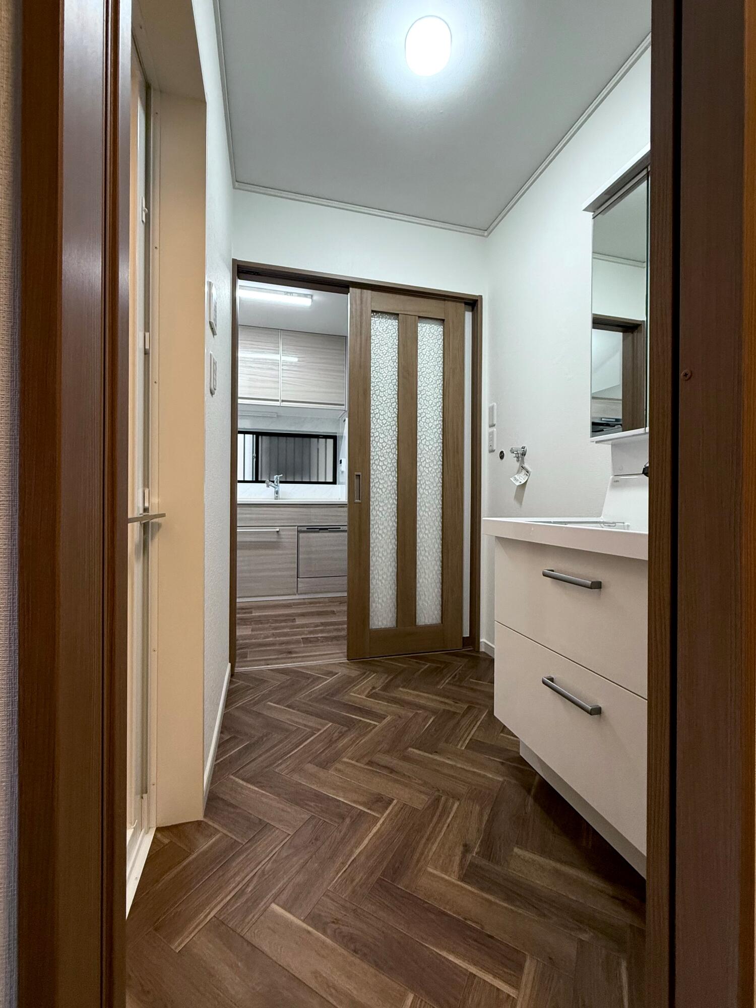 中古住宅を購入され、水まわり設備を中心にお家全体をリフォームされたA様。 洗面室はもともと玄関ホール側とLDK側の2方向から出入りできる動線の非常に良い間取りでした。一方で、ドアが2つある分壁が少ないために限られたスペースを有効に使える工夫が必要でした。 収納の扉部分が壊れてしまっていた洗面化粧台は、引出しタイプへ交換し出し入れもしやすく収納力もアップ。整髪剤や化粧品類などの細かいものは見えないようにミラー収納の中へすっきりと!鏡は映り込みもあってお部屋を広く見せる効果もありますね。 また、2つの引戸は横幅のサイズをギリギリまで広げて通れる幅を拡張。 洗濯機の入れ替え時だけでなく、普段の生活でもスムーズに通りやすくなったと思います。 お部屋の色合いも、お家全体のナチュラルな雰囲気をそのままに、ヘリンボーン柄の床が良いアクセントになっていて素敵ですね!
