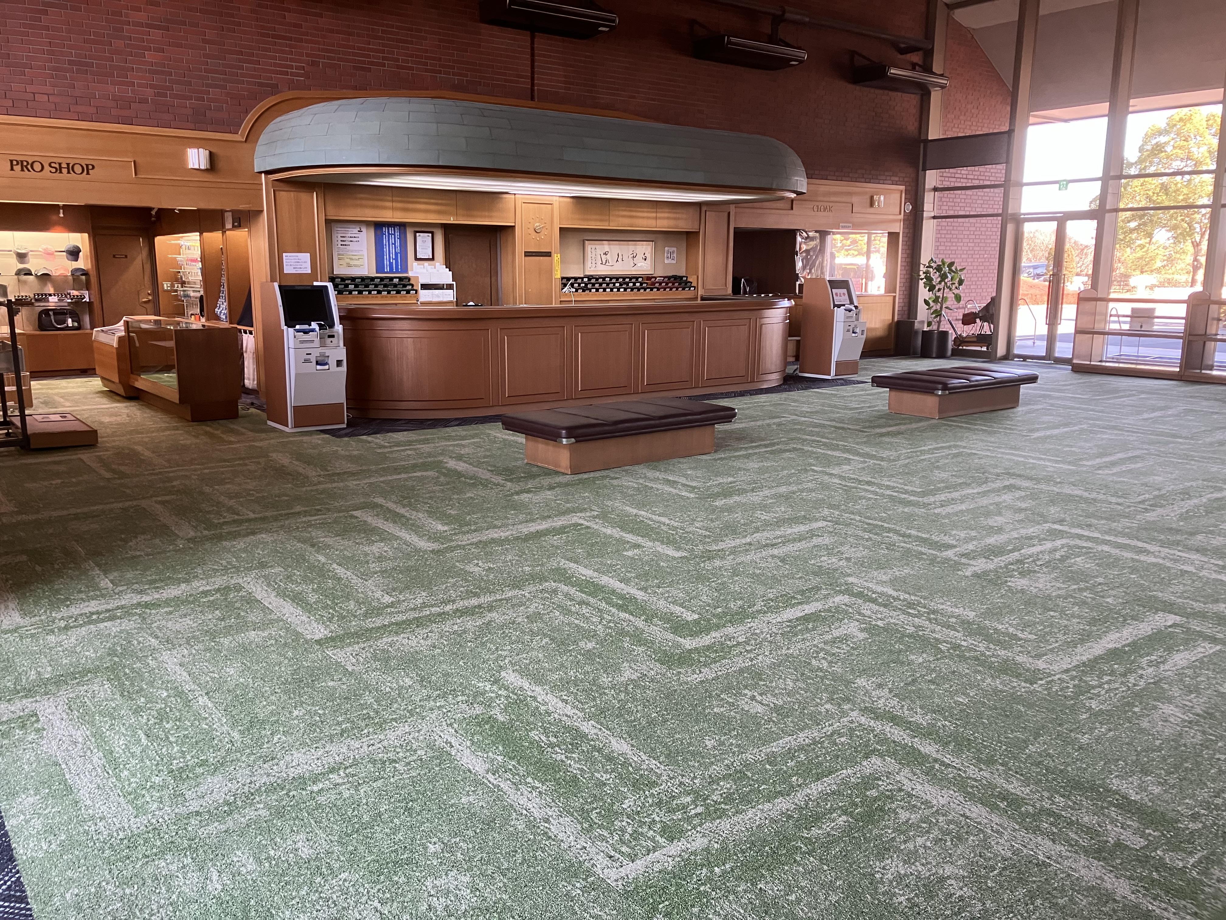 エントランス部分のカーペット交換工事です。 色合いは明るいレッドから落ち着いて高級感あるグリーンに変わりました。