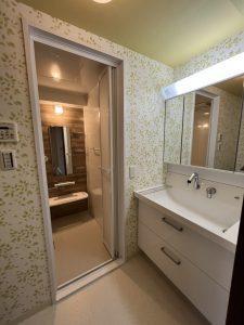 脱衣所内装も天井はイエロ-のクロスに壁はリーフ柄のクロスを選択していただきおしゃれな仕上がりになりました。