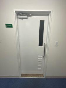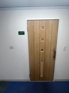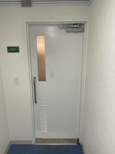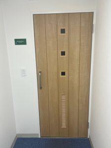 以前の扉よりモダンになり、かつ開き方を逆にして取り付けたので手を洗って出るときに押しながら開けられるので把手を触らずに開けられる工夫も施しました。