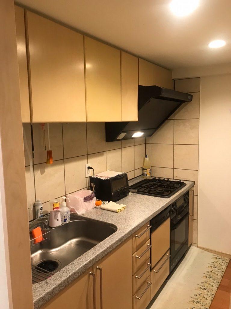 キッチンの壁タイルの目地部分やガスコンロの汚れもひどく、また背面収納も物でたくさんなめすっきりしたとのことでご相談を受けました。