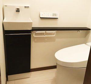 タンクレストイレでスッキリし、前方に新設した手洗いで手も洗いやすくなり大変喜んで頂けました。また、エコカラットプラスを工夫施工し、費用を抑えて階段周りもキレイになりました。 エコカラットプラスはこんな使い方にも対応出来て便利ですね!