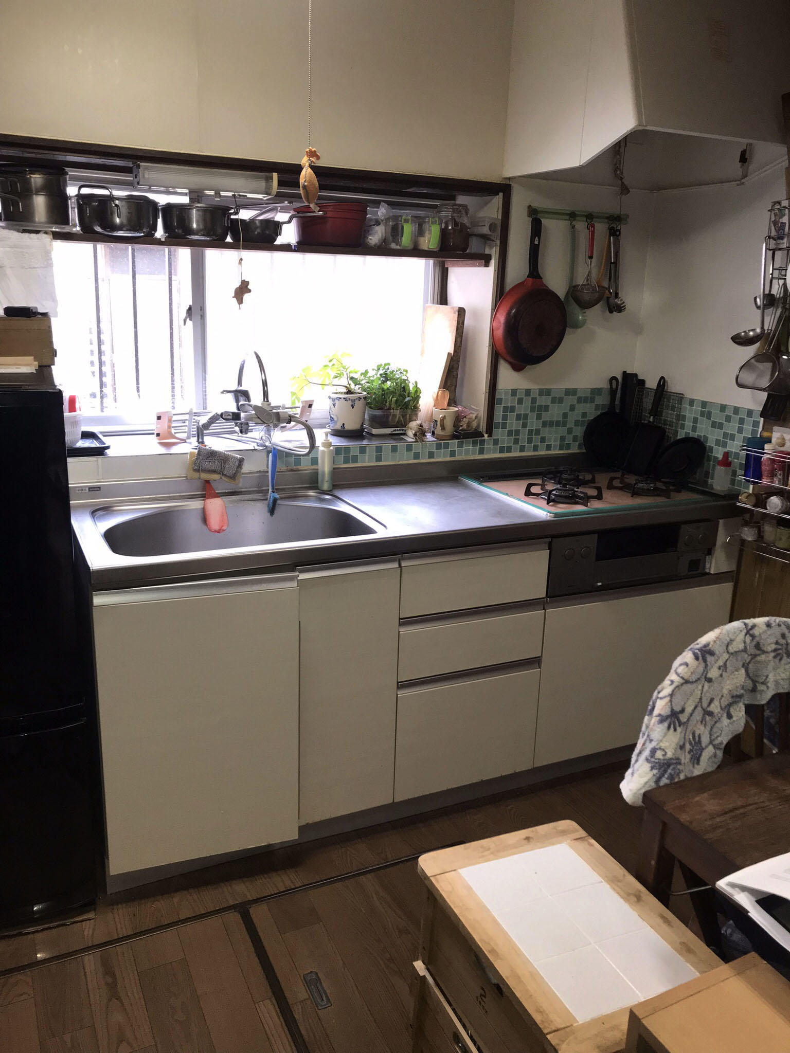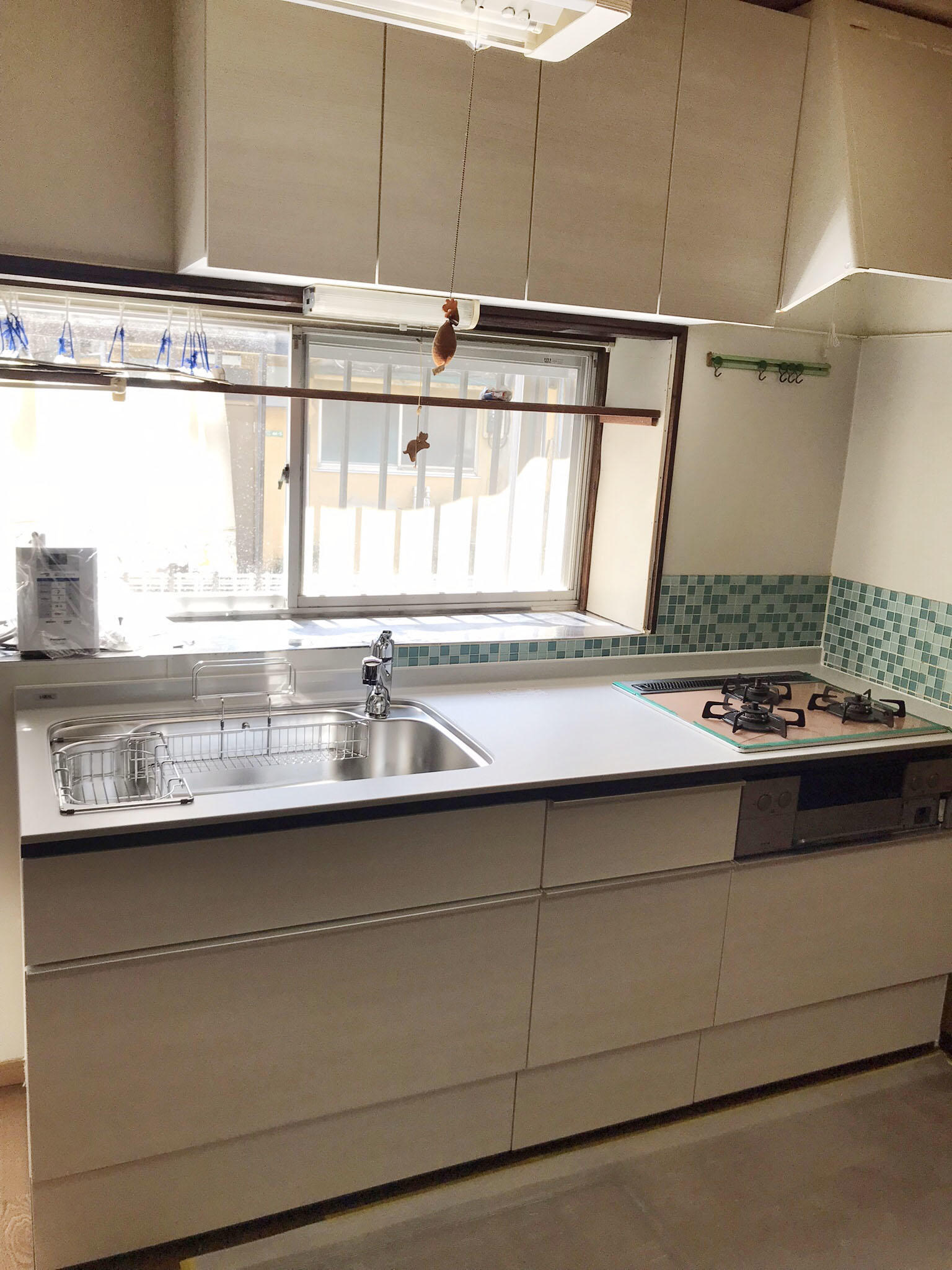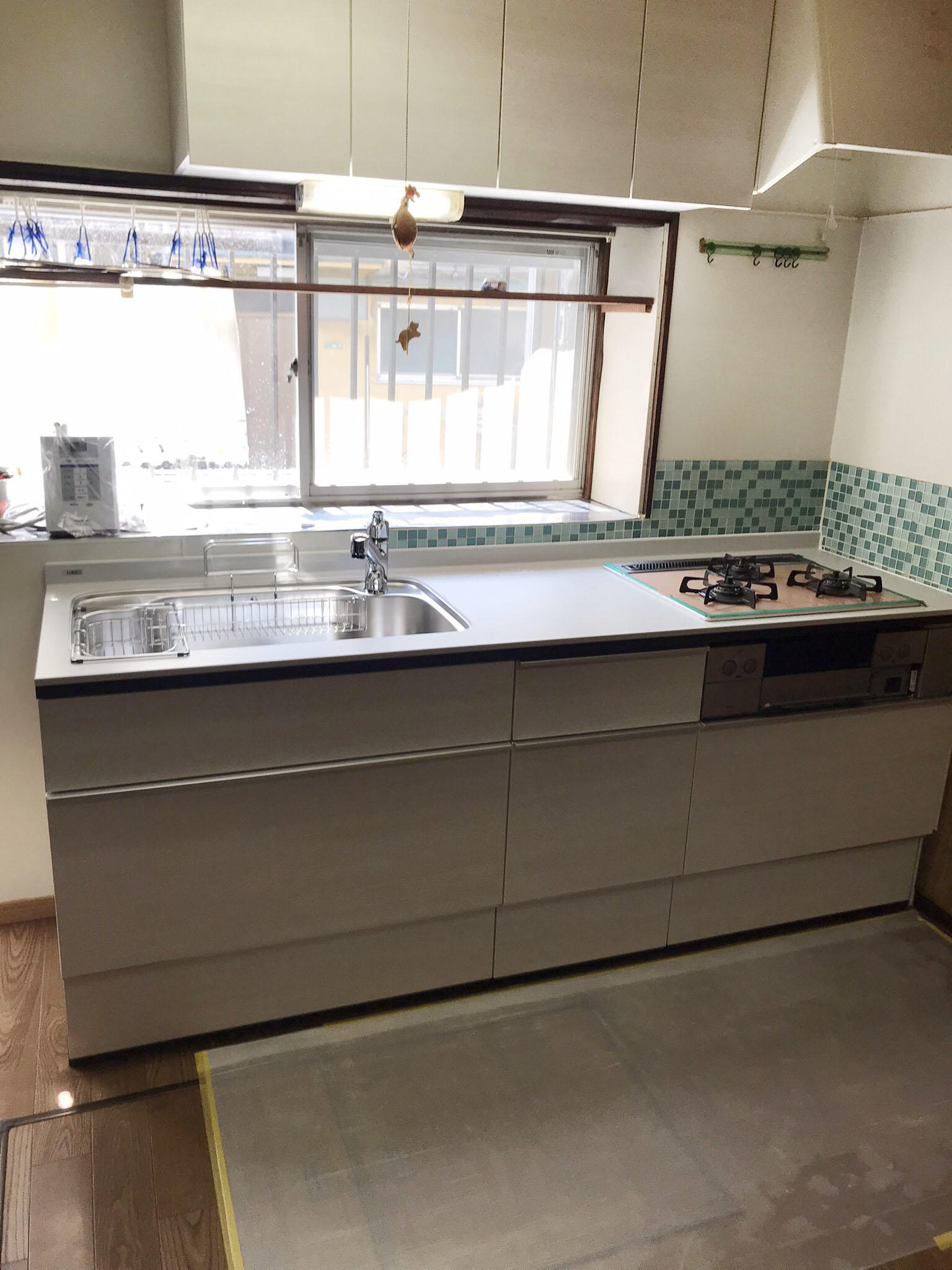 古くなり、新しいキッチンに変えてスッキリとさせたかったからとの事でご依頼いただきました。 吊り戸棚、レンジフード、ガスコンロはそのままの仕様でコストを抑えました。