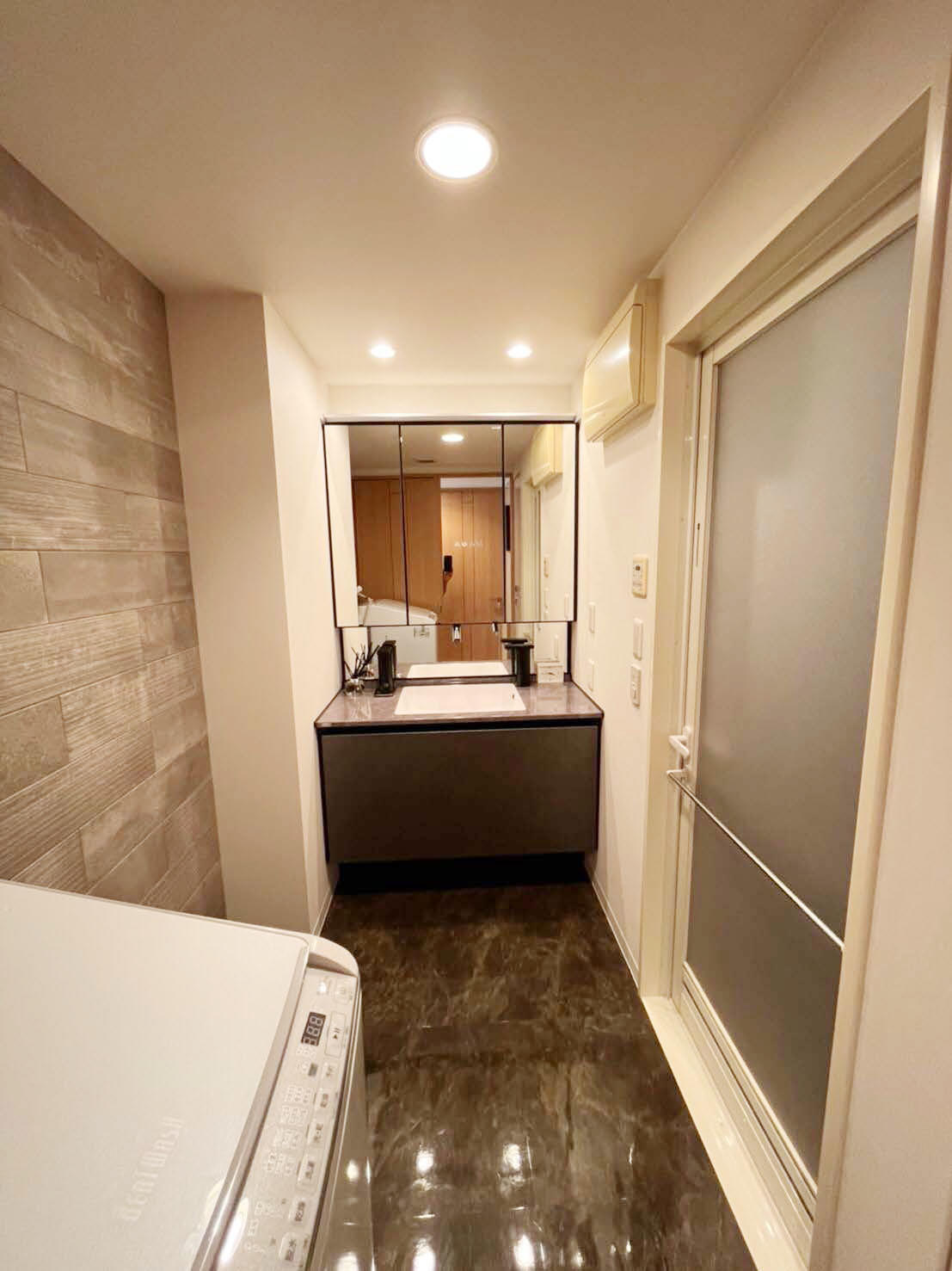 LIXIL ルミシス ボウル一体タイプミラーキャビネットはライン照明を採用してミラー部が大きくなりスッキリ見えます。カウンターは素材の魅力を伝える繊細で深みのある質感のラピシアカウンターを採用しています。水栓金具は自動水栓のタッチレス水栓を採用しています。